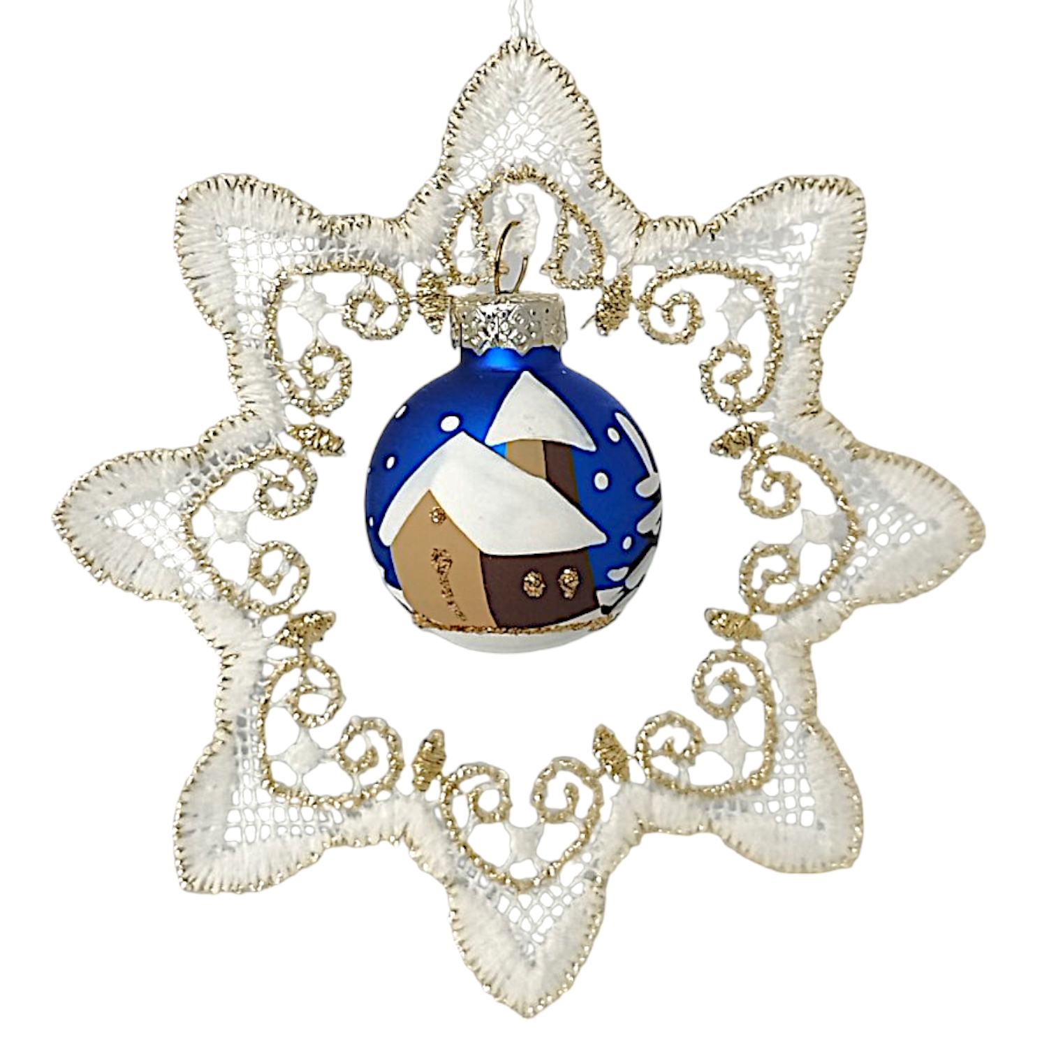 Im Zentrum des Sterns hängt eine kleine, blaue Christbaumkugel mit einem Durchmesser von circa 3 cm. Die Handbemalung macht jede Kugel zu einem Unikat, das mit viel Liebe und Feingefühl für die festliche Jahreszeit gestaltet wurde. Das Motiv strahlt durch die Kombination von Weiß, blau und Gold eine warme und traditionelle Weihnachtsstimmung aus. Die detailreichen Malereien der verschneiten Landschaft erzeugen eine besinnliche Atmosphäre, die den Zauber der Weihnachtszeit widerspiegelt.