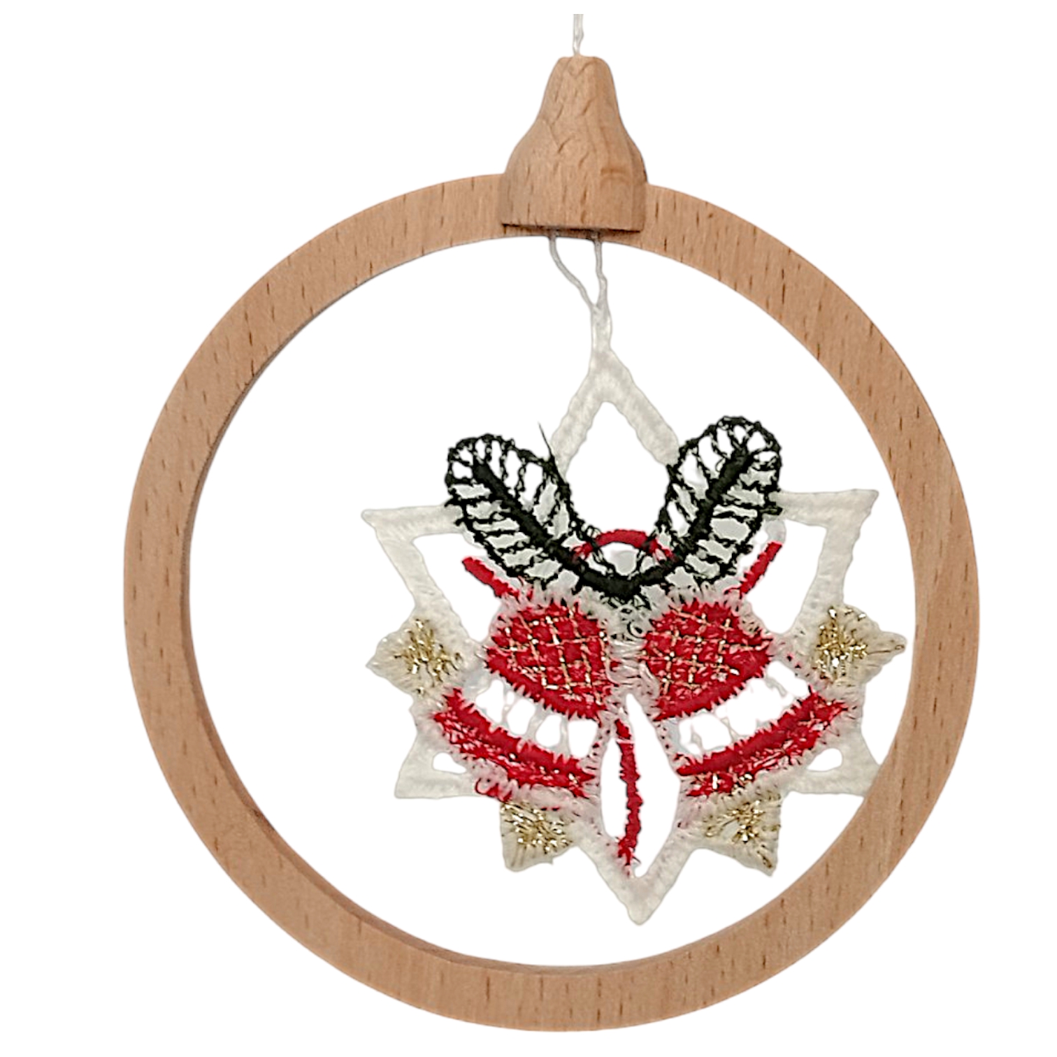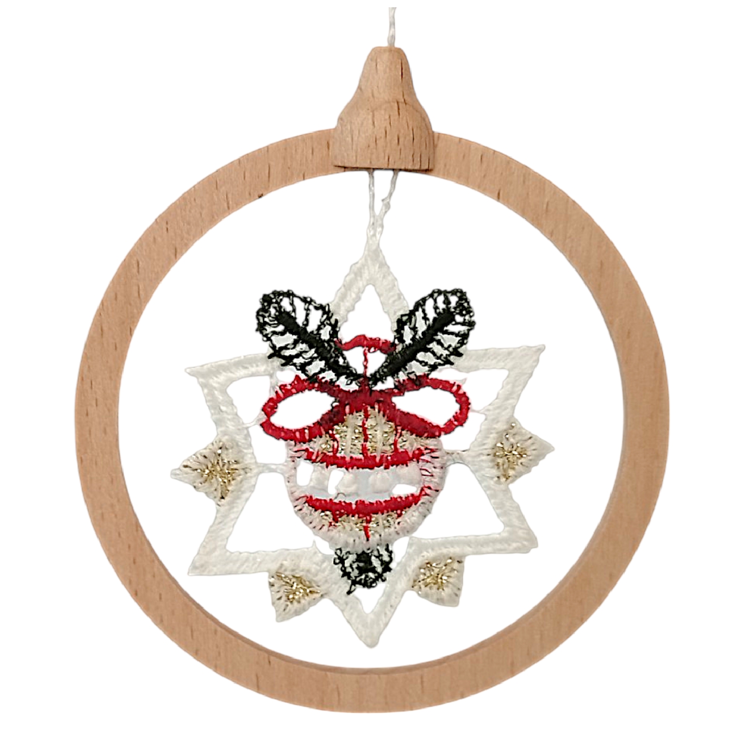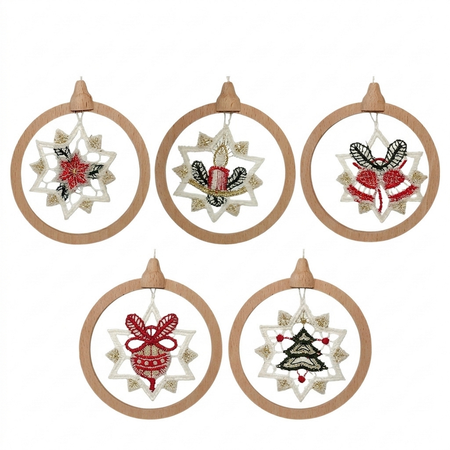 Jedes einzelne Schmuckstück mit einem Durchmesser von 8,5 cm besticht durch das Zusammenspiel von Naturmaterialien sowie feinster Handwerkskunst. Die detailreichen Stickereien in klassischen Festtagsfarben wie tiefem Rot, sattem Grün und edlen Goldakzenten sind fest in einen schlichten Ring aus Echtholz gespannt. Dieser Rahmen verleiht der zarten Spitze die nötige Stabilität für das Aufhängen und sorgt gleichzeitig für eine hochwertige, bodenständige Anreizung. Durch das geringe Gewicht lassen sich die Anhänger mühelos an Tannenbäumen oder winterlichen Zweigen platzieren, ohne diese nach unten zu ziehen.