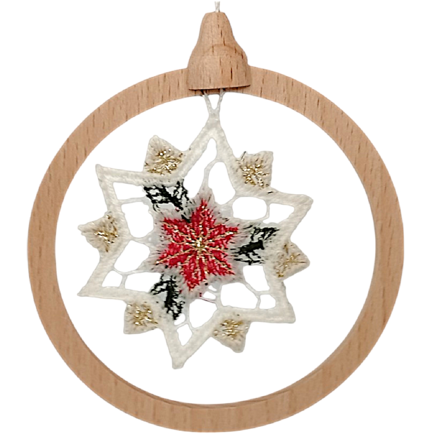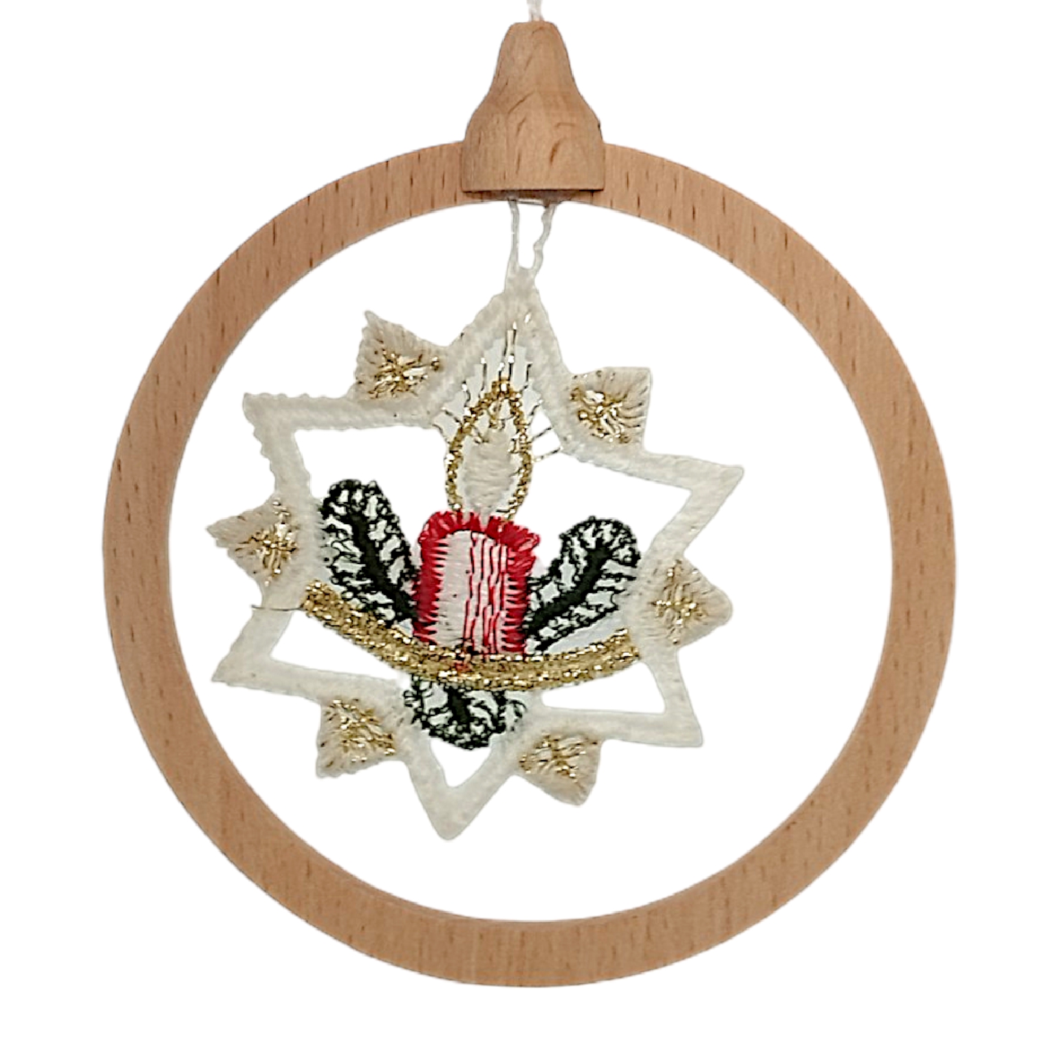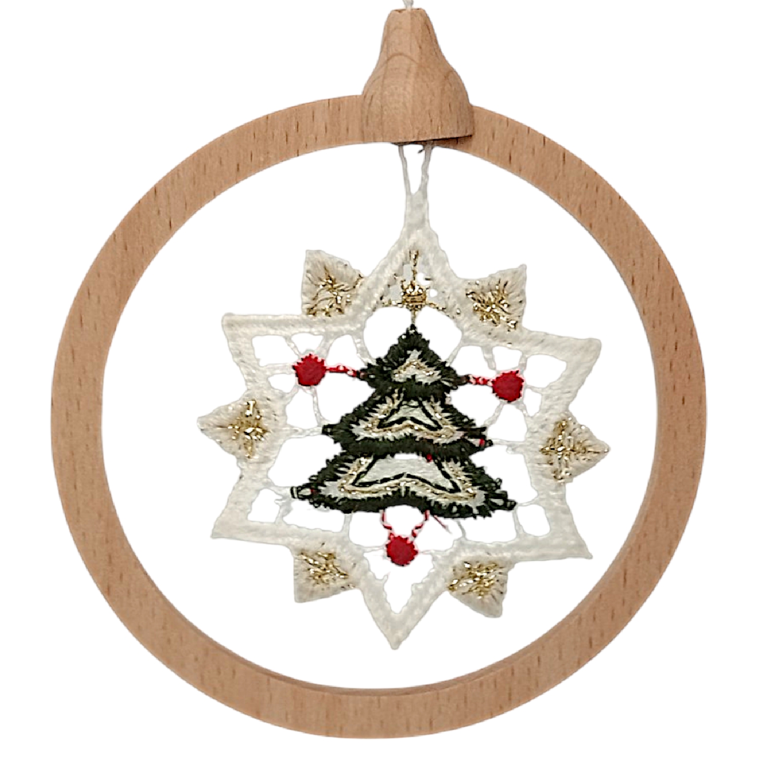 Jedes einzelne Schmuckstück mit einem Durchmesser von 8,5 cm besticht durch das Zusammenspiel von Naturmaterialien sowie feinster Handwerkskunst. Die detailreichen Stickereien in klassischen Festtagsfarben wie tiefem Rot, sattem Grün und edlen Goldakzenten sind fest in einen schlichten Ring aus Echtholz gespannt. Dieser Rahmen verleiht der zarten Spitze die nötige Stabilität für das Aufhängen und sorgt gleichzeitig für eine hochwertige, bodenständige Anreizung. Durch das geringe Gewicht lassen sich die Anhänger mühelos an Tannenbäumen oder winterlichen Zweigen platzieren, ohne diese nach unten zu ziehen.