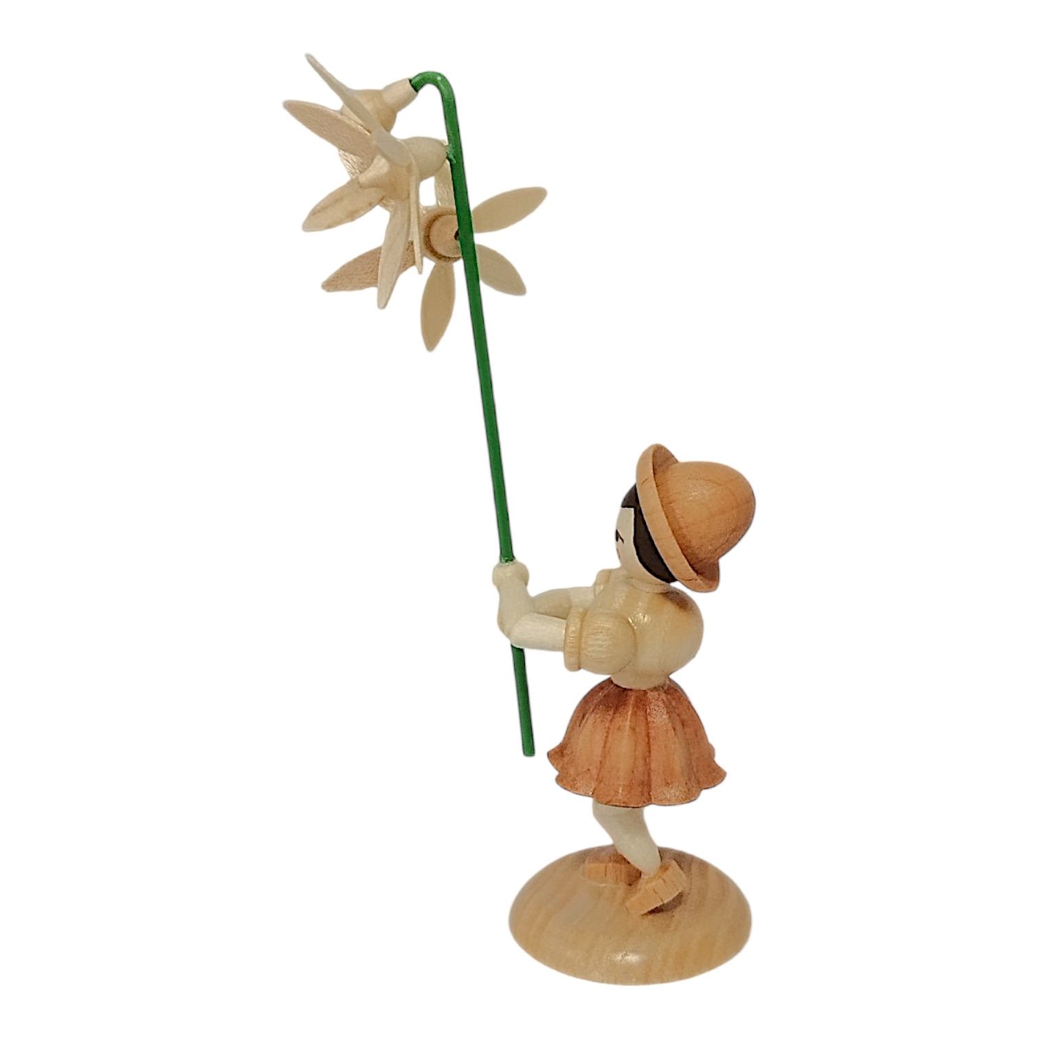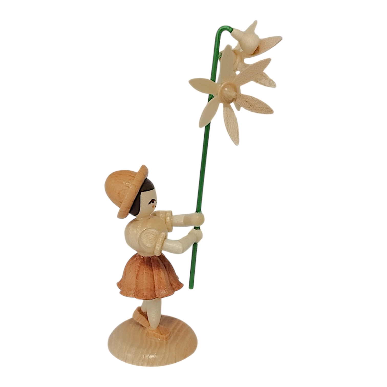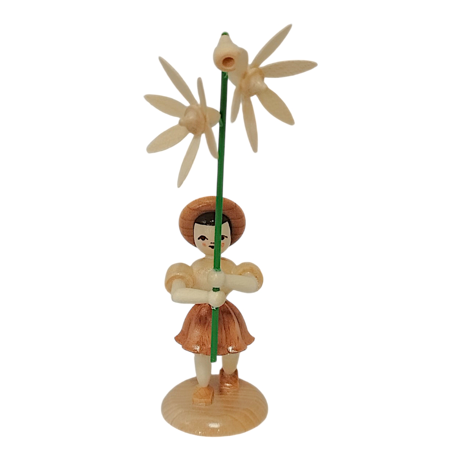 Besonders hervor sticht das charakteristische Faltenröckchen, welches Sammler weltweit bereits von der berühmten Engel-Serie kennen. Dieses Designmerkmal verbindet das Blumenkind optisch mit den klassischen Engelfiguren und unterstreicht die Handwerkskunst der Manufaktur. Die zierliche Figur hält zudem stolz einen filigran gearbeiteten Blaustern in ihren Händen. Obwohl die Blüte in dieser Variante ebenfalls im feinen Naturton erstrahlt, erkennen Betrachter sofort die botanische Inspiration hinter den präzise geschnitzten Blättern. Der lange, grüne Stiel setzt dabei einen dezenten Farbakzent, welcher den organischen Look perfekt ergänzt.