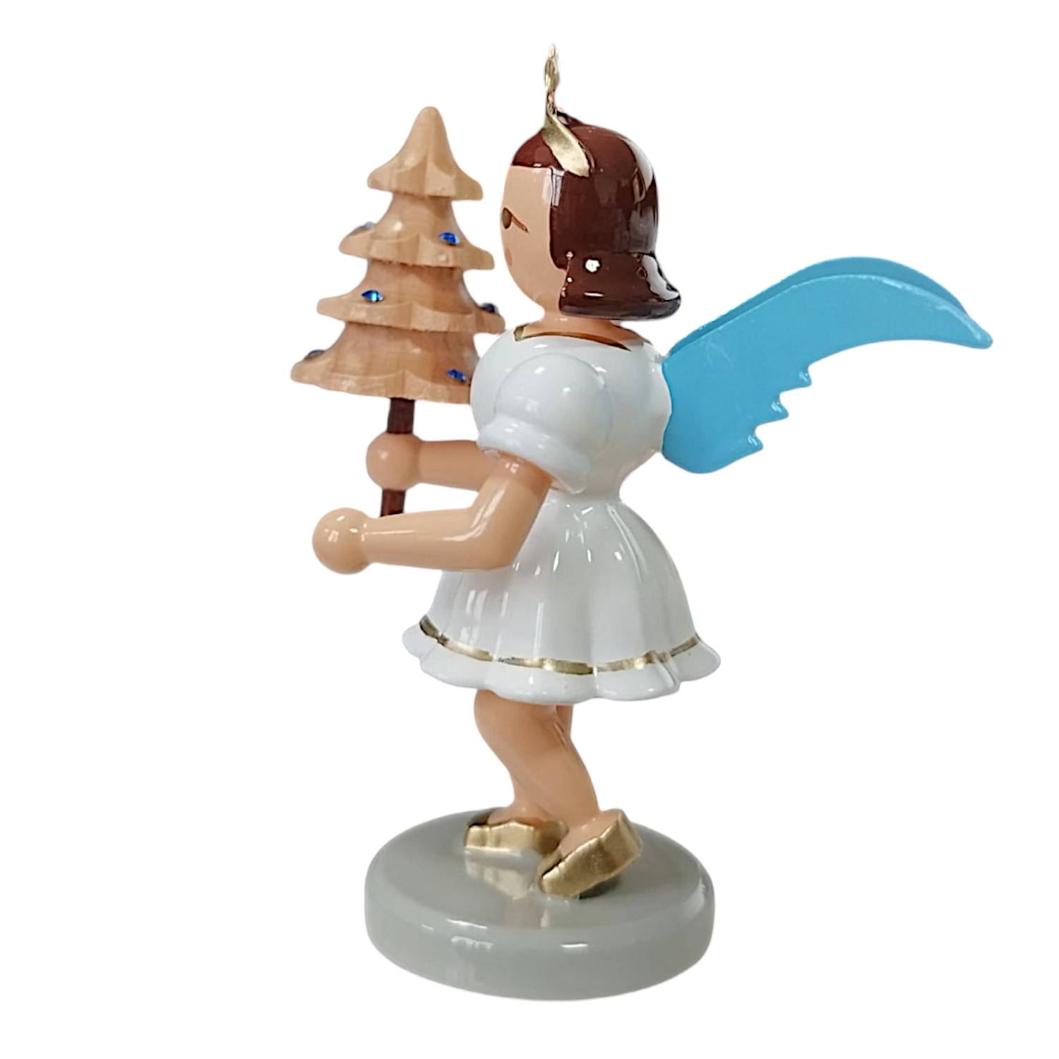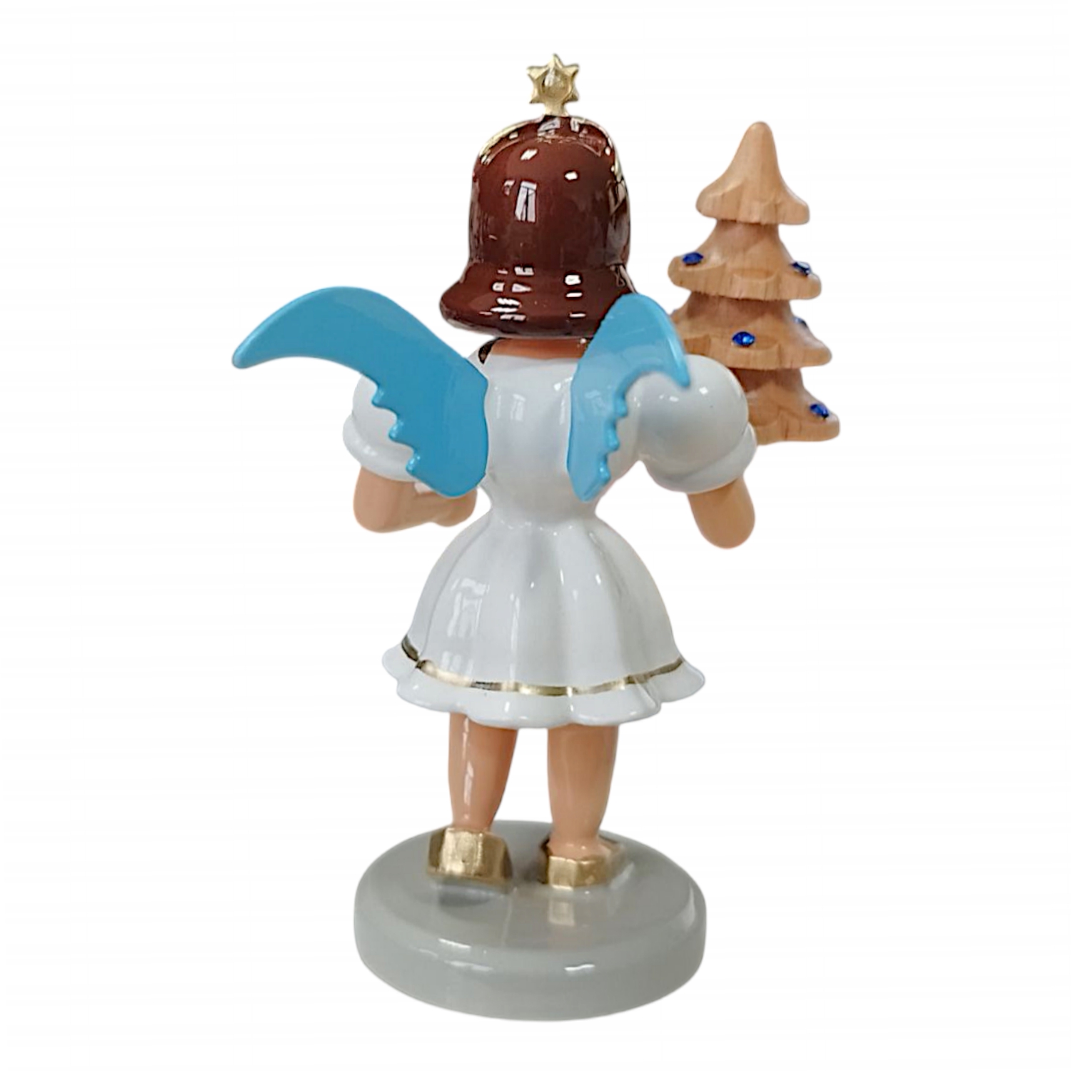 Der Engel trägt ein klassisches, weisses Kurzrockkleid, das durch handgemalte goldene Akzente veredelt wird. In seinen Händen hält er ein detailreich gearbeitetes Bäumchen, das mit hochwertigen Preciosa-Kristallen geschmückt ist. Diese Kristalle funkeln im Licht und erzeugen eine festliche Atmosphäre. Die Flügel des Engels leuchten in einem sanften Blau und verleihen der Figur eine himmlische Ausstrahlung. Ein kleiner goldener Stern auf dem Kopf des Engels ergänzt das Gesamtbild und setzt einen zusätzlichen Glanzpunkt.