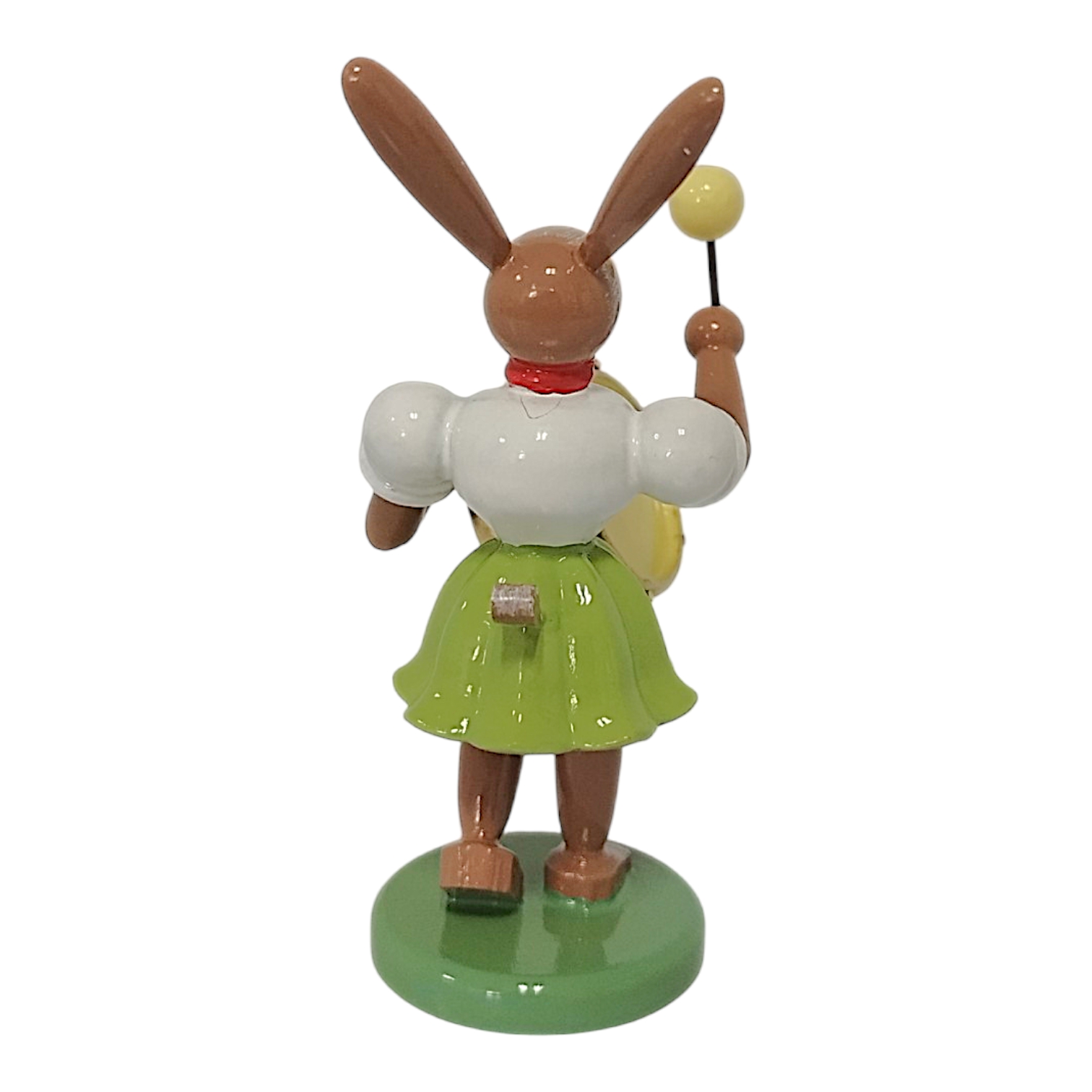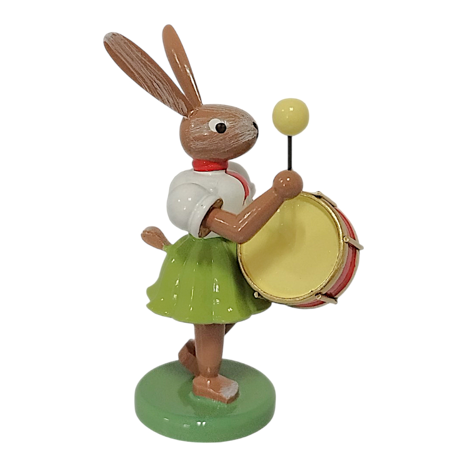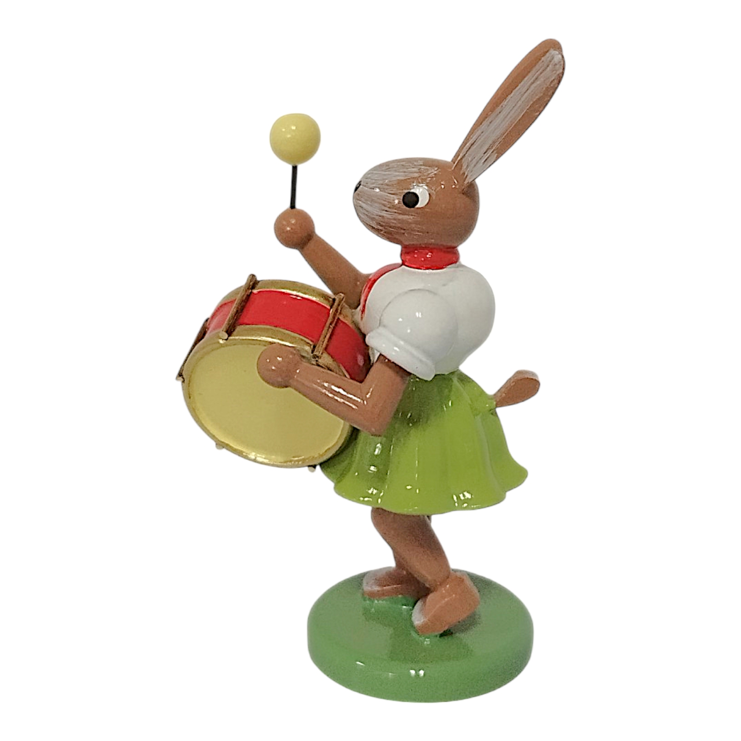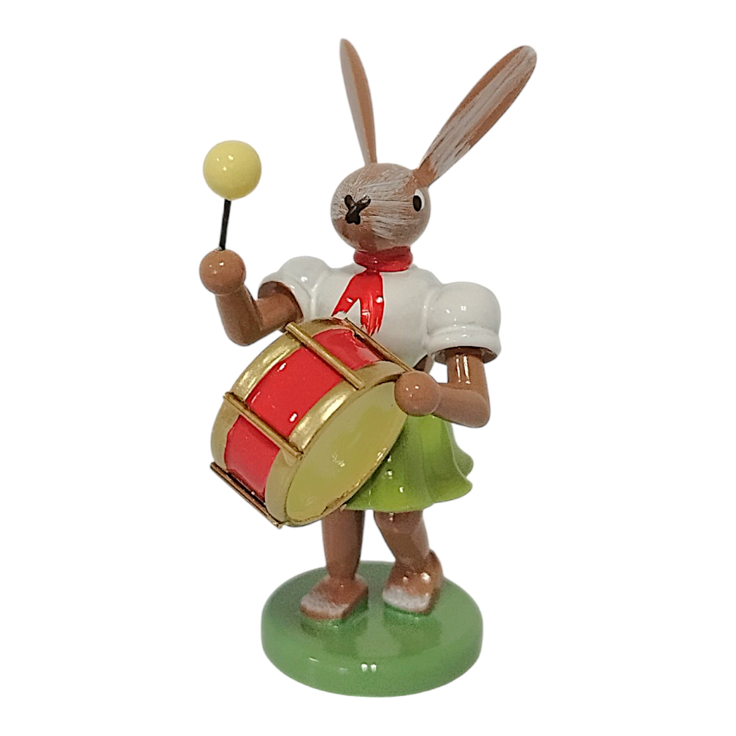 Besonders hervor sticht das charakteristische Faltenröckchen, welches Sammler weltweit bereits von der berühmten Engel-Serie kennen. In dieser Variante erstrahlt das Röckchen in einem frischen Maigrün, während das weiße Oberteil und das rote Halstuch einen klassischen Kontrast bilden. Dieses Designmerkmal verbindet den Osterhasen optisch mit den berühmten Engelfiguren und unterstreicht die Handwerkskunst der Manufaktur. Der Hase hält stolz eine auffällige Pauke vor seinem braun lasierten Körper. Das Instrument besticht durch seinen leuchtend roten Kessel und die goldfarbenen Reifen, die im Licht edel schimmern. In der rechten Pfote schwingt der Hase einen Schlägel mit gelbem Kopf, was der Szenerie eine herrliche Dynamik verleiht.