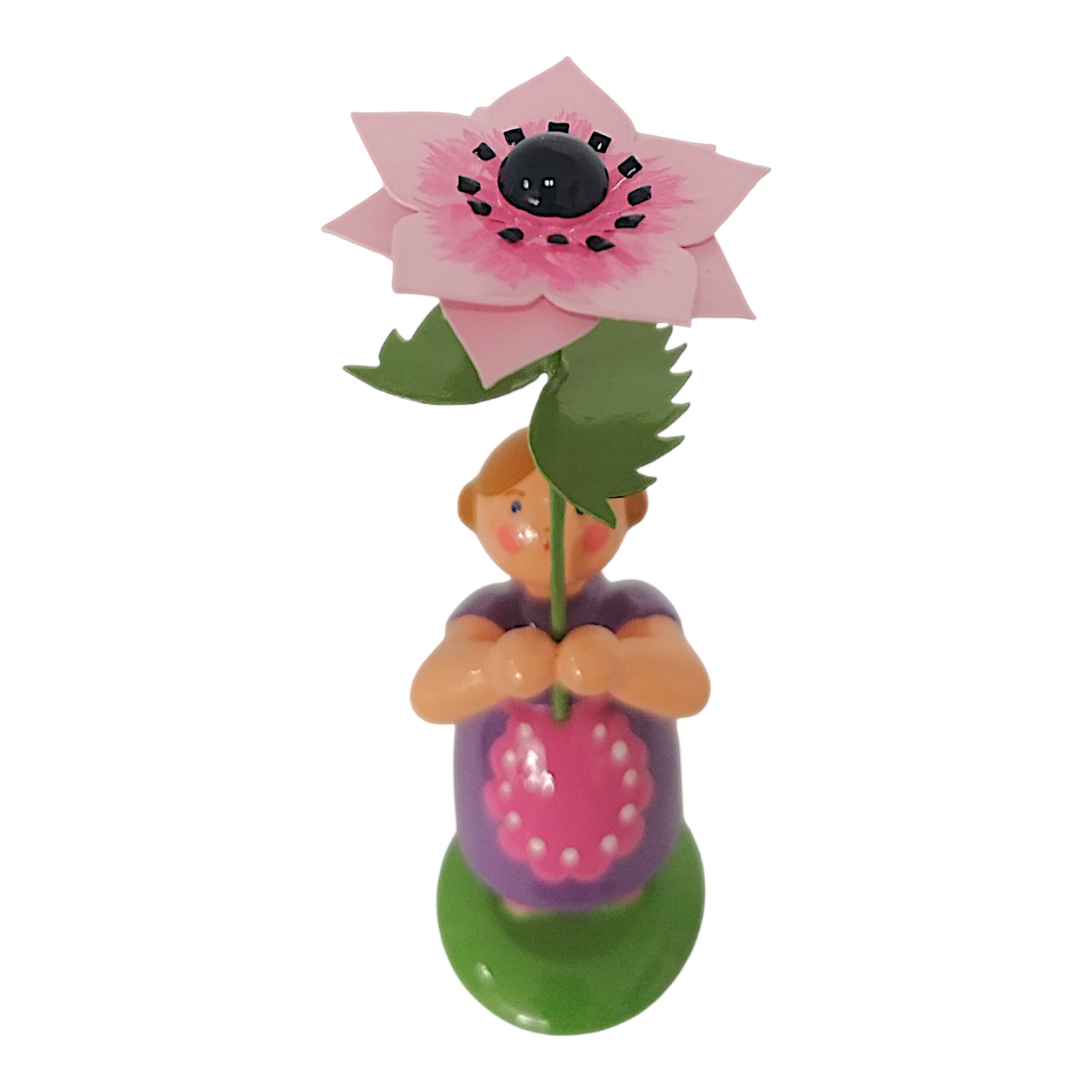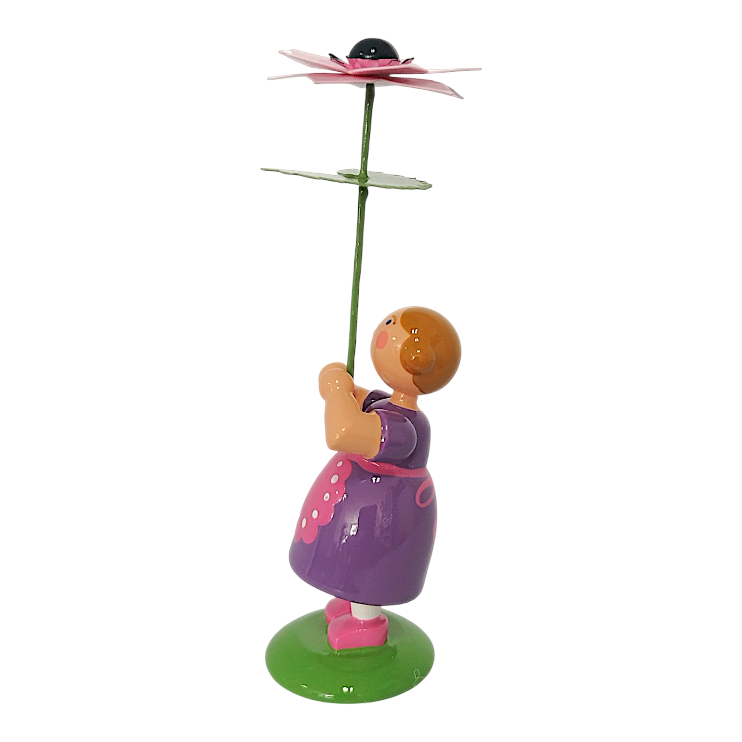 In einem kräftigen violetten Kleid mit einer rosafarbenen, weiß gepunkteten Schürze zaubert dieses Blumenmädchen frühlingshafte Frische in jedes Zuhause. In den Händen hält es eine prachtvolle, rosa Anemone mit dunkler Mitte, deren langer grüner Stiel und die fein gezackten Blätter die filigrane Handwerkskunst unterstreichen. Das freundliche Gesicht des kleinen Mädchens mit den rosa Wangen, den blauen Augen sowie dem roten Mund wird detailreich von Hand aufgemalt. Die braunen Haare des Blumenkindes sind seitlich zu zwei charakteristischen Haarschnecken eingedreht, während das Mädchen sicher auf einem grasgrünen Sockel steht.