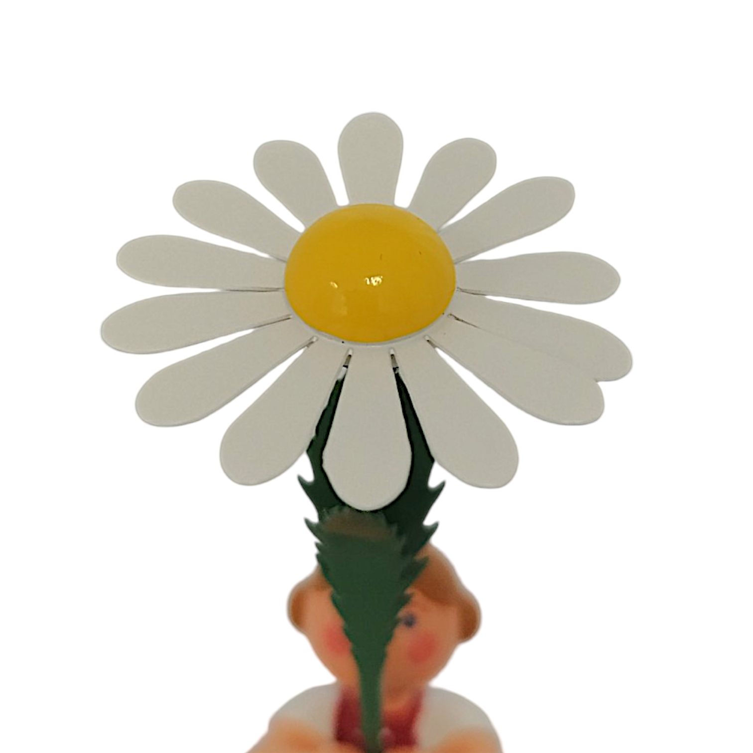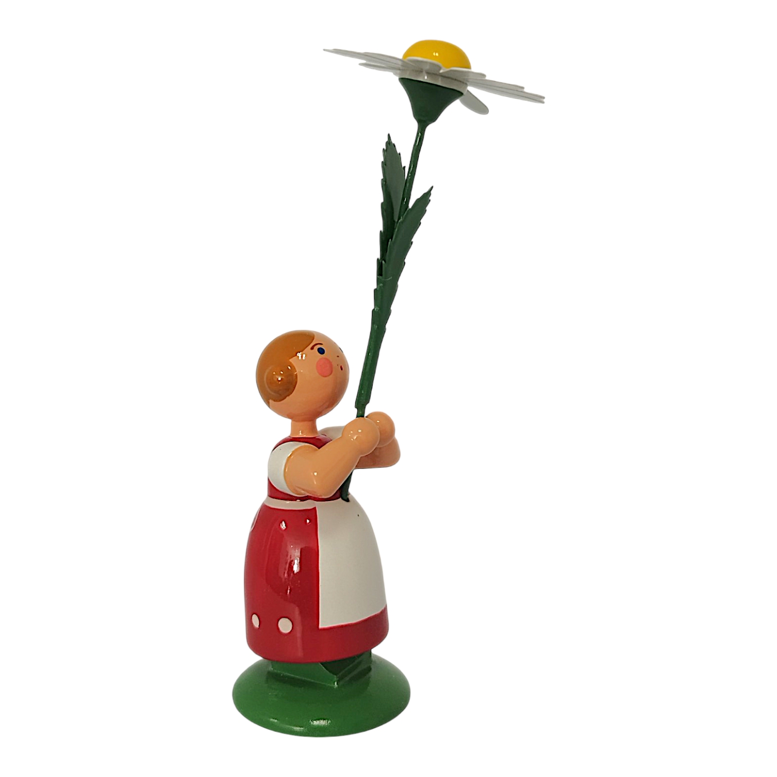 In einem kräftigen roten Dirndlkleid mit weißer Bluse und einer strahlend weißen Schürze zaubert dieses Blumenmädchen fröhliche Sommerstimmung in jedes Zuhause. In den Händen hält es eine riesige, strahlend weiße Margarite mit leuchtend gelber Mitte, deren langer grüner Stiel und die detailgetreu gezackten Blätter die filigrane Handwerkskunst unterstreichen. Das freundliche Gesicht des kleinen Mädchens mit den rosa Wangen, den wachen blauen Augen sowie dem roten Mund wird detailreich von Hand aufgemalt. Die hellbraunen Haare des Blumenkindes sind seitlich zu zwei kleinen, charmanten Haarschnecken eingedreht, während das Mädchen sicher auf einem sattgrünen Sockel steht, der an eine Sommerwiese erinnert.