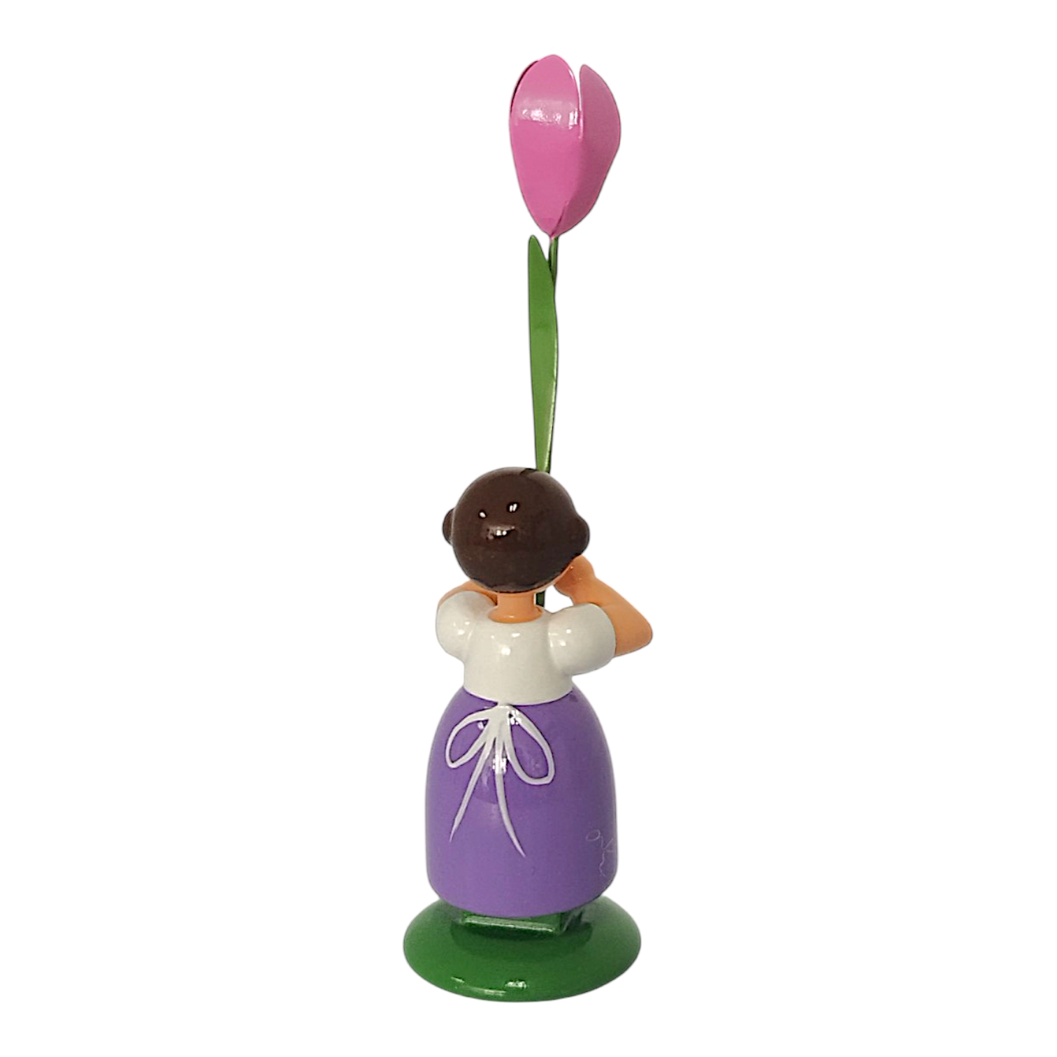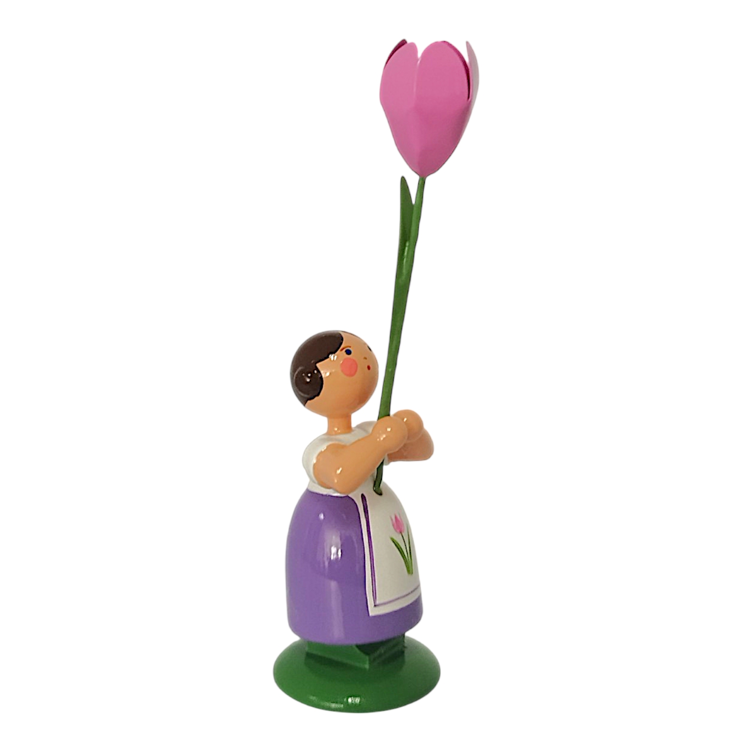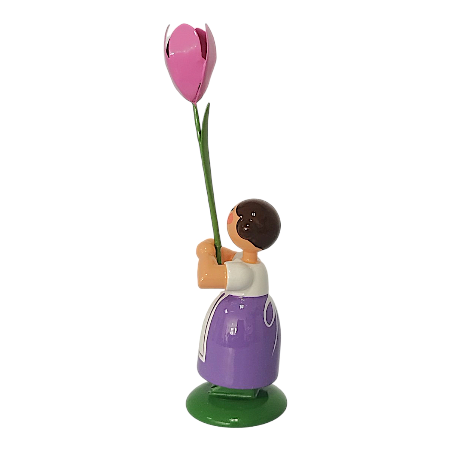 Das Mädchen trägt ein kräftiges violettes Kleid, worüber sie eine strahlend weiße Schürze gebunden hat, wobei eine kleine, zarte rosa Tulpe die Mitte der Schürze verziert. In ihren Händen hält sie stolz eine prachtvolle, hochgewachsene rosa Tulpe. Die Blüte leuchtet in einem kräftigen Rosa, während der lange grüne Stiel die Liebe zum Detail unterstreicht. Jan Legler bemalt das freundliche Gesicht mit den rosa Wangen, den blauen Augen und dem roten Mund vollständig von Hand. Die dunkelbraunen Haare drehen sich seitlich zu zwei typischen Haarschnecken ein und das Kind steht zudem sicher auf einem sattgrünen Sockel.