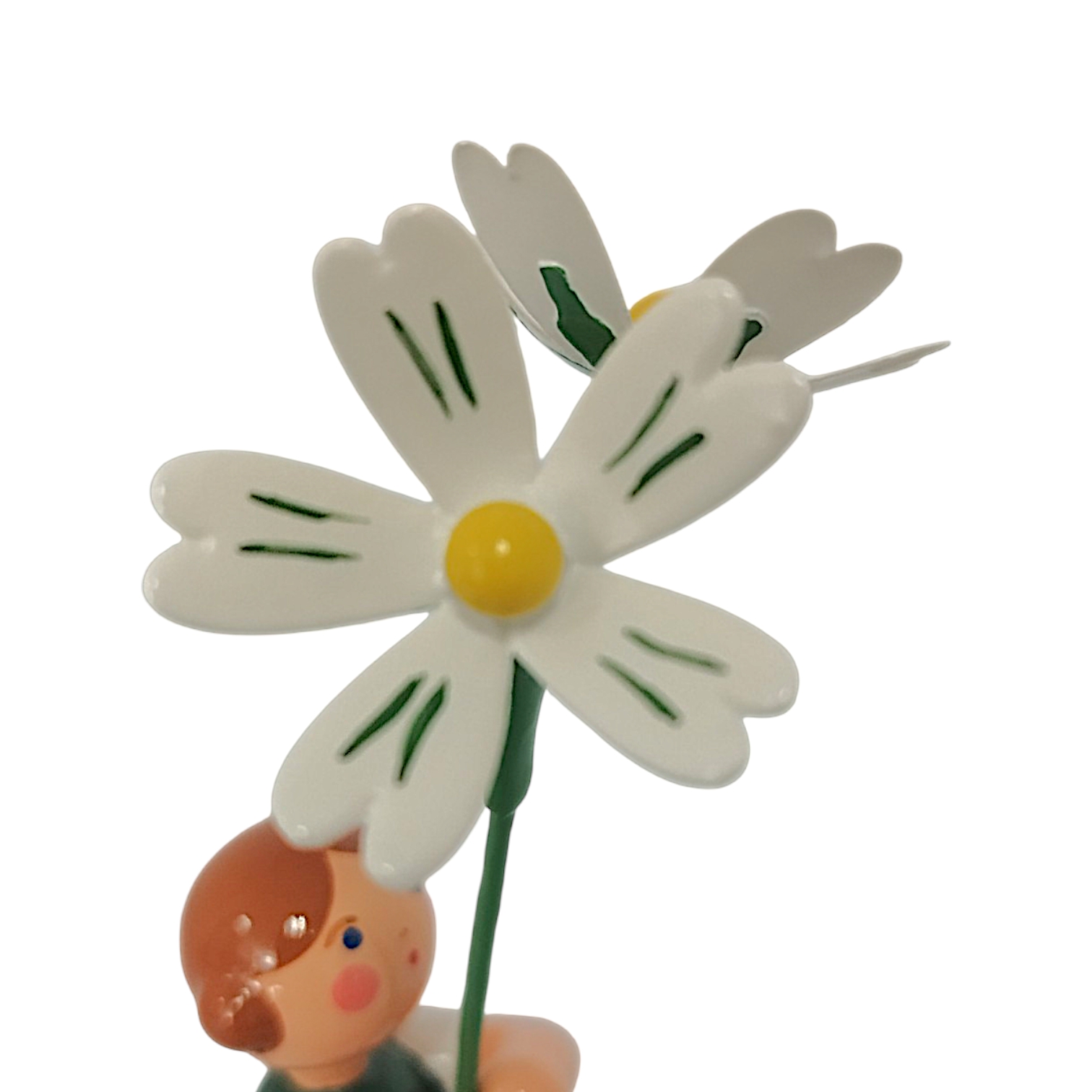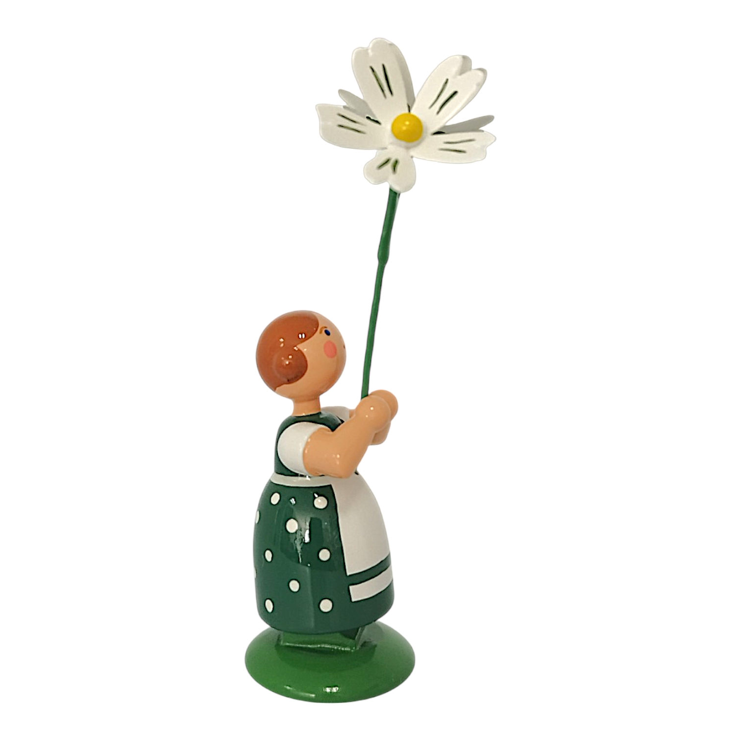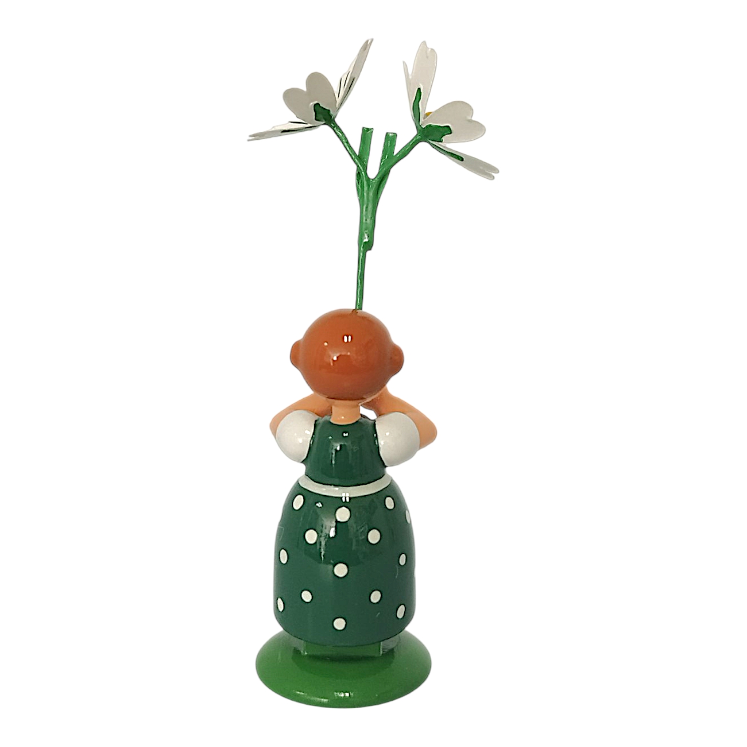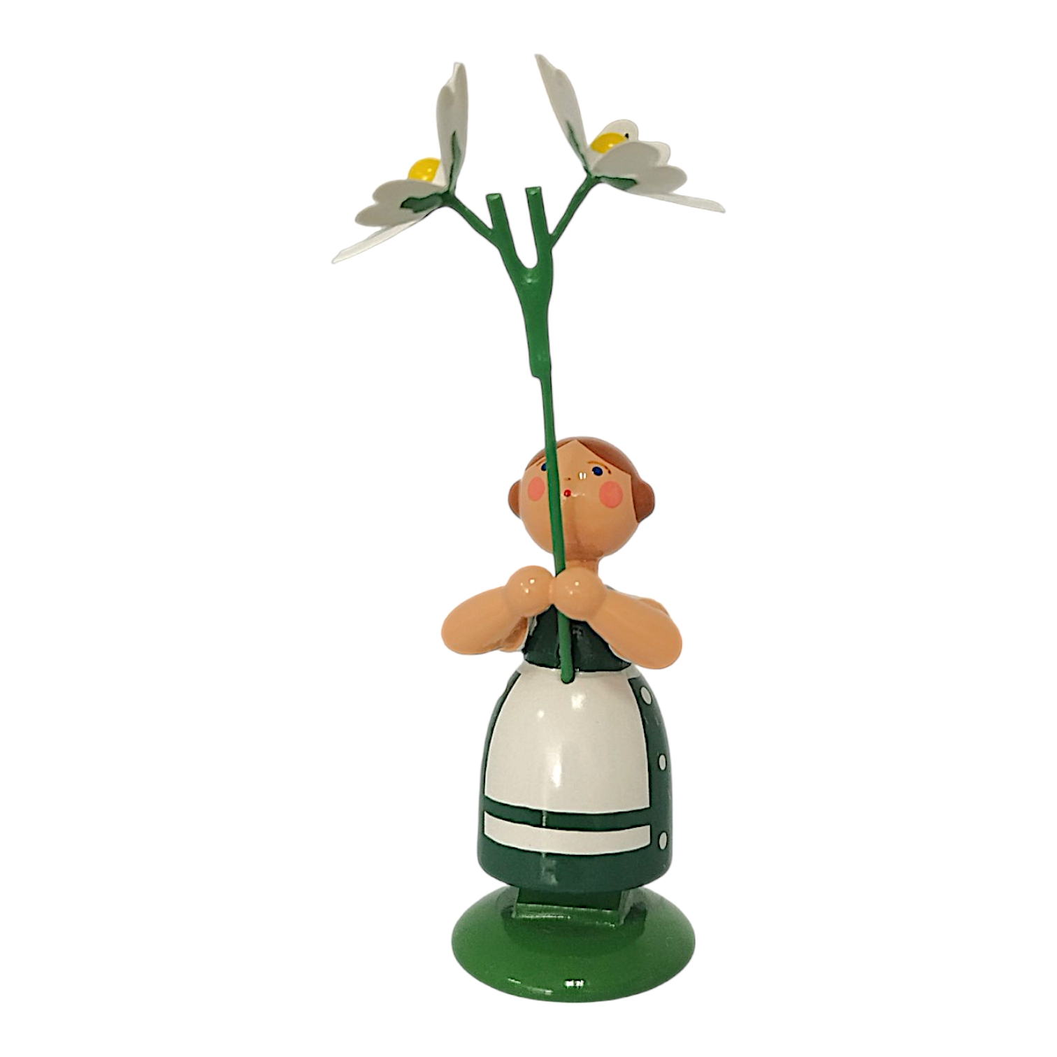 In einem kräftigen dunkelgrünen Kleid mit weißen Punkten sowie einer strahlend weißen Schürze zaubert dieses Blumenmädchen frühlingshafte Frische in jedes Zuhause. In den Händen hält es zwei zarte, weiße Blüten der Sternmiere mit leuchtend gelber Mitte, deren filigrane grüne Stängel die detailgetreue Handwerkskunst unterstreichen. Das freundliche Gesicht des kleinen Mädchens mit den rosa Wangen, den wachen blauen Augen sowie dem roten Mund wird detailreich von Hand aufgemalt. Die braunen Haare des Blumenkindes sind seitlich zu zwei charakteristischen Haarschnecken eingedreht, während das Mädchen sicher auf einem sattgrünen Sockel steht, der an eine Frühlingswiese erinnert.