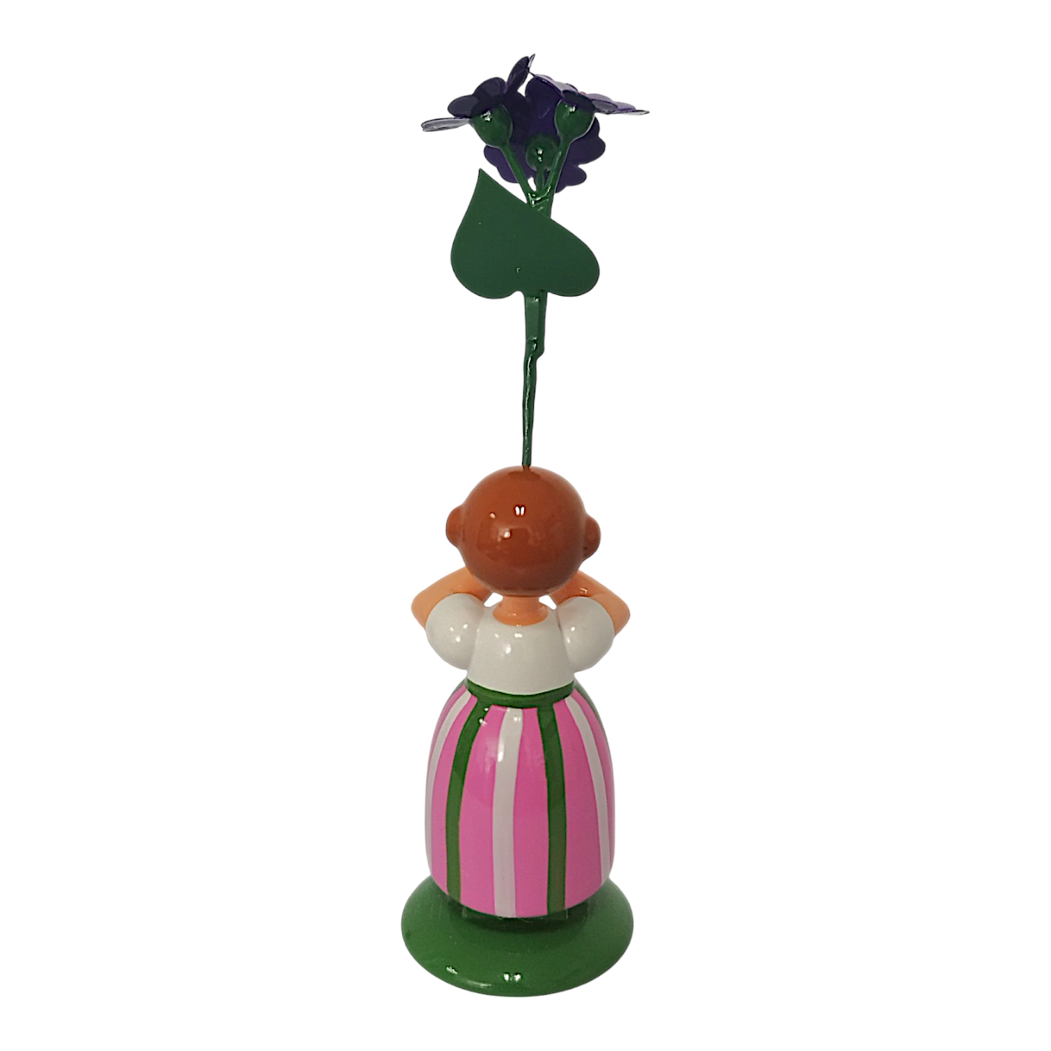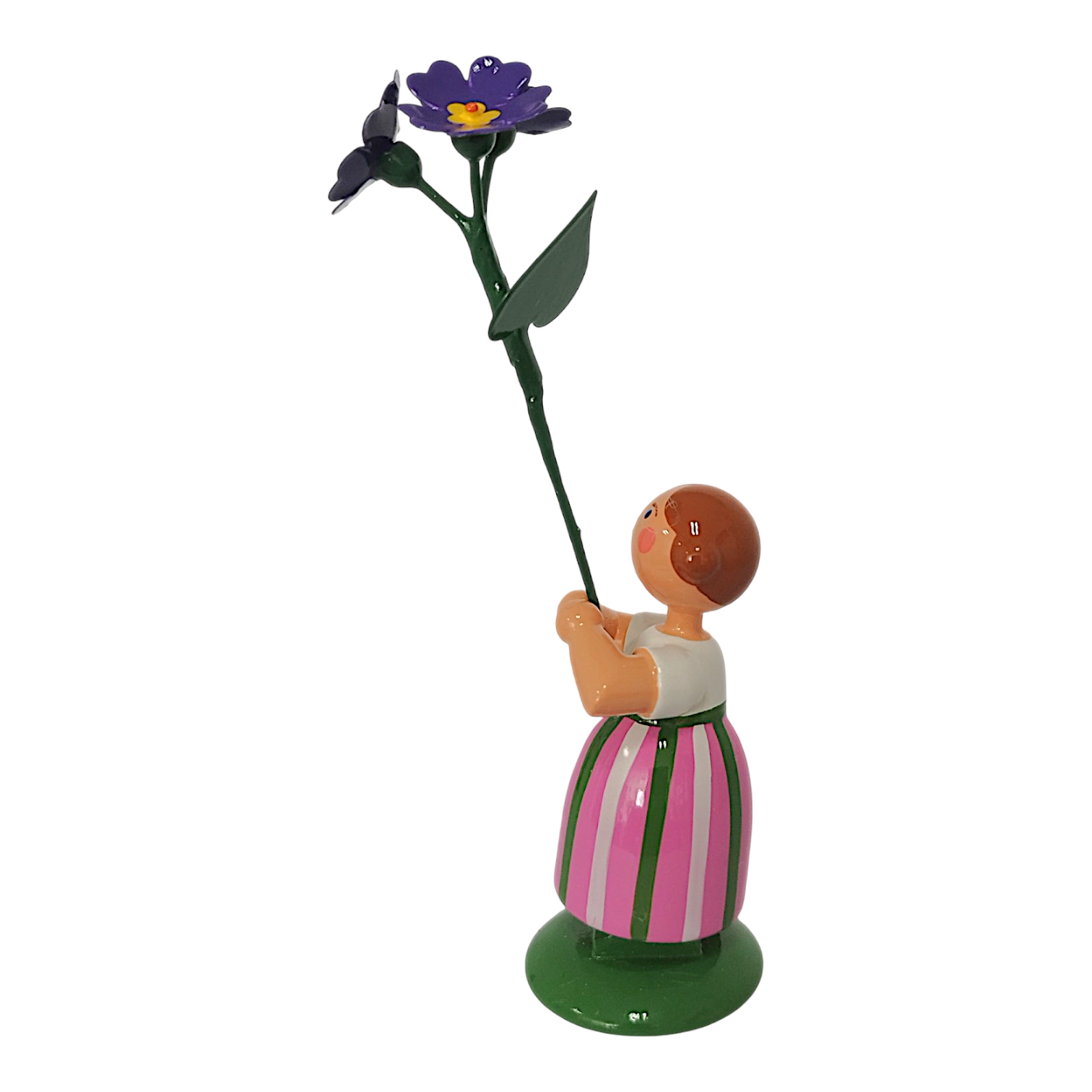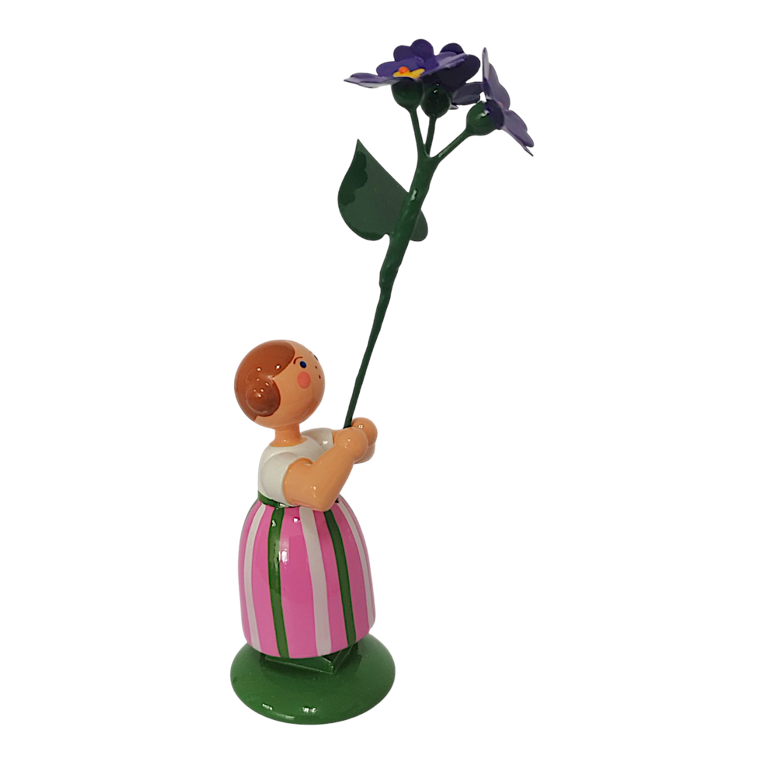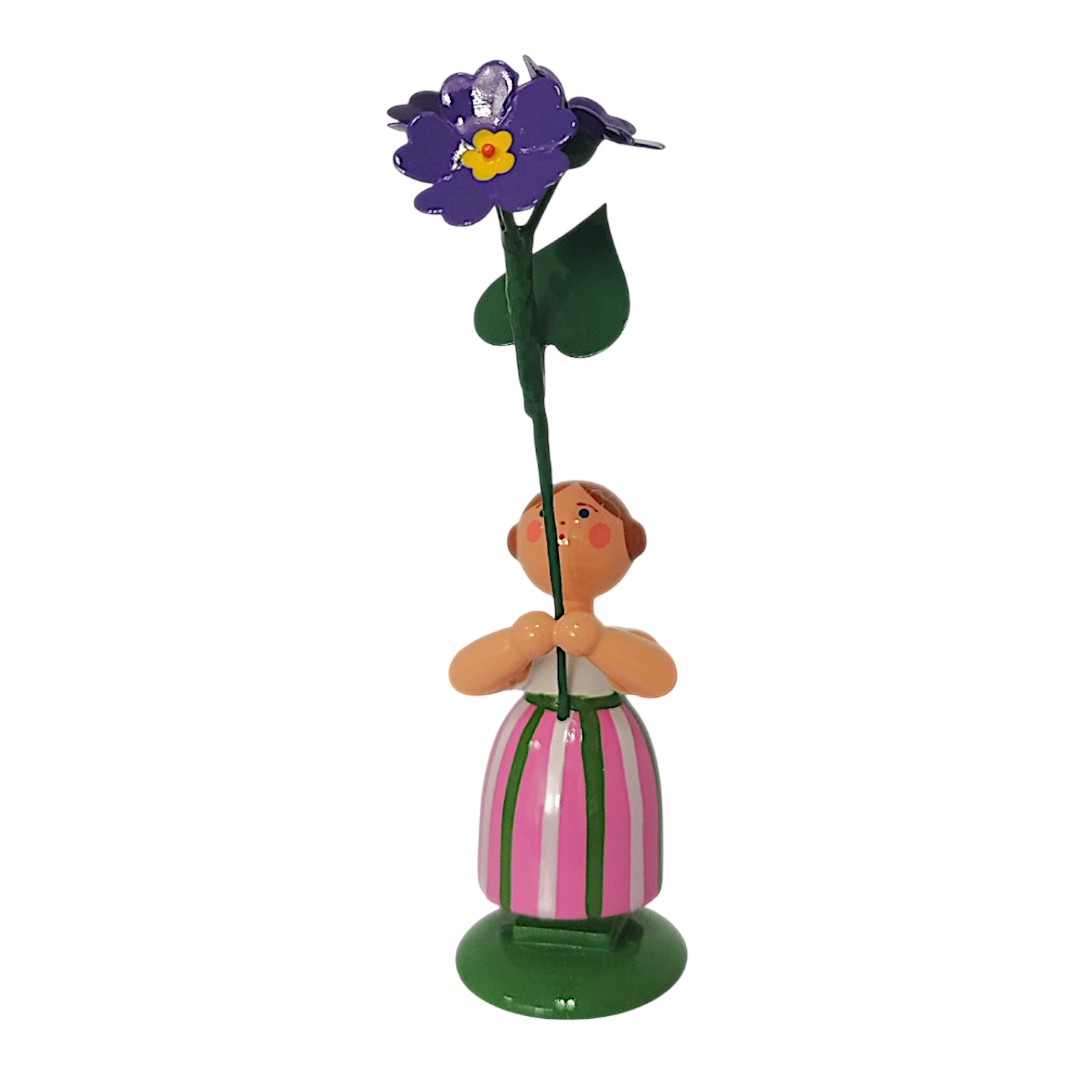 Das Mädchen trägt einen Rock mit rosa und weißen Längsstreifen, der durch grüne Bänder zusätzlich betont wird, sowie eine schlichte weiße Bluse. In ihren Händen hält sie stolz eine prachtvolle, violette Primel. Die Blüte besitzt eine leuchtend gelbe Mitte, während der lange grüne Stiel und das herzförmige Blatt die Liebe zum Detail unterstreichen. Jan Legler bemalt das freundliche Gesicht mit den rosa Wangen, den blauen Augen und dem roten Mund vollständig von Hand. Die hellbraunen Haare drehen sich seitlich zu zwei typischen Haarschnecken ein und das Kind steht zudem sicher auf einem sattgrünen Sockel.