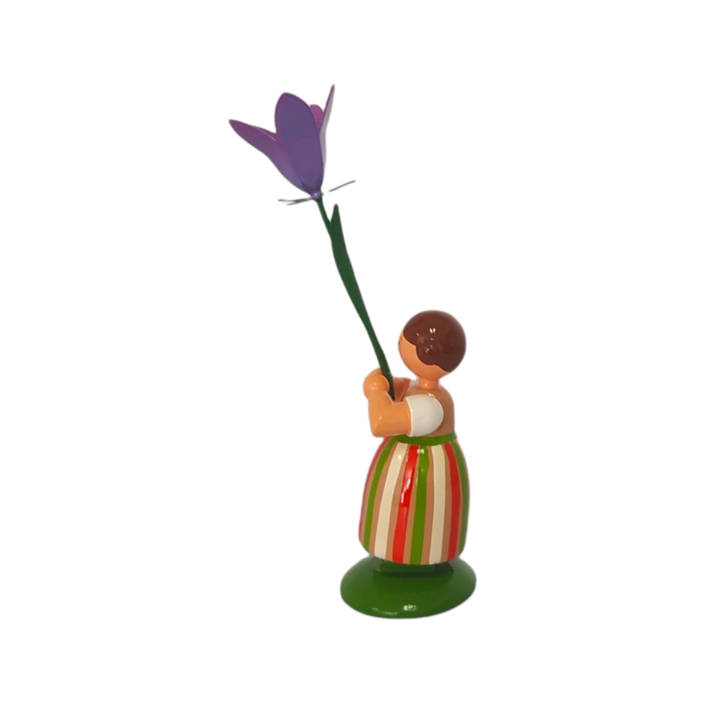 In einem fröhlichen bunt gestreiften Rock sowie einer weißen Bluse zaubert dieses Blumenmädchen Sonnenschein in jedes Zuhause, in Hand hält es eine große lilafarbene Wiesenglockenblume. Das freundliche Gesicht des kleinen Mädchen mit den rosa Wangen, den blauen Augen sowie dem roten Mund wird detailreich von Hand aufgemalt, die braunen Haare des Blumenkindes sind seitlich zu 2 Haarschnecken eingedreht.