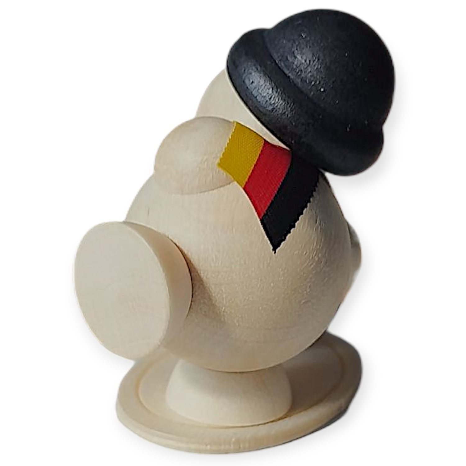 Die Haltung der Figur drückt Dynamik und Spielfreude aus, denn der Schneemann balanciert geschickt auf einem Bein und lehnt sich leicht nach vorne. Das charakteristische Design spiegelt die Kreativität von Karsten Braune wider. Durch die vollständige Handarbeit erhält jedes Exemplar einen einmaligen Ausdruck und kleine Variationen in Details.