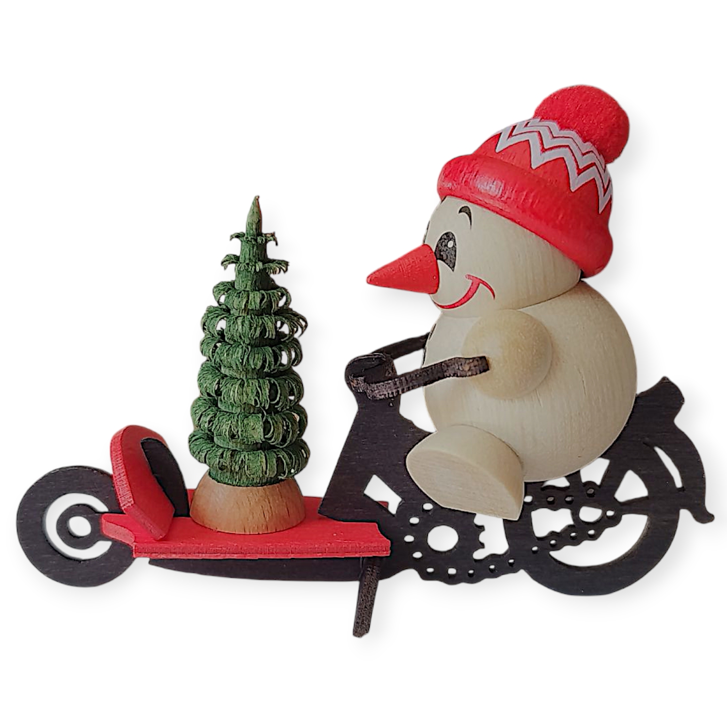 Ein echtes Highlight bildet das schwarze Lastenrad, auf dem der Schneemann sicher Platz nimmt. Mit kräftigen Händen hält er den Lenker und transportiert geschickt eine kleine, grün geflochtene Weihnachtsbaum-Miniatur. Diese Sonderladung betont das winterlich-festliche Flair und macht die Figur zu einem einzigartigen Blickfang. Besonders auffällig wirkt der Kontrast aus dunklem Rad, roter Ladefläche und hellem Naturholz. So entsteht ein harmonisches Zusammenspiel, das sofort ins Auge fällt.