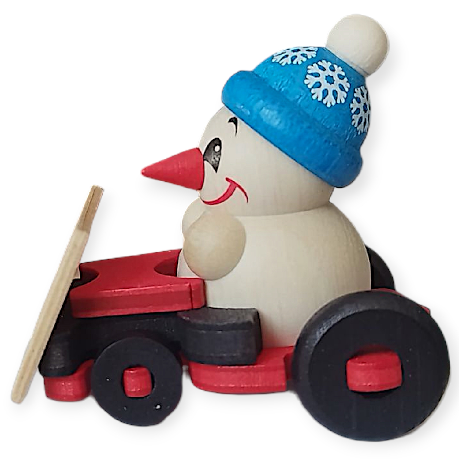 Der Cool Man Winterdienst von Karsten Braune überzeugt sofort durch sein fröhliches und originelles Design. Die Figur besteht aus hochwertigem Holz, das sorgfältig verarbeitet und bemalt ist. Im Mittelpunkt steht ein lächelnder Schneemann mit einem leuchtend roten Schal, einer knallblauen Mütze mit Schnee-Flocken-Muster sowie einem markanten roten Bobble. Seine großen schwarzen Augen und das breite Grinsen verleihen ihm eine sympathische und lebensfrohe Ausstrahlung. Er sitzt in einem kleinen, rot-schwarzen Winterdienst-Fahrzeug und hält einen weißen Schneeschieber fest in der Hand. Die Räder wirken robust und sorgen dafür, dass er bereit für den nächsten Einsatz im Schneegestöber erscheint.