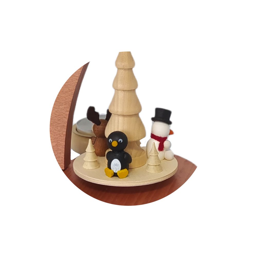 Auf der Pyramide sitzen ein kugeliger Schneemann, ein süßer Pinguin sowie ein braunes Rentier mit roter Nase, die die winterliche Szenerie beleben. Die Achse, um welche sich diese farbigen Figuren drehen, wird von handelsüblichen Teelichtern betrieben. Die aufsteigende Wärme der Kerzen setzt dabei die filigranen Figuren in Bewegung und lässt sie ihre Runden drehen, was ein faszinierendes Spiel aus Licht und Schatten erzeugt. Eine elegant geschwungene Sternschnuppe bildet den oberen Bogen dieser hübschen Pyramide und verleiht ihr eine zauberhafte und verträumte Note. Die harmonische Kombination aus traditionellen Motiven und modernem Design macht diese Teelichtpyramide zu einem besonderen Blickfang und einem zeitlosen Dekorationsstück, das die Magie der Weihnachtszeit auf stilvolle Weise in jedes Zuhause bringt.