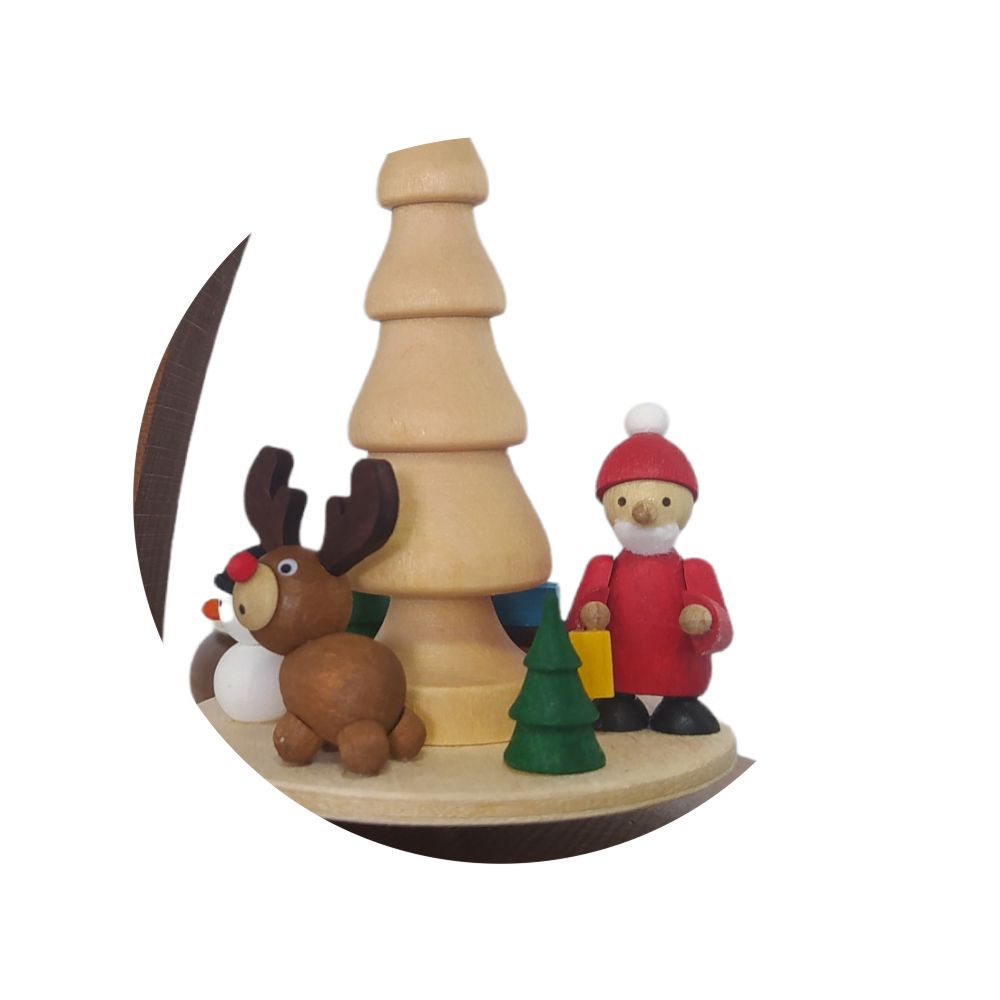 Die zentrale Achse, um die sich der freundliche Weihnachtsmann samt seinem Rentier mit der charakteristischen roten Nase sowie ein kugeliger Schneemann drehen, wird von handelsüblichen Teelichtern betrieben. Die aufsteigende Wärme der Kerzen setzt dabei die filigranen Figuren in Bewegung und lässt sie ihre Runden drehen, was ein faszinierendes Spiel aus Licht und Schatten erzeugt. Eine elegant geschwungene Sternschnuppe bildet den oberen Bogen dieser hübschen Pyramide und verleiht ihr eine zauberhafte und verträumte Note. Die harmonische Kombination aus traditionellen Motiven und modernem Design macht diese Teelichtpyramide zu einem besonderen Blickfang und einem zeitlosen Dekorationsstück, das die Magie der Weihnachtszeit auf stilvolle Weise in jedes Zuhause bringt.