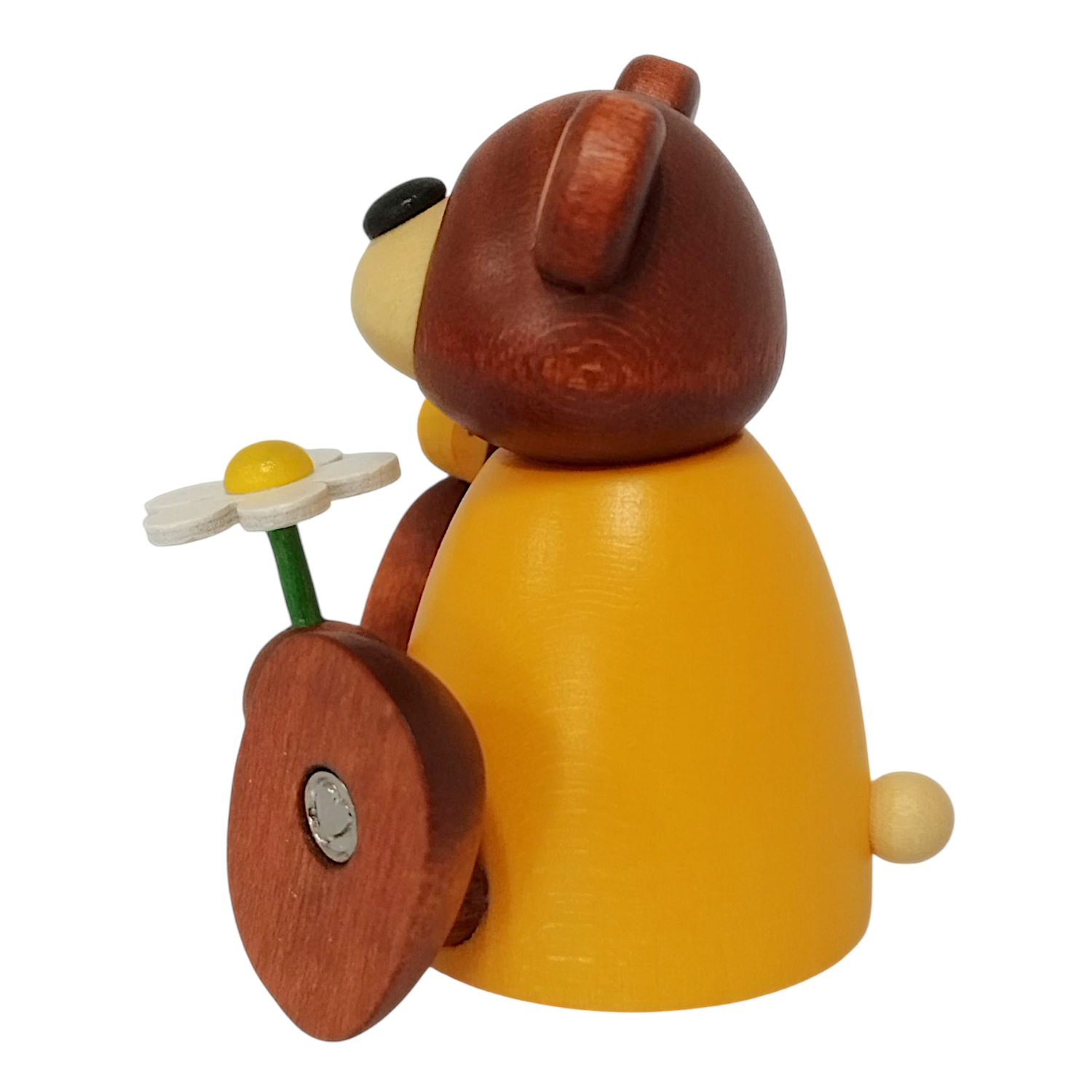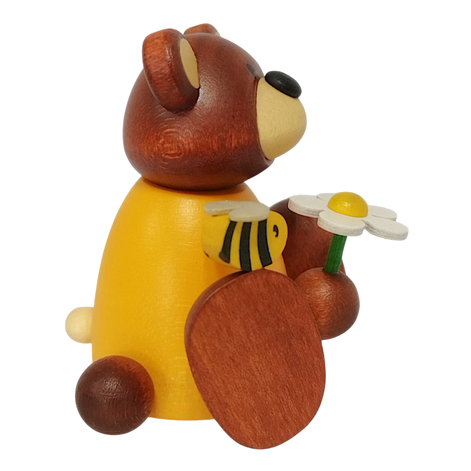 Die neue Serie „Bärnd und Bärbel“ von Hobler begeistert mit unwiderstehlichem Charme und liebevoll gestalteten Details. Bärbel mit Blume und Biene sitzt fröhlich da und hält eine kleine, weiße Blume in der Pfote. Eine freundlich blickende Biene hat auf ihrem Fuß Platz genommen und scheint die Szene neugierig zu beobachten. Bärbels Kleid strahlt in einem warmen Gelbton. Das freundliche Gesicht mit den großen Ohren, die typischen Hobler-Proportionen und die ausgewählten Holztöne unterstreichen die sympathische Ausstrahlung der Figur.