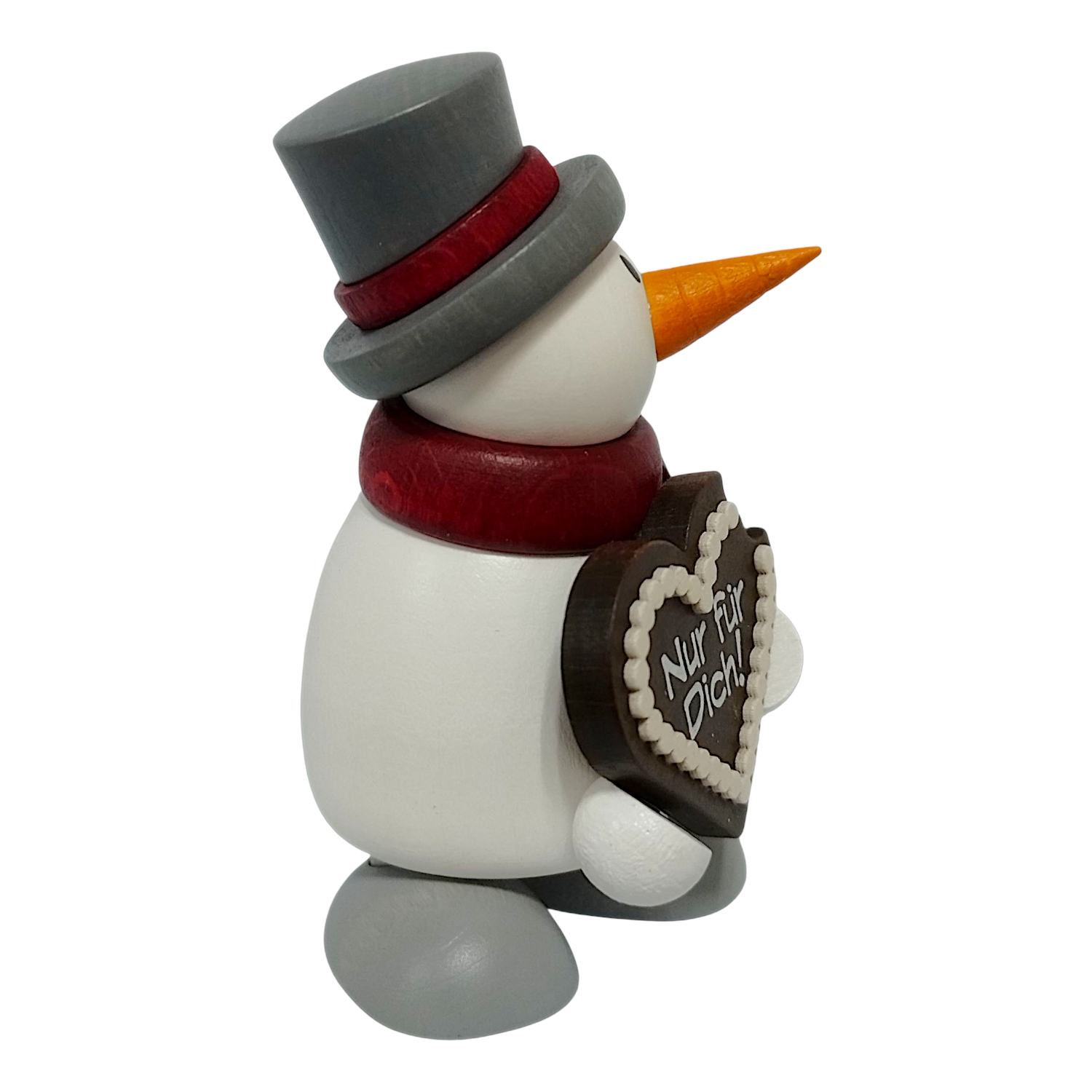 Der Schneemann Otto mit Lebkuchenherz aus dem Hause Hobler strahlt pure Herzlichkeit aus. Er trägt einen eleganten Zylinder, der seinem freundlich gestalteten Gesicht einen besonderen Ausdruck verleiht. Die orangefarbene Möhrennase wirkt humorvoll und rundet sein winterliches Aussehen perfekt ab. Ein Schal in tiefem Rot legt sich wärmend um seinen Hals und setzt einen charmanten Farbakzent. Otto hält stolz ein großes Lebkuchenherz mit der Botschaft „Nur für Dich!“. Das Herz zeigt bereits eine angebissene Ecke und macht die Szene noch lebendiger, fast so, als hätte Otto selbst genascht.