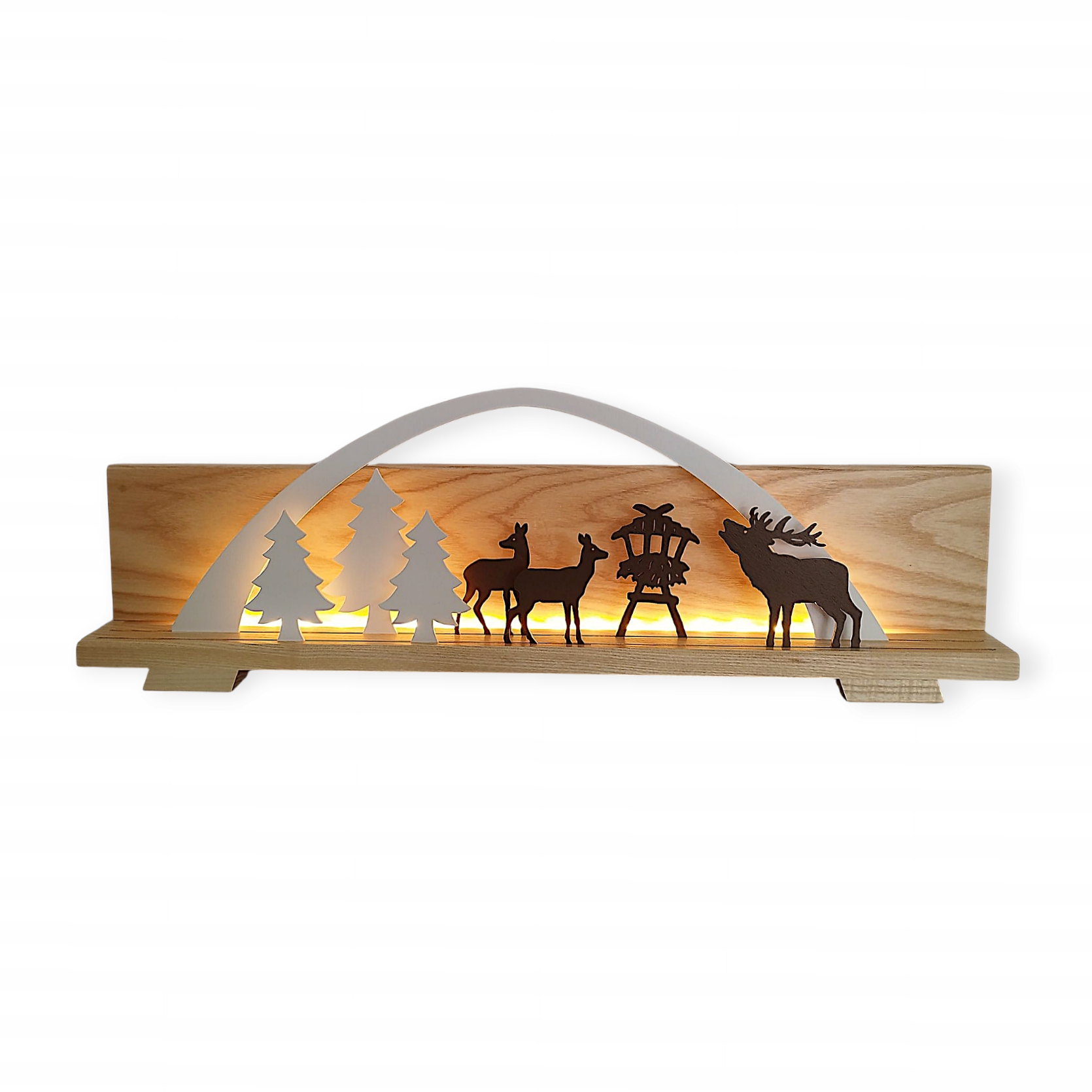 Das Figurenset „Wald“ aus dem Hause Weigla ist ein achtteiliges Set, das die Ruhe und Magie eines Waldes in Ihre Wohnung bringt. Die Figuren stellen eine friedliche Waldszene mit Tieren und Bäumen dar, die in einem verschneiten Wald leben. Besonders die Hirsch- und Rehfiguren fangen die Schönheit der Natur ein. In Verbindung mit dem LED-Dekosockel aus Eschenholz, der separat erhältlich ist, bietet das Set eine stimmungsvolle Beleuchtung und schafft eine festliche Atmosphäre.