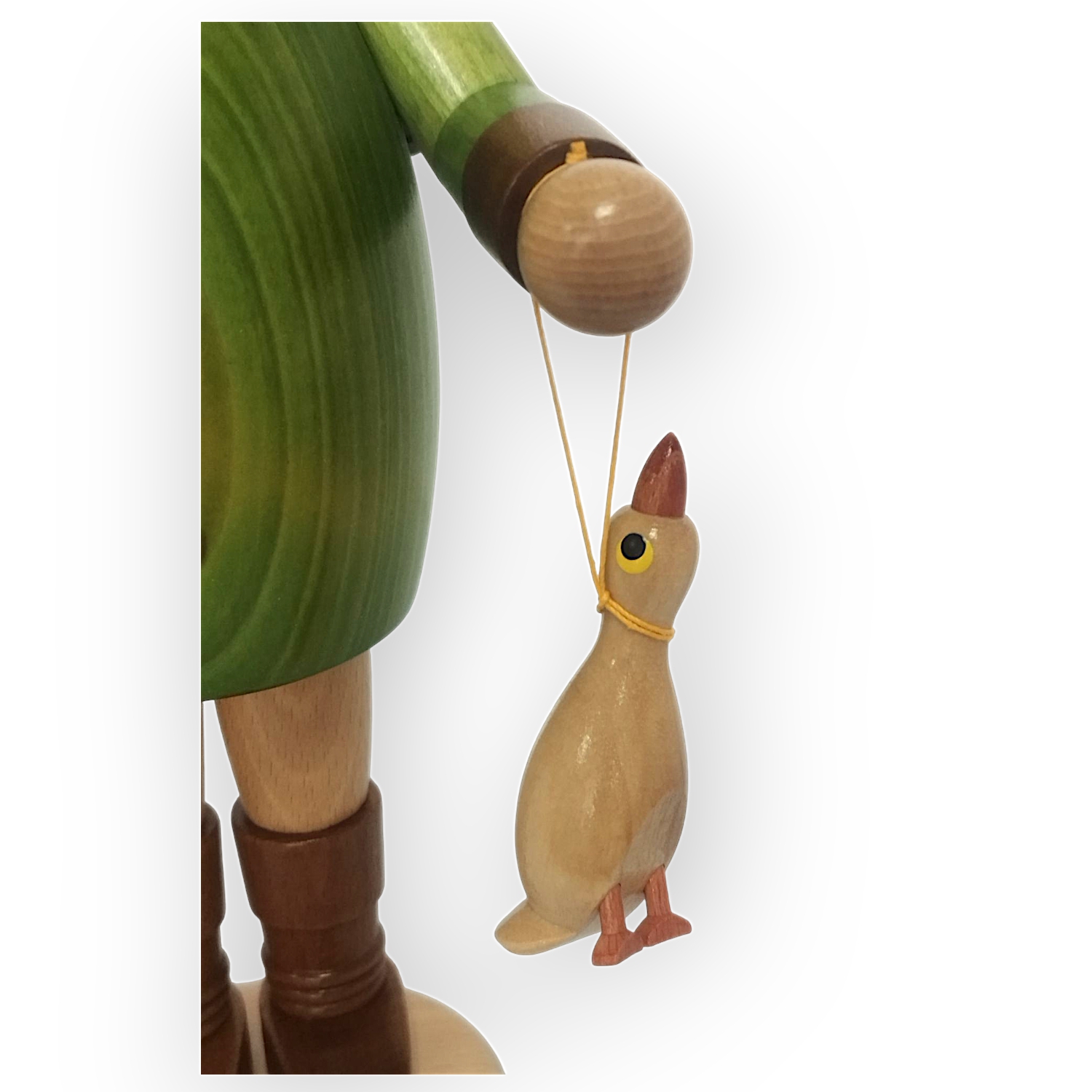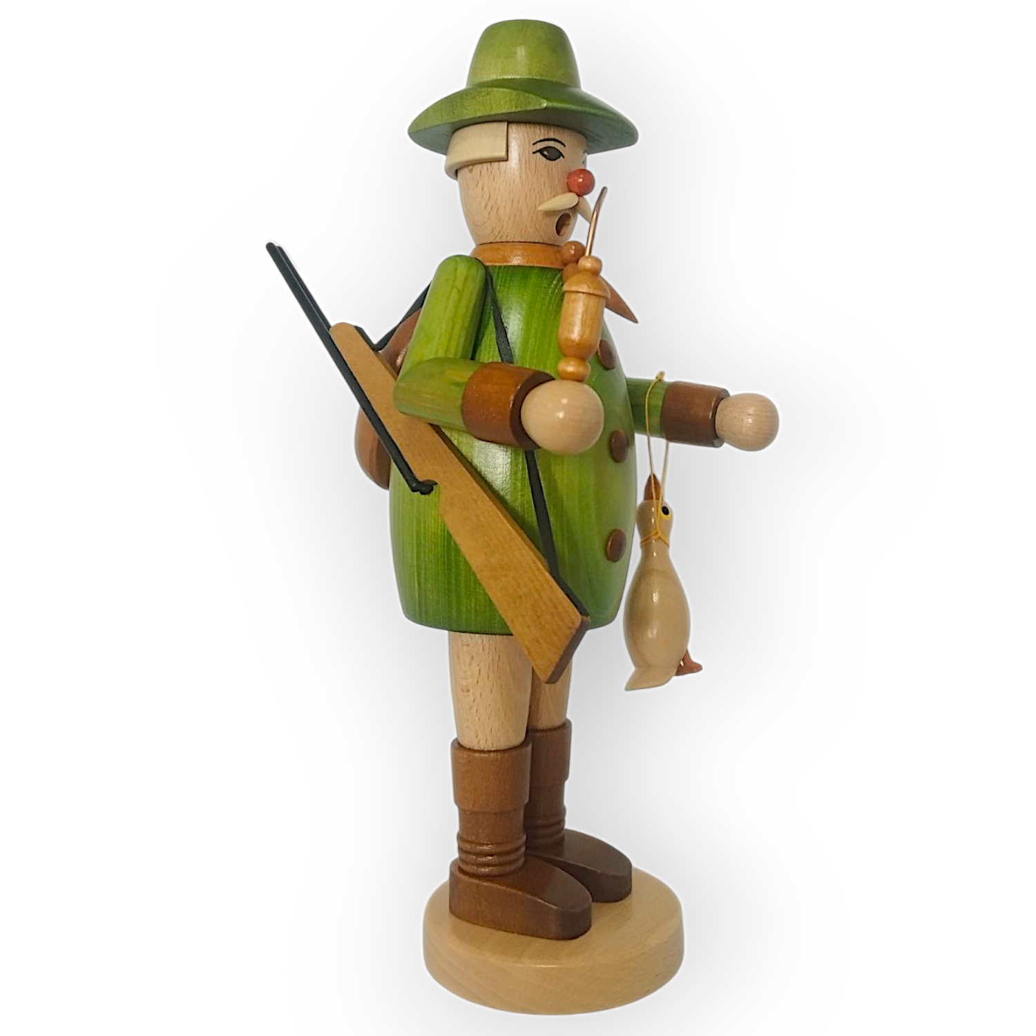 Sein Hut, ebenfalls grün gebeizt unterstreicht das klassische Försterdesign. Die robusten braunen Stiefel ergänzen das Ensemble perfekt, während die naturbelassenen Holzelemente an Armen und Beinen einen harmonischen Ausgleich zur Farbgestaltung schaffen. In seiner rechten Hand hält der Förster eine Pfeife, die das traditionelle Räuchermännchen-Design repräsentiert. In seiner linken Hand trägt er ein kleines, geschnitztes Entlein, das an einer Schnur befestigt ist. Diese liebevoll gestaltete Figur verleiht dem Förster eine sympathische, naturnahe Ausstrahlung.