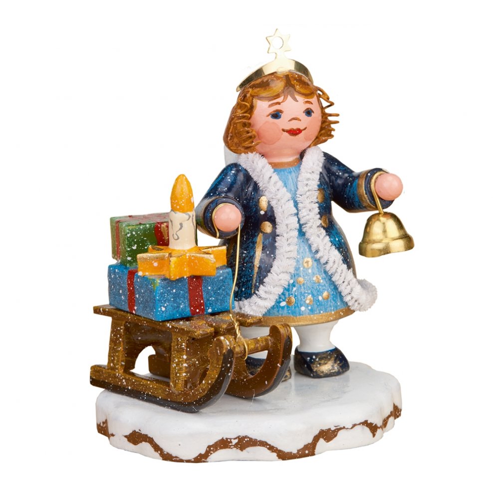 Dick eingepackt im blauen Wintermantel und mit Krone auf dem Kopf zieht dieser kleine Engel einen großen Schlitten voll geladen mit vielen liebevoll verpackten Geschenken durch den Schnee., mit dem Glöckchen in der Hand ruft es zur Bescherung. Auf dem Rücken tragen alle Himmelskinder hübsche, zarte Flügel. Das Podest auf dem die kleinen Figuren stehen ist von Schnee bedeckt, so kommt die winterliche Weihnachtsstimmung besonders schön zur Geltung.