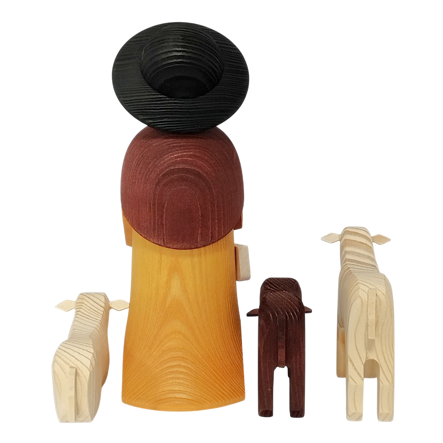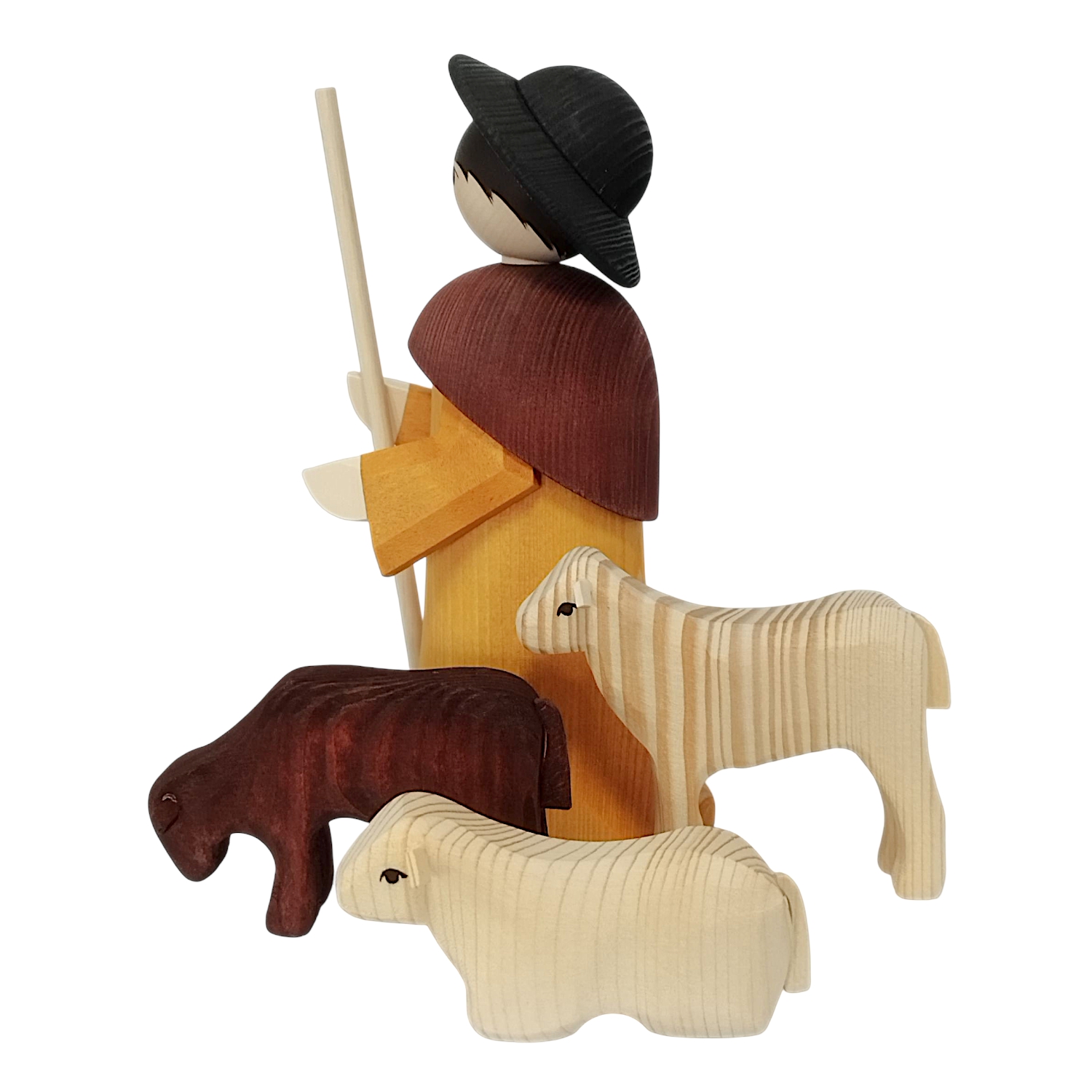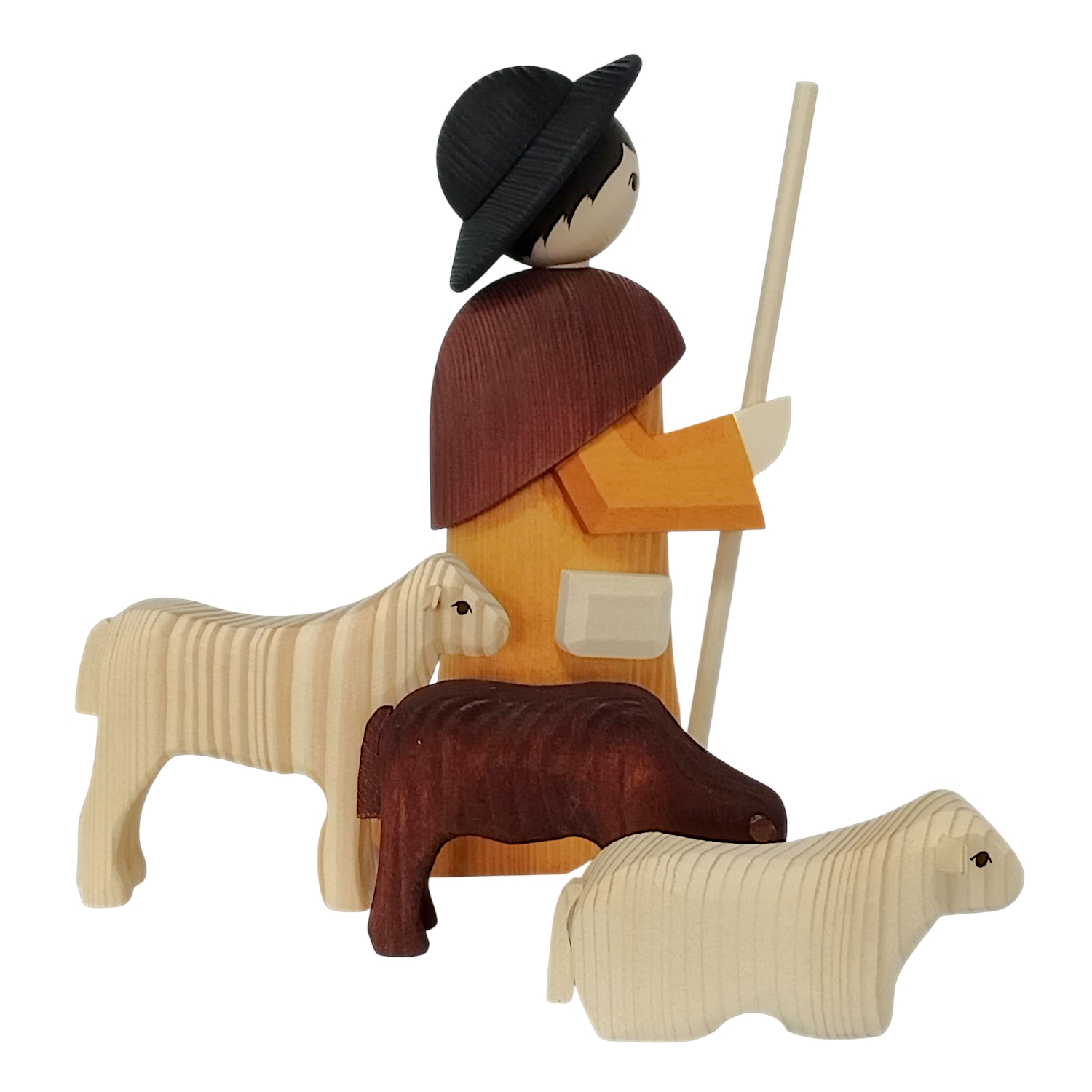Die drei Schafe stehen um ihn herum und sind farbenfroh und detailreich gestaltet. Zwei der Tiere sind naturbelassen und zeigen die schöne Maserung des Holzes, während das dritte Schaf einen tiefen Braunton besitzt. Die Schafe wirken mit ihren sanft abgerundeten Körpern und zarten Gesichtszügen freundlich und einladend. Ihre Oberflächen sind durch Beizen und Ölen besonders geschützt und erhalten dadurch eine angenehme Haptik.​