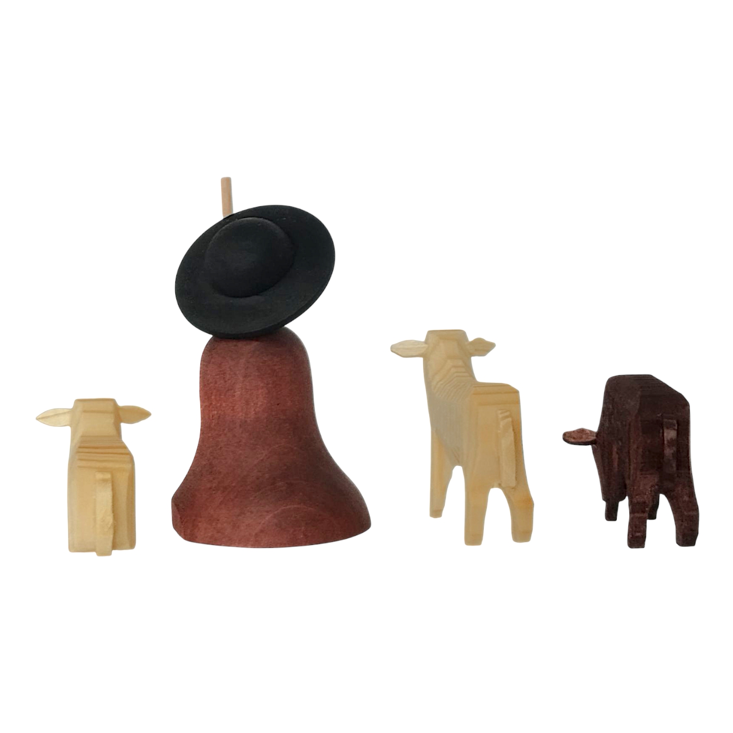 Die drei Schafe, die den Hirten begleiten, sind jeweils unterschiedlich gestaltet. Zwei Tiere sind in einem hellen Holzton gearbeitet und heben sich mit ihrer glatten, reduzierten Form deutlich ab. Ihre ruhige Körperhaltung und die sanft geschnitzten Konturen zeigen Liebe zum Detail. Das dritte Schaf steht in kräftigem Braun neben seinen Artgenossen. Es senkt den Kopf und scheint zu grasen, was der Szene zusätzlich Dynamik und Alltagsnähe verleiht.