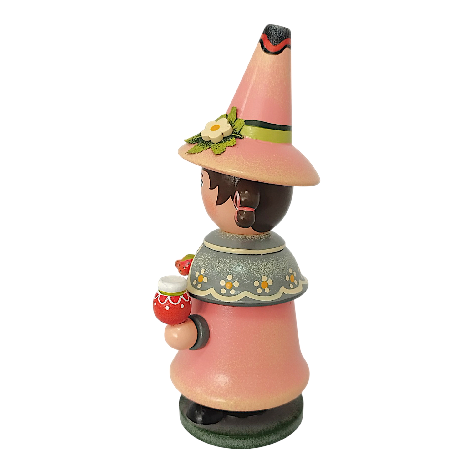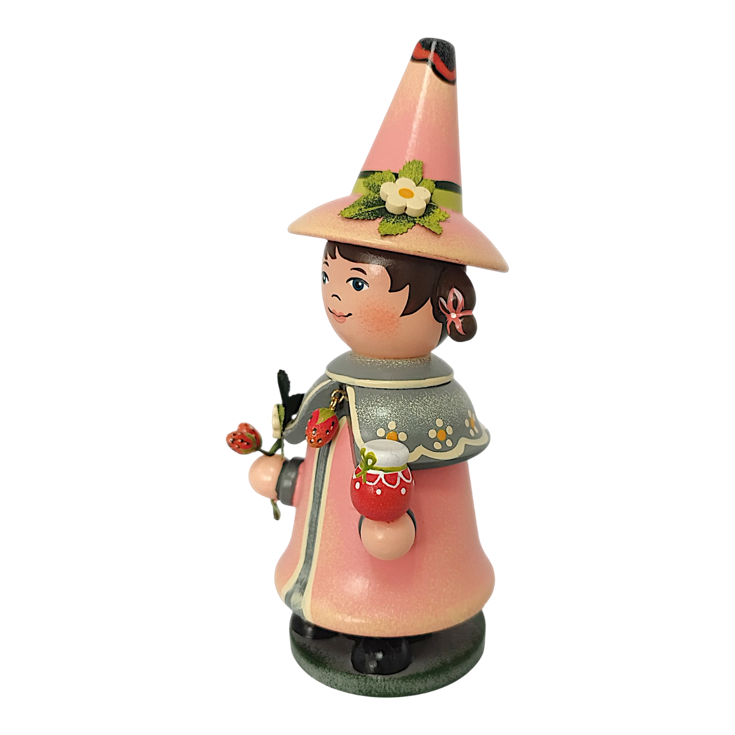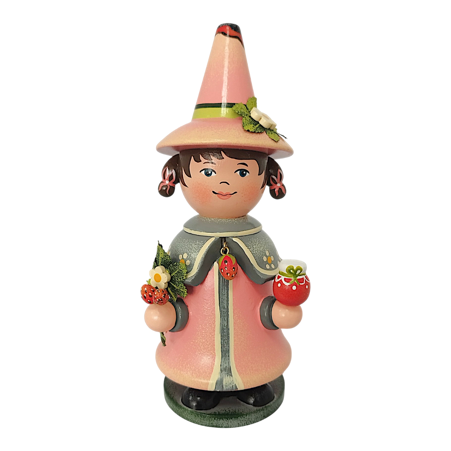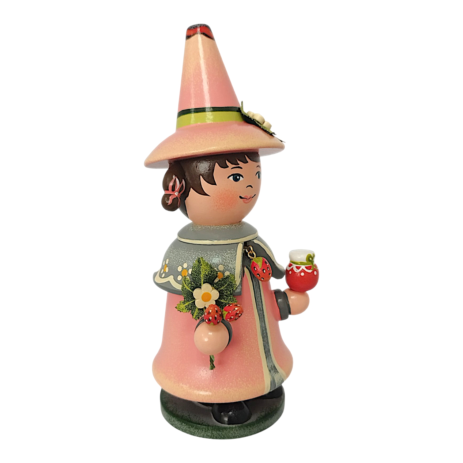 Gekrönt wird das Design durch den hohen, farblich passenden Spitzhut, der an der Seite ebenfalls mit einer kleinen weißen Erdbeerblüte und einem grünen Blatt geschmückt ist. Da der Wichtel als klassische Räucherfigur konzipiert ist, lässt sich der Oberkörper abnehmen, um im Inneren eine Räucherkerze zu platzieren. Der duftende Qualm zieht dann effektvoll oben aus der offenen Hutspitze ab. Durch das sommerliche Erdbeer-Motiv und die fröhlichen Farben ist dieser Wichtel eine ideale Dekoration für jede Jahreszeit.