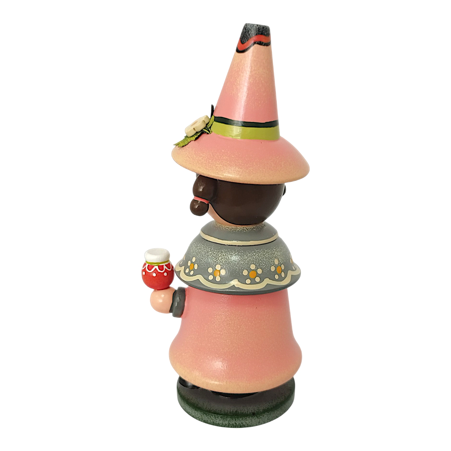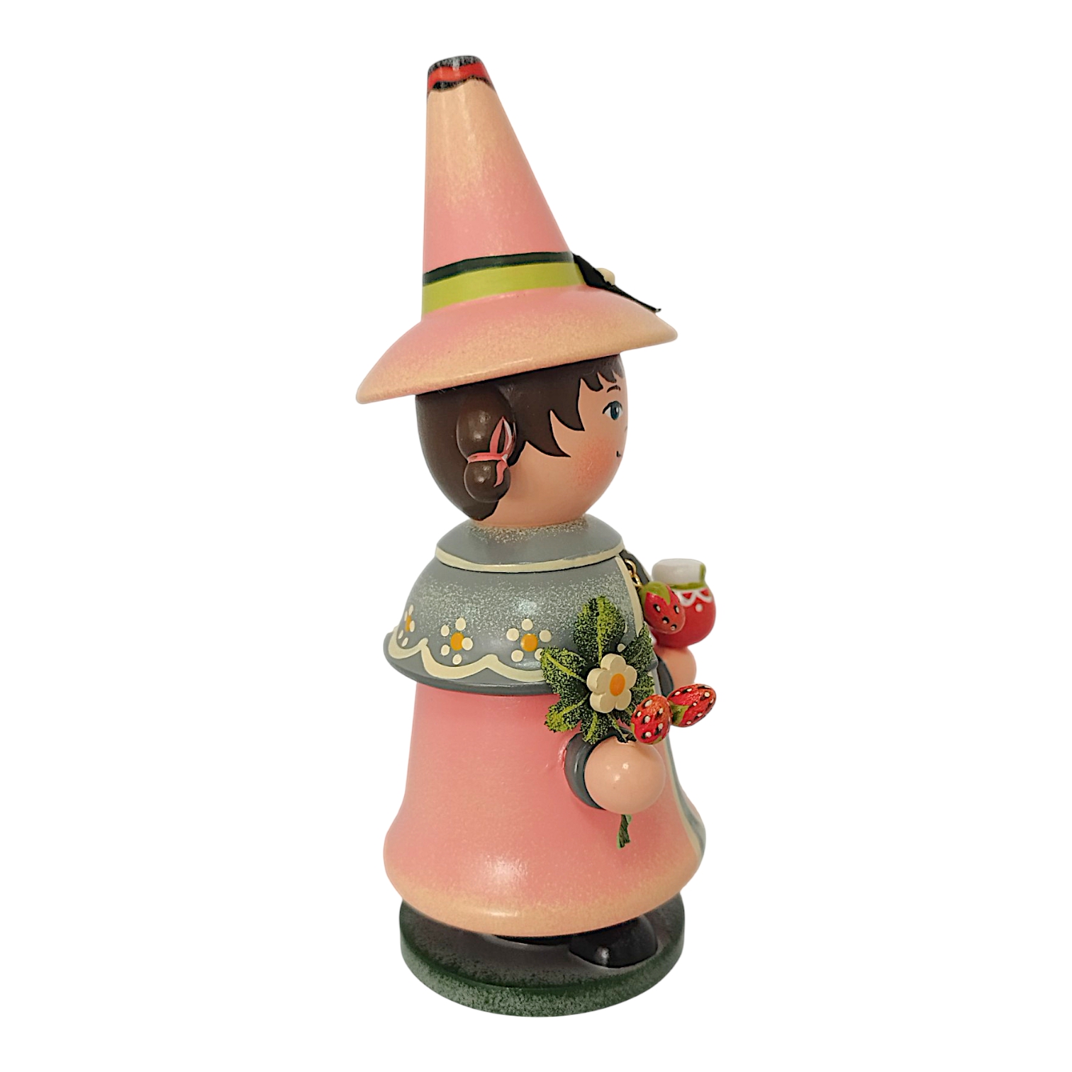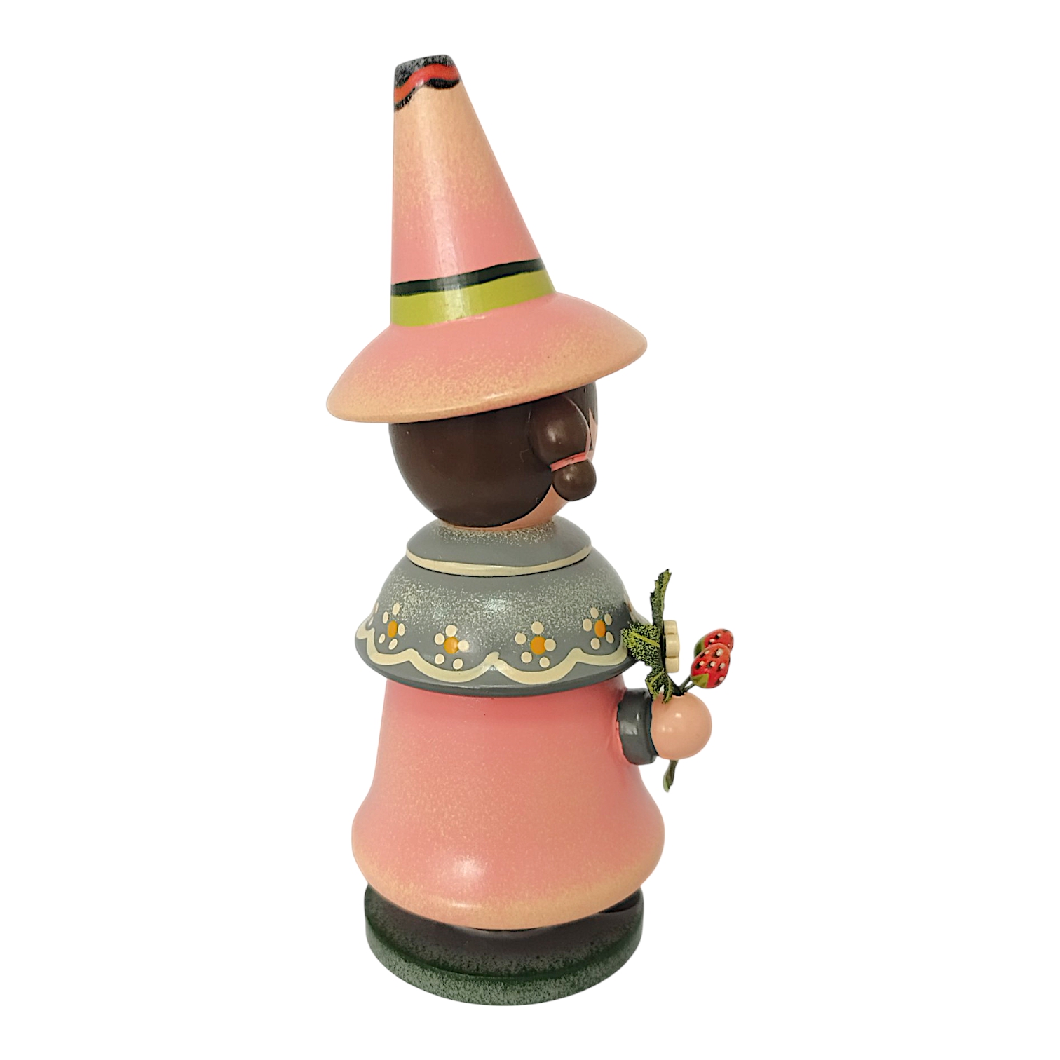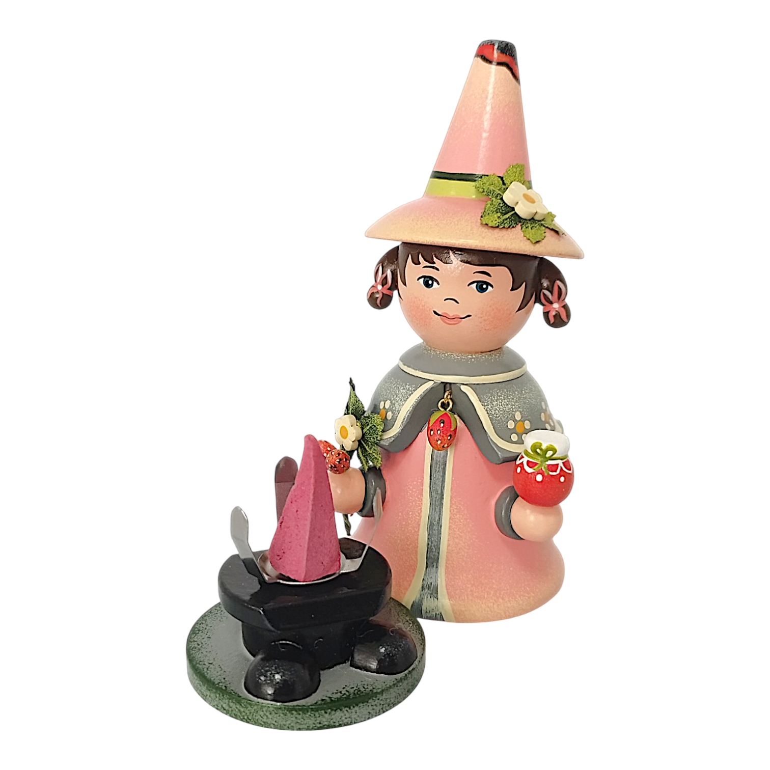 Gekrönt wird das Design durch den hohen, farblich passenden Spitzhut, der an der Seite ebenfalls mit einer kleinen weißen Erdbeerblüte und einem grünen Blatt geschmückt ist. Da der Wichtel als klassische Räucherfigur konzipiert ist, lässt sich der Oberkörper abnehmen, um im Inneren eine Räucherkerze zu platzieren. Der duftende Qualm zieht dann effektvoll oben aus der offenen Hutspitze ab. Durch das sommerliche Erdbeer-Motiv und die fröhlichen Farben ist dieser Wichtel eine ideale Dekoration für jede Jahreszeit.