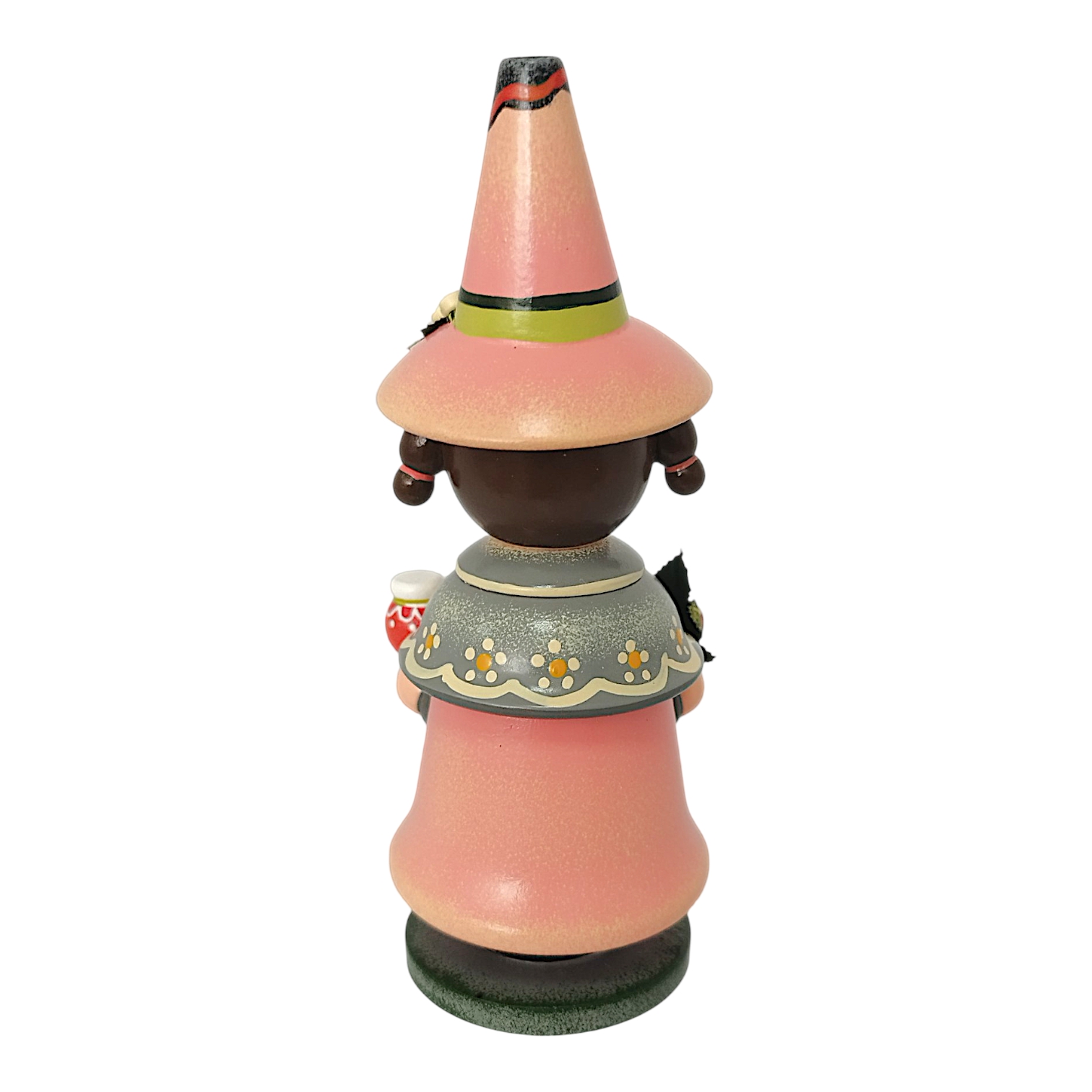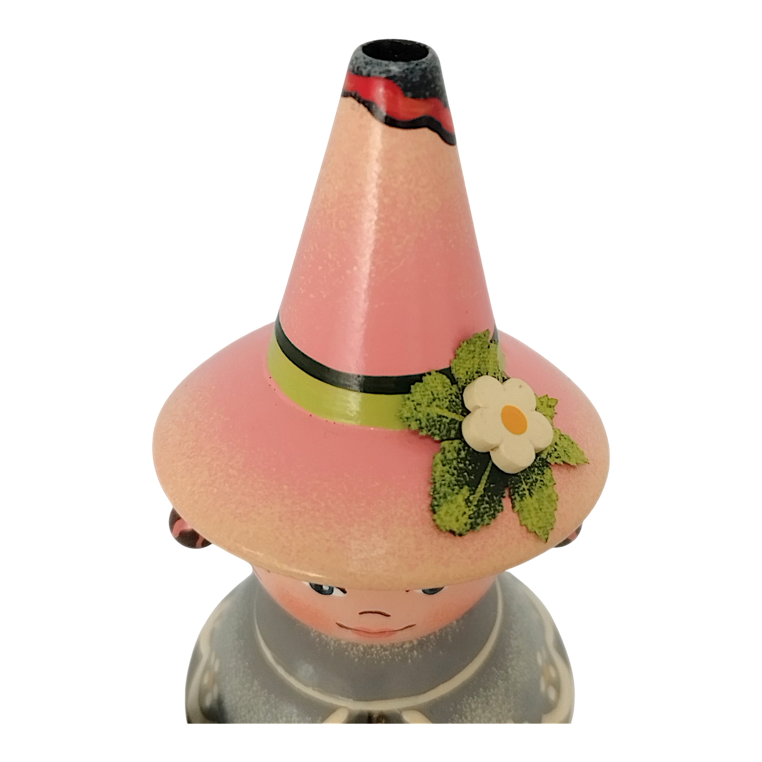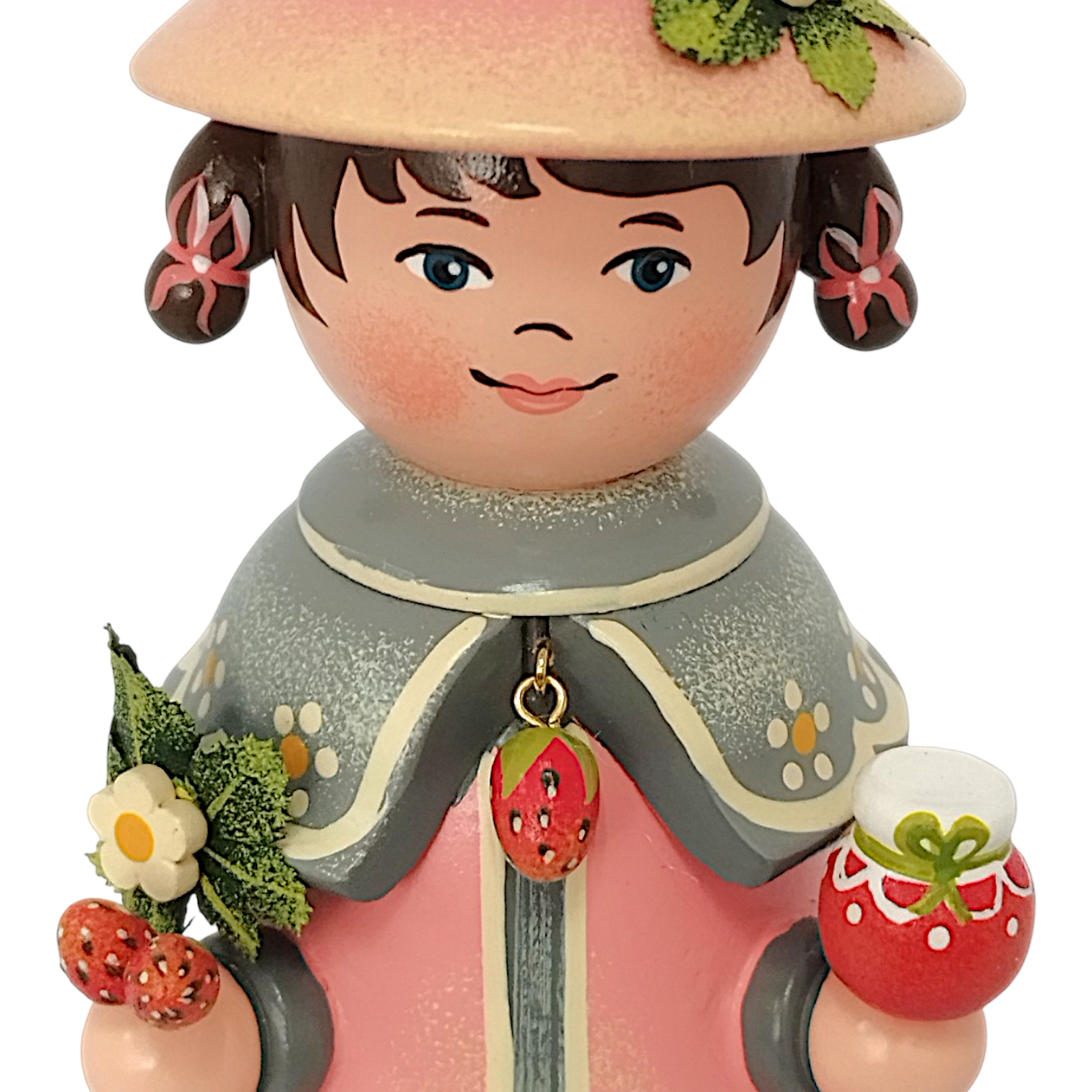 Das Gesicht des Wichtels strahlt eine herzliche Kindlichkeit aus, die so typisch für die Handschrift von Hubrig ist. Die großen, tiefbraunen Augen sind mit einem sanften Glanzpunkt versehen, der dem Blick eine lebendige Tiefe verleiht, während die zarten, schwungvoll aufgemalten Augenbrauen und der kleine, lächelnde Mund den freundlichen Charakter unterstreichen. Die Wangen sind in einem weichen Roséton schattiert, was der Figur ein gesundes, strahlendes Aussehen verleiht. Die Haare sind in einem kräftigen Dunkelbraun gehalten und rahmen das Gesicht mit einem präzise aufgemalten Pony perfekt ein. Besonders liebevoll gestaltet sind die beiden kleinen Zöpfe, die an den Seiten hervorlugen und jeweils mit einer passenden roten Schleife gebunden sind.
