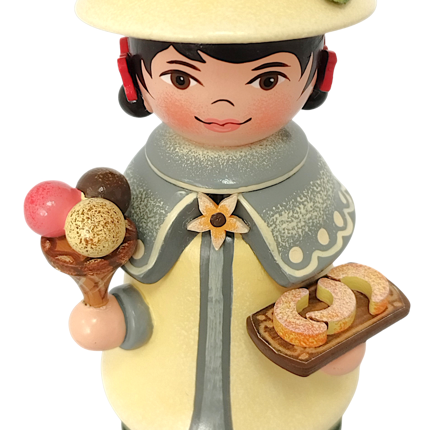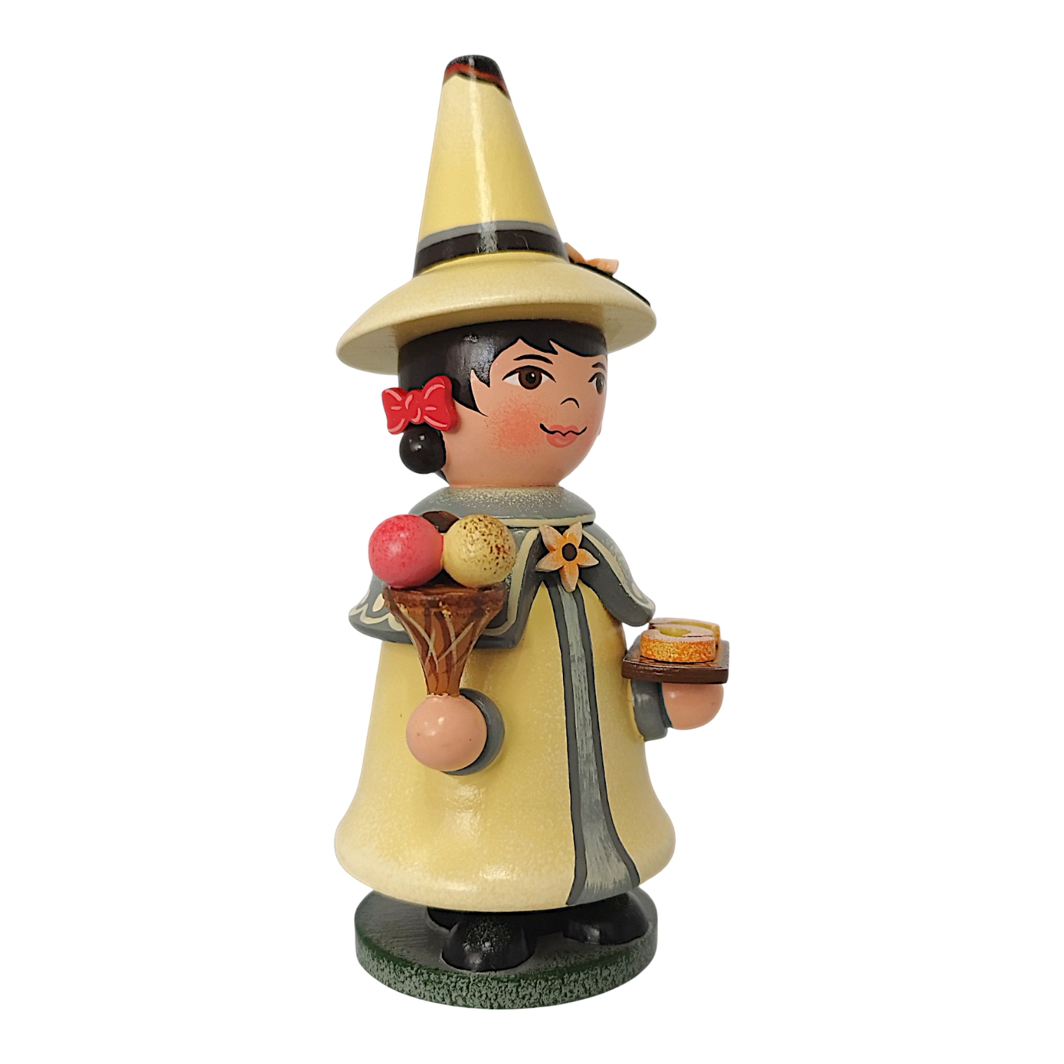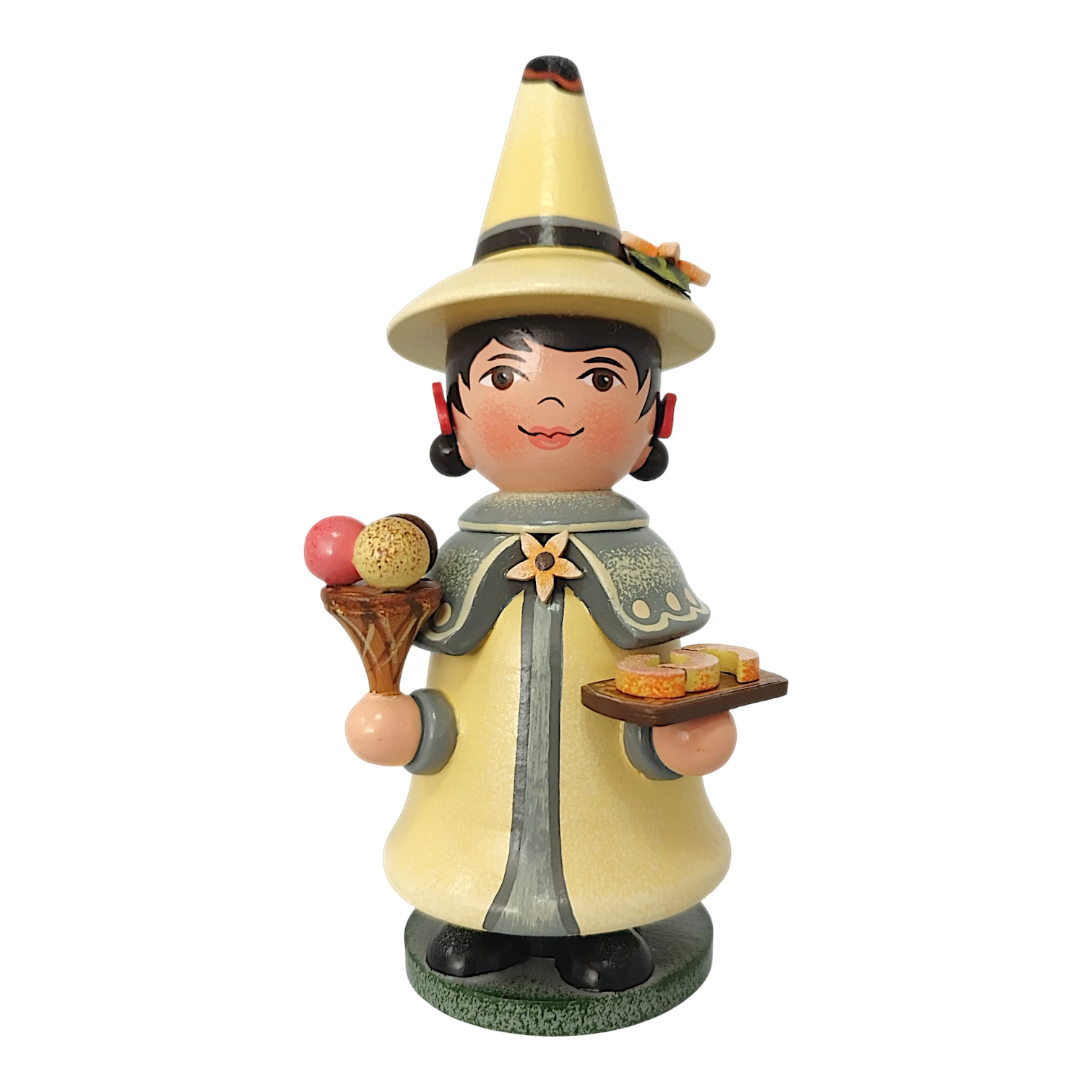 Der charmante Räuchermann aus dem Hause Hubrig Volkskunst zelebriert das Thema Vanille als zeitloses Genussthema. Die Figur ist fast vollständig in einem warmen, sanften Vanillegelb gehalten, das perfekt mit den grauen Akzenten des Gewandes harmoniert. Ein besonderes Highlight ist der kurze Schulterumhang, der mit einem feinen Punktmuster verziert ist und in der Mitte von einer filigranen Vanilleblüten-Brosche zusammengehalten wird. In seinen Händen präsentiert der Wichtel köstliche Leckereien: Rechts hält er eine Waffel mit drei bunten Eiskugeln, die sofort an sommerliche Tage erinnern, während er links auf einem kleinen Holztablett drei täuschend echt aussehende Vanillekipferl serviert.