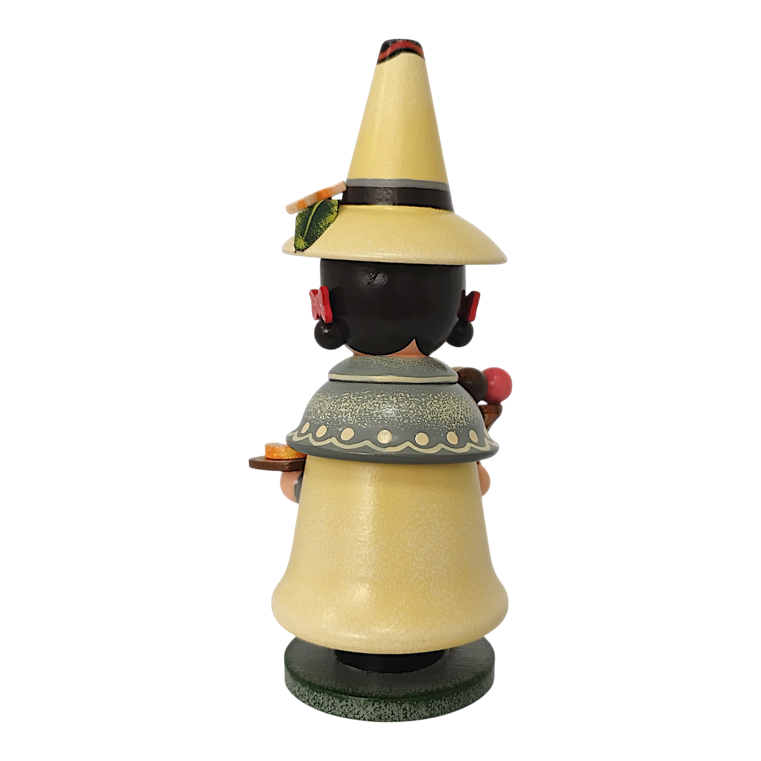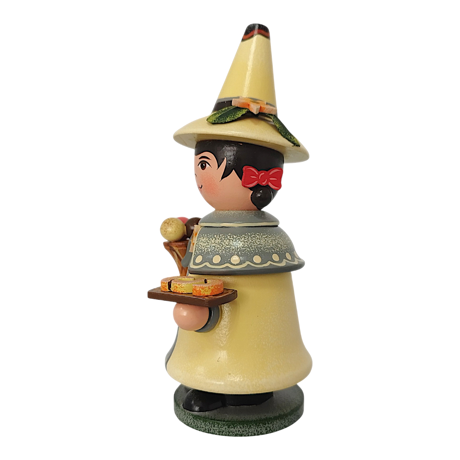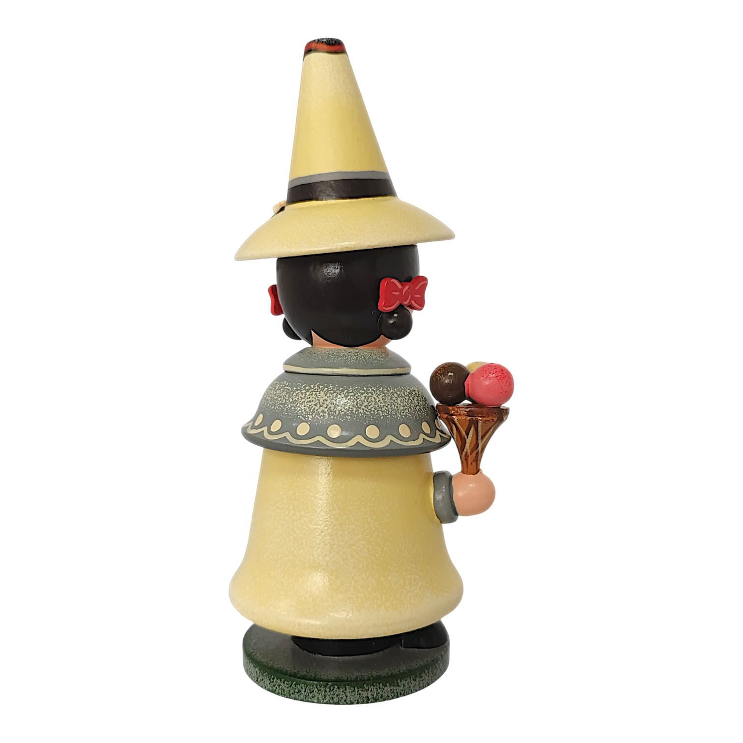 Der charmante Räuchermann aus dem Hause Hubrig Volkskunst zelebriert das Thema Vanille als zeitloses Genussthema. Die Figur ist fast vollständig in einem warmen, sanften Vanillegelb gehalten, das perfekt mit den grauen Akzenten des Gewandes harmoniert. Ein besonderes Highlight ist der kurze Schulterumhang, der mit einem feinen Punktmuster verziert ist und in der Mitte von einer filigranen Vanilleblüten-Brosche zusammengehalten wird. In seinen Händen präsentiert der Wichtel köstliche Leckereien: Rechts hält er eine Waffel mit drei bunten Eiskugeln, die sofort an sommerliche Tage erinnern, während er links auf einem kleinen Holztablett drei täuschend echt aussehende Vanillekipferl serviert.