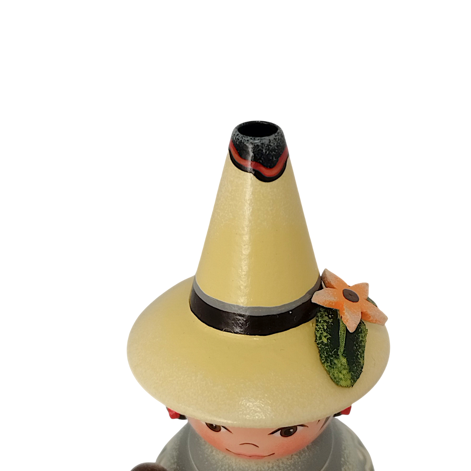 Das Gesicht des Wichtels strahlt eine herzliche Kindlichkeit aus, die so typisch für die Handschrift von Hubrig ist. Die großen, tiefbraunen Augen sind mit einem sanften Glanzpunkt versehen, der dem Blick eine lebendige Tiefe verleiht, während die zarten, schwungvoll aufgemalten Augenbrauen und der kleine, lächelnde Mund den freundlichen Charakter unterstreichen. Die Wangen sind in einem weichen Roséton schattiert, was der Figur ein gesundes, strahlendes Aussehen verleiht. Die Haare sind in einem kräftigen Dunkelbraun gehalten und rahmen das Gesicht mit einem präzise aufgemalten Pony perfekt ein. Besonders liebevoll gestaltet sind die beiden kleinen Zöpfe, die an den Seiten hervorlugen und jeweils mit einer leuchtend roten Schleife gebunden sind. Diese Farbtupfer bilden einen wunderbaren Kontrast zu den sanften Pastelltönen der Kleidung.