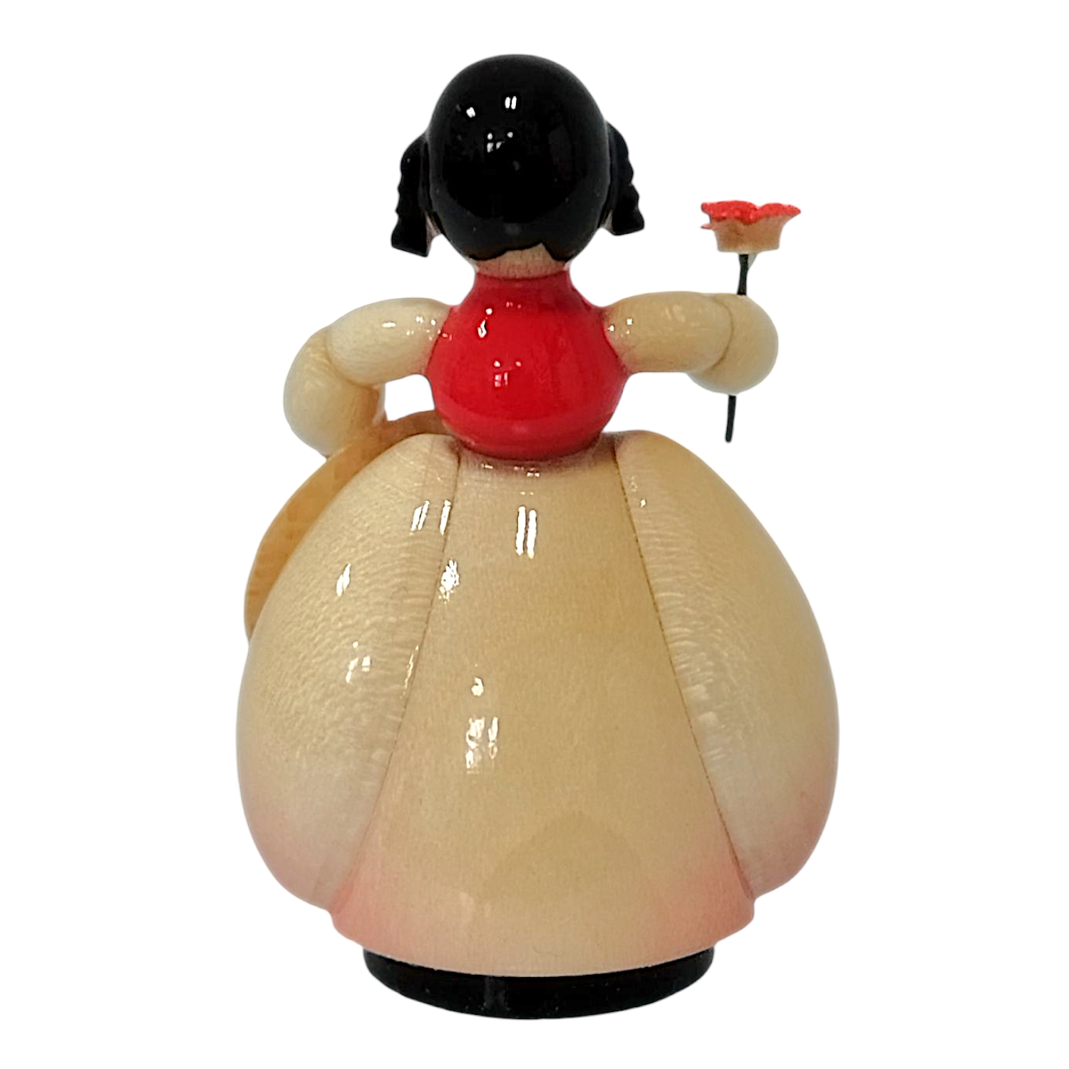 Diese handgefertigte Dame mit Hut und Blume aus dem Hause Kramer Holz Design verkörpert die zeitlose Eleganz des Biedermeier-Stils. Schon beim ersten Anblick verzaubert die kleine Holzfigur durch ihre sanften Formen und die liebevolle Bemalung. Ihr voluminöser Rock aus hellem, fein gemasertem Naturholz bildet die solide Basis dieser kunstvollen Drechselarbeit. Die glatte, seidig glänzende Oberfläche unterstreicht die hohe Qualität der erzgebirgischen Handwerkskunst.