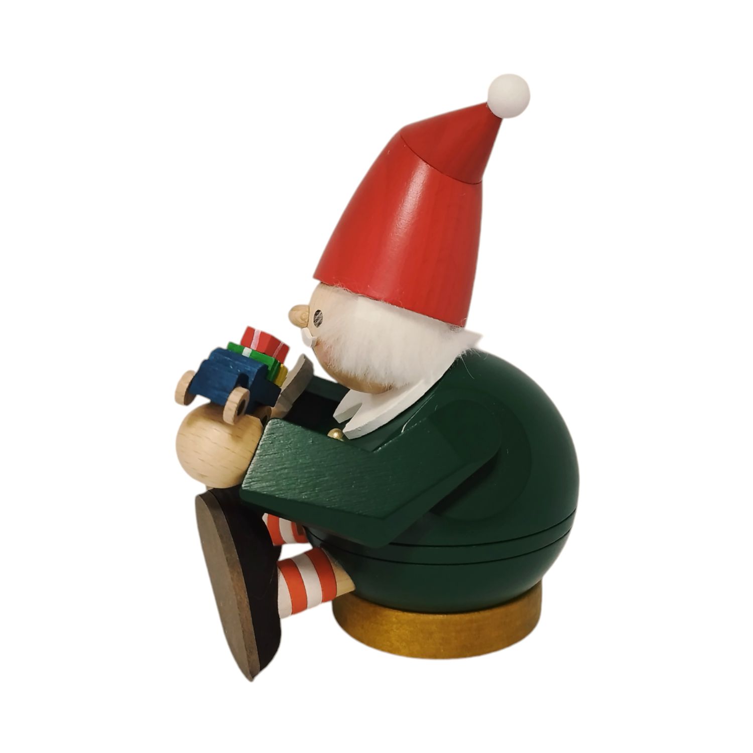 Er sitzt auf einem goldfarbenen Sockel, der ihm Stabilität verleiht. Die gesamte Figur ist aus Holz gefertigt und besitzt eine glatte, sorgfältig gearbeitete Oberfläche, die an vielen Stellen die Maserung des Holzes erkennen lässt. Die Farben sind kräftig, aber dezent genug, um den rustikalen und handwerklichen Charakter des Räuchermannes zu unterstreichen.