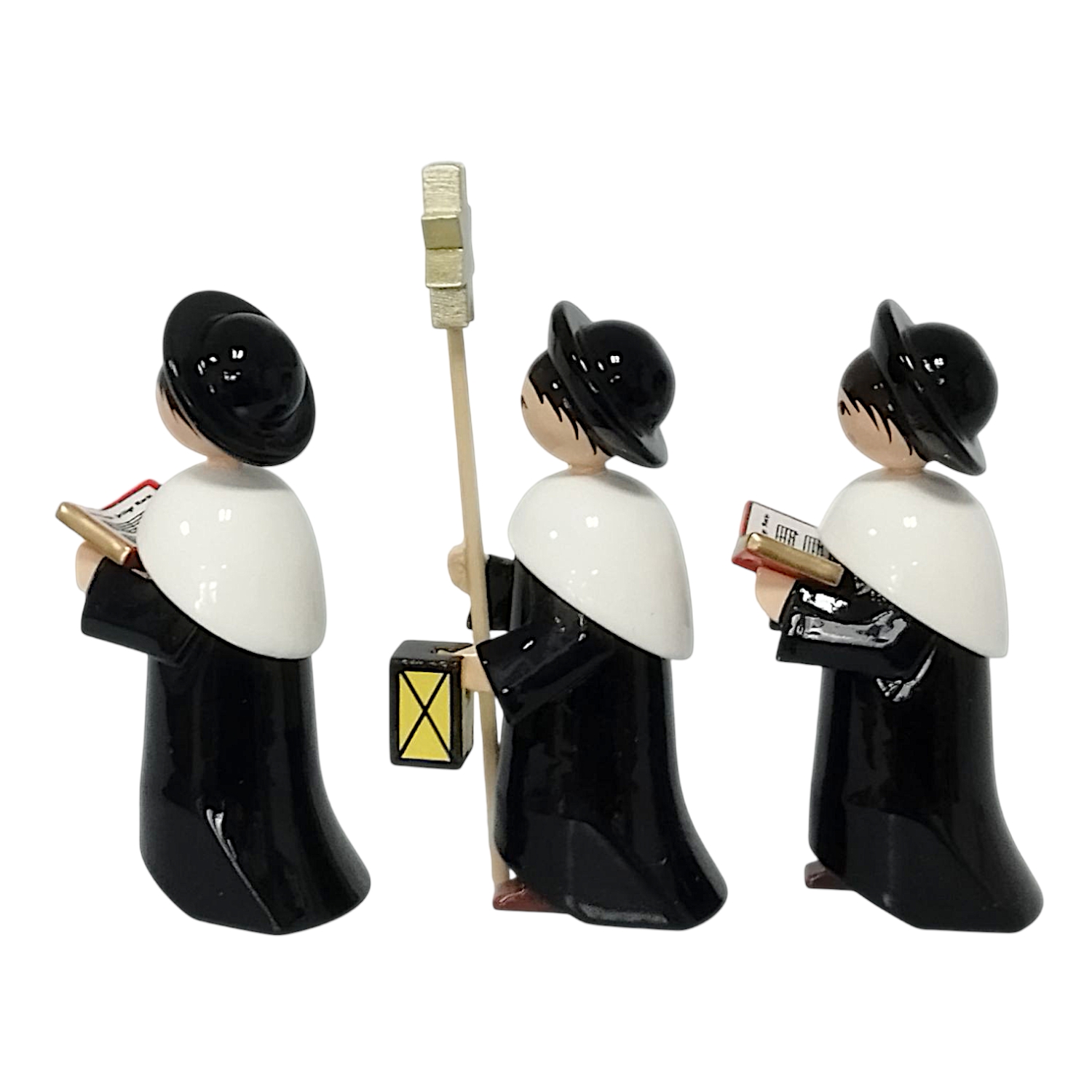 Zwei der Figuren halten jeweils ein aufgeschlagenes Gesangsbuch in den Händen, was ihre besondere Verbundenheit zum traditionellen Weihnachtsliedersingen betont. Der dritte Sänger trägt anmutig einen goldfarbenen Stern auf einer Stange und eine kleine, authentisch gestaltete Laterne. Dieser Sternträger symbolisiert als „Vorsänger“ die alte Tradition, in der eine Gruppe gemeinsam von Haus zu Haus zieht und singt.​