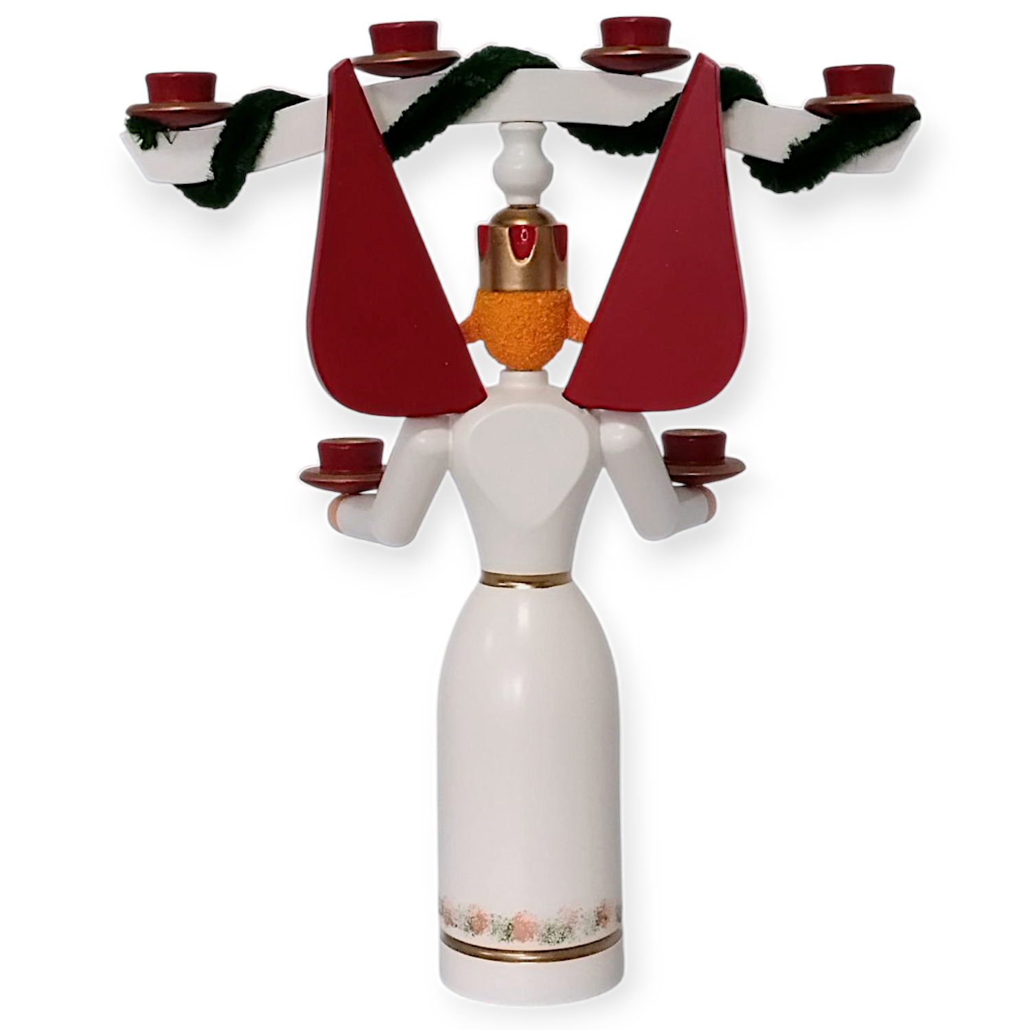 Der Jochengel stellt eine kunstvoll geschnitzte Engelsfigur dar, die aus hellem, fein gearbeitetem Holz besteht. Er trägt ein langes, schlichtes Kleid in Weiß, das am unteren Saum sowie im Brustbereich zarte florale Muster zeigt. Diese Muster fügen sich harmonisch in das Gesamtbild ein und verleihen der Figur eine festliche Leichtigkeit. Die Arme des Engels streckt er seitlich aus, wobei er in jeder Hand einen kleinen roten Kerzenhalter balanciert. Besonders auffällig wirkt das namensgebende Joch: Eine quer über dem Kopf liegende, geschwungene Konstruktion, die insgesamt sechs zusätzliche Kerzenhalter trägt. Dieses Joch ruht auf einem Ständer welche auf dem Kopf des Engels befestigt ist, zwei stilisierten, roten Flügeln, die mit goldenen Punkten runden das Erscheinungsbild optisch ab.