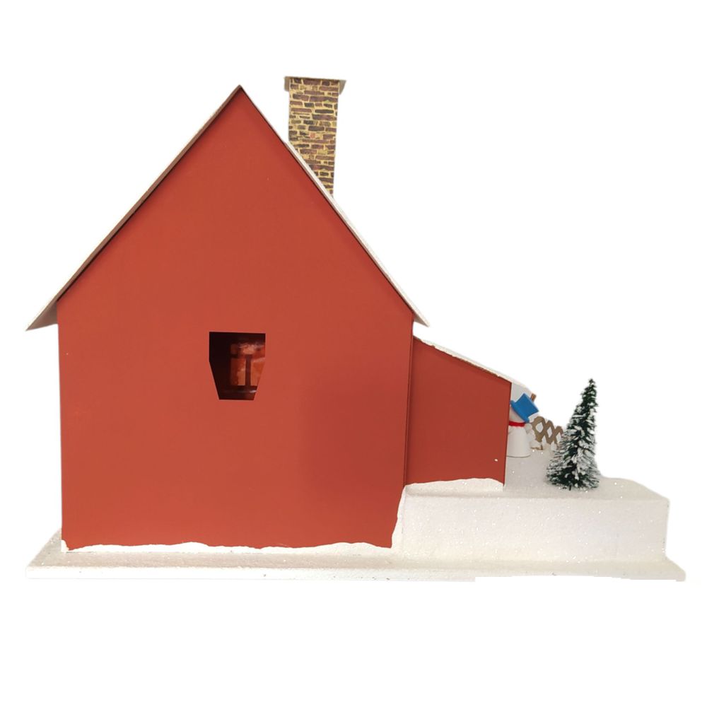 Winterliche sowie fröhliche Stimmung verbreitet dieses Lichterhaus Haus am Berg. Tief verschneit liegt es an einer steilen Straße, ein kleiner junge steht davor und wirft Schneebälle, ein Schneemann mit Zylinder und Schal steht im Garten und frisch gewaschene Wäsche hängt am Balkon unter dem verschneiten Dach an dem spitze Eiszapfen hängen. Alle Fenster des Hauses werden von weißen Spitzengardinen geschmückt und grüne Tannen biegen sich unter der Last des frisch gefallenen Schnees.