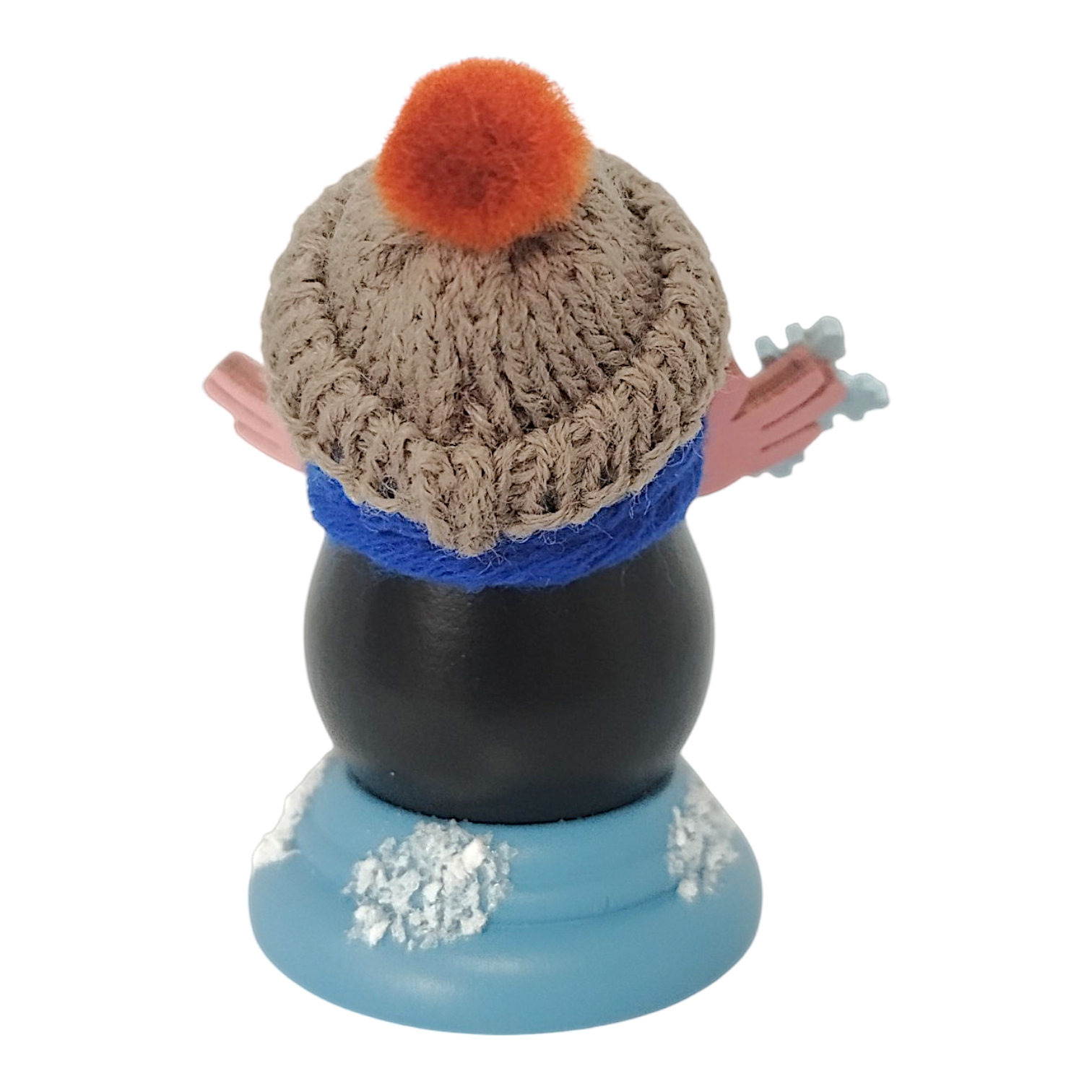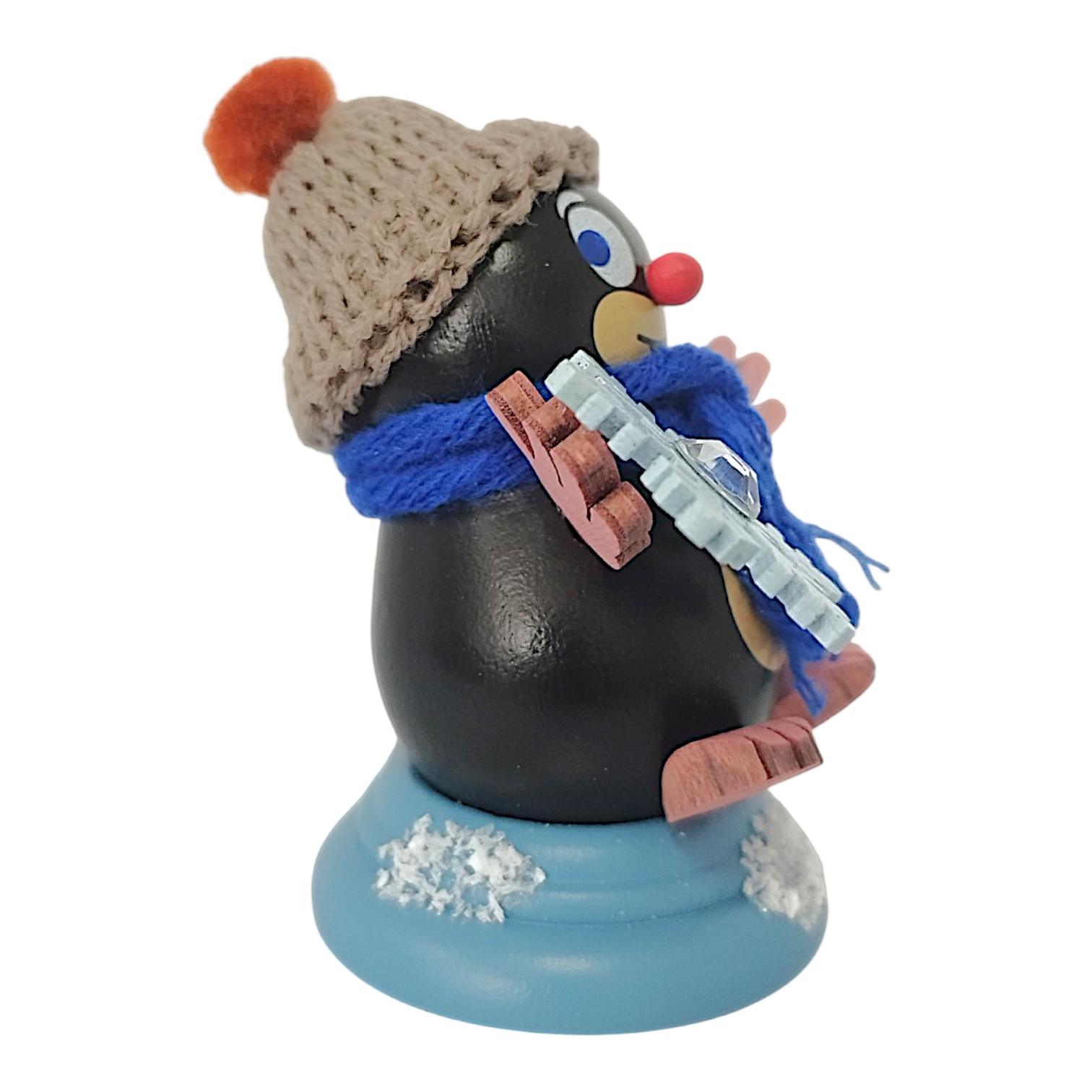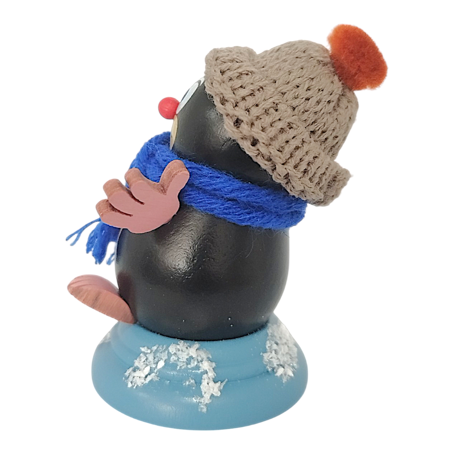 Konrad steht fest auf einem hellblau lasierten Sockel, der einem verschneiten Erdhügel nachempfunden ist. Diese Konstruktion bietet nicht nur einen sicheren Stand, sondern fügt sich auch harmonisch in jede Winterdekoration ein. Mit seiner kompakten Größe von 7,5 cm ist Konrad ein fröhlicher Begleiter, der Sammler und Liebhaber von Holzfiguren gleichermaßen begeistert.