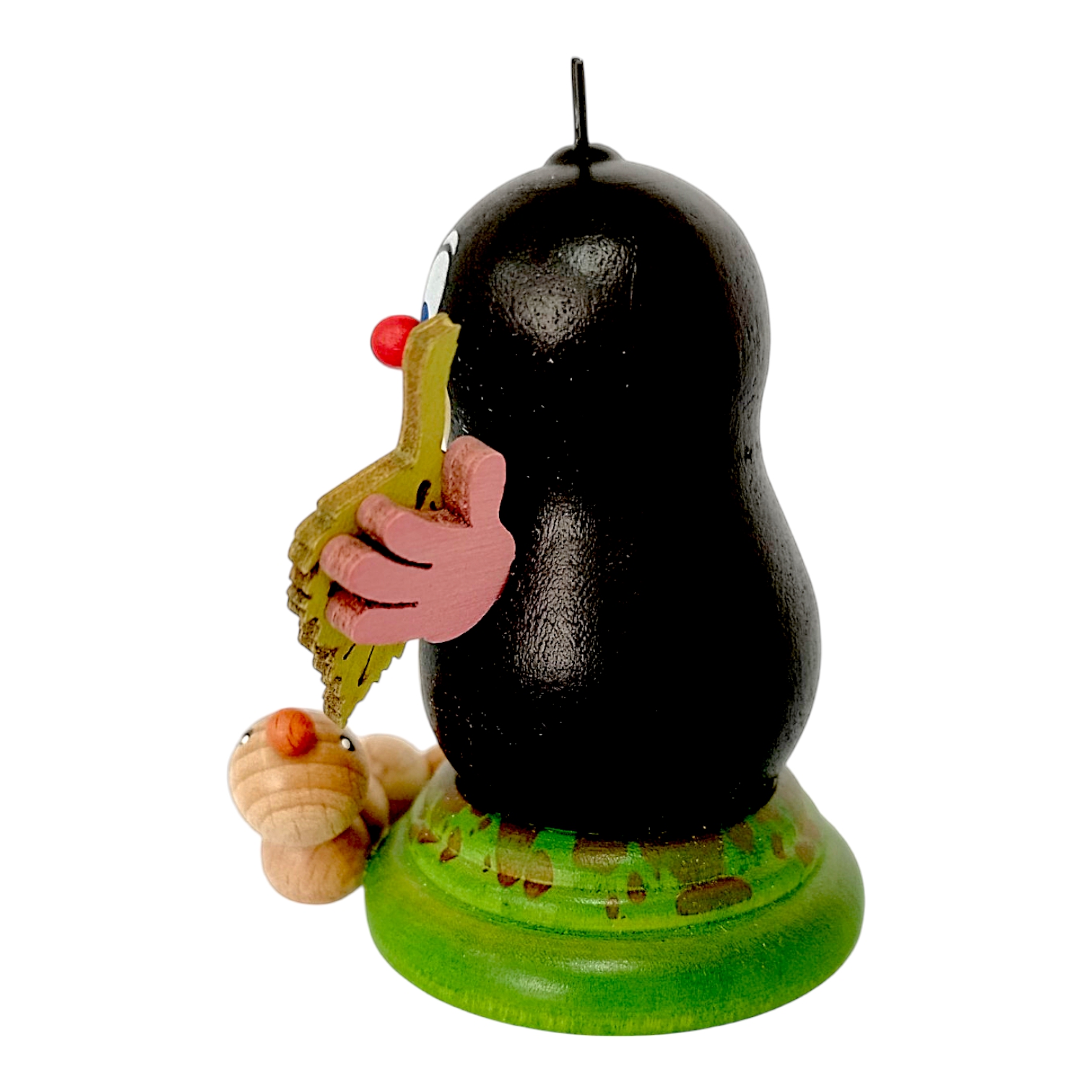 Der Maulwurf Lene verkörpert traditionelle erzgebirgische Handwerkskunst, da die Herstellung in sorgfältiger Handarbeit mit viel Liebe zum Detail erfolgt. Die kleine Figur besticht durch eine bauchige Silhouette, wobei die runden Formen eine besonders herzliche Ausstrahlung verleihen. Während der tiefschwarze Körper glänzt, bildet der helle Bauch einen sanften Kontrast zur dunklen Gestalt. Gleichzeitig erweckt die freundliche Schnauzenpartie das Wesen zum Leben, da die neugierigen blauen Augen und das verschmitzte Lächeln den Betrachter direkt ansprechen. Zudem dienen die rote Nase und die zwei kecken Härchen als markante Erkennungsmerkmale, welche die gesamte Serie unverwechselbar machen.