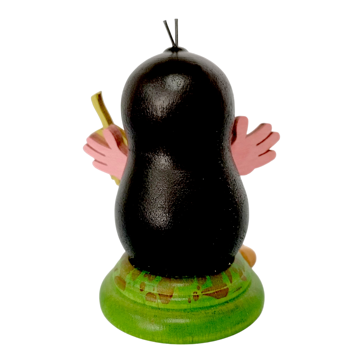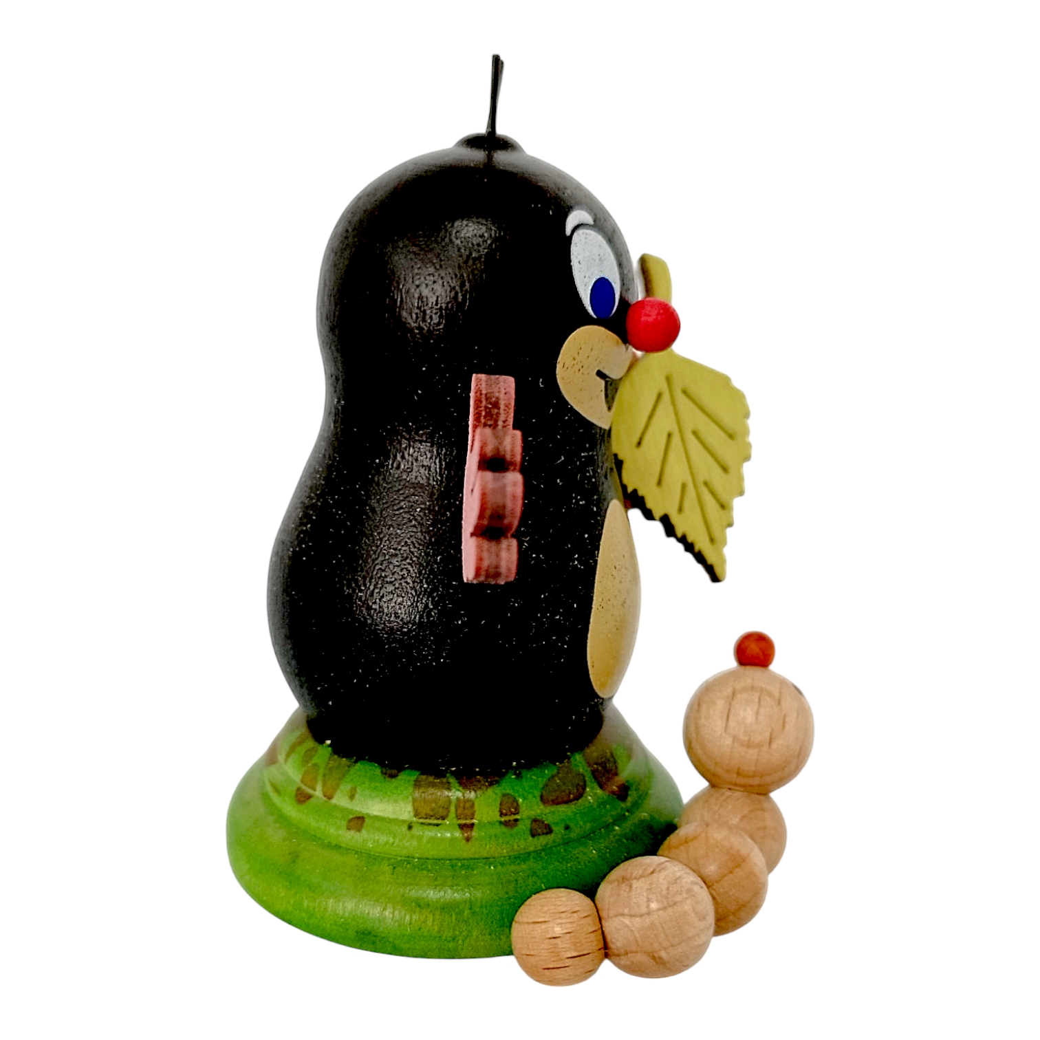 In dieser Ausführung zeigt sich Lene als Naturfreundin, indem sie in ihrer linken Pfote stolz ein filigranes, hellgrünes Birkenblatt hält. Die detaillierten Blattadern und die gezackte Form des Holzblattes setzen einen natürlichen, farbenfrohen Akzent und ergänzen das dunkle Holz wunderbar. Zu Lenes Füßen, auf dem grasgrün lasierten Sockel, der einen kleinen Erdhügel symbolisiert, räkelt sich eine niedliche, aus hellen Holzkugeln gefertigte Raupe mit einer kleinen roten Nase. Die Verwendung hochwertiger, zertifizierter Hölzer sowie speichelechter Farben unterstreicht dabei die Wertigkeit dieses Begleiters.