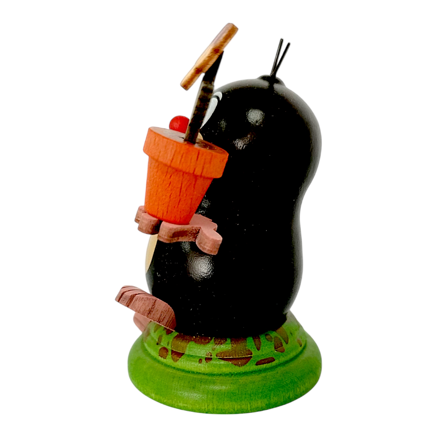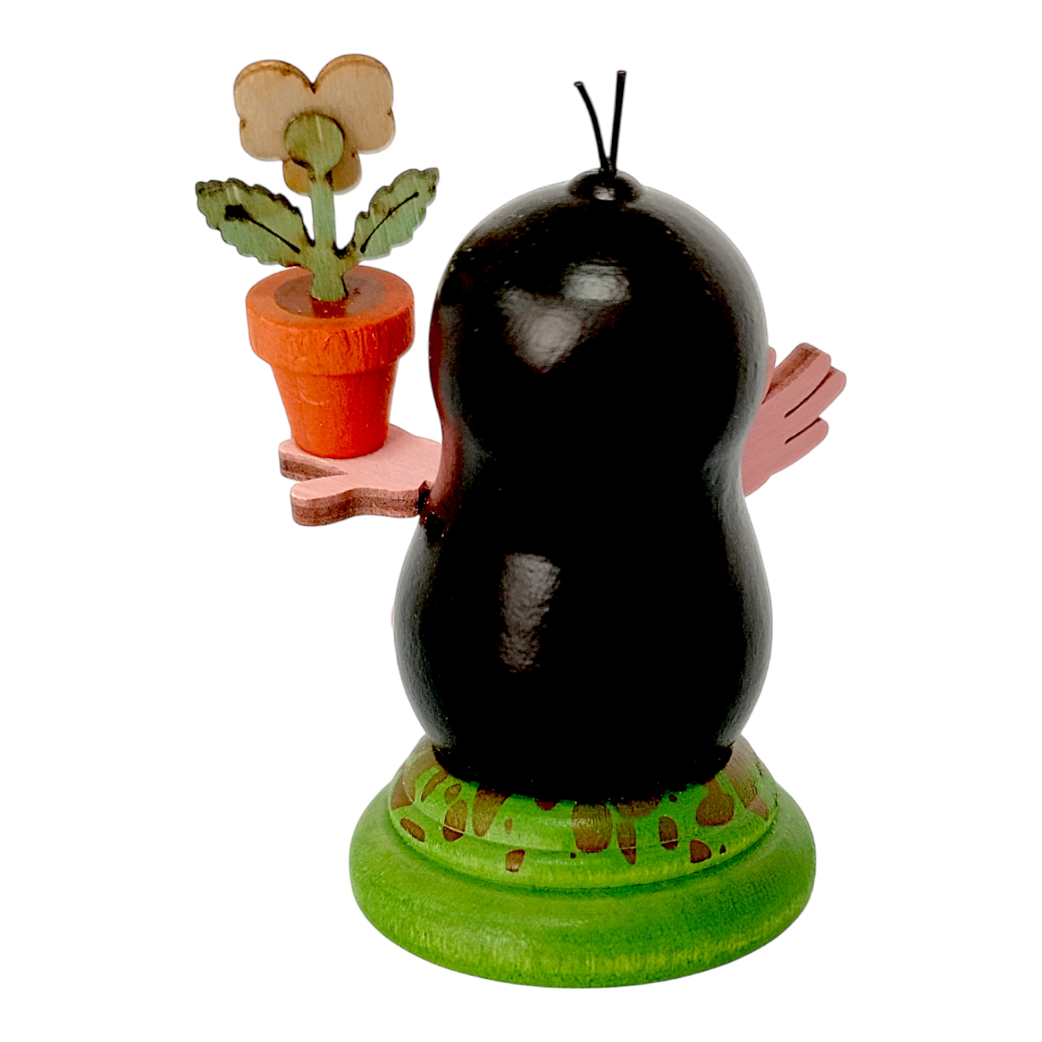 In dieser Ausführung widmet sich Lilli der Gartenarbeit, indem sie in ihrer linken Pfote stolz einen orangefarbenen Tontopf präsentiert. Darin blüht ein fein gearbeitetes Stiefmütterchen, dessen violett-gelbe Blütenblätter farbenfrohe Akzente setzen und das dunkle Holz wunderbar ergänzen. Lilli steht fest auf einem grasgrün lasierten Sockel, der einen kleinen Erdhügel symbolisiert und einen sicheren Stand bietet. Die Verwendung hochwertiger, zertifizierter Hölzer sowie speichelechter Farben unterstreicht dabei die Wertigkeit dieses Begleiters.