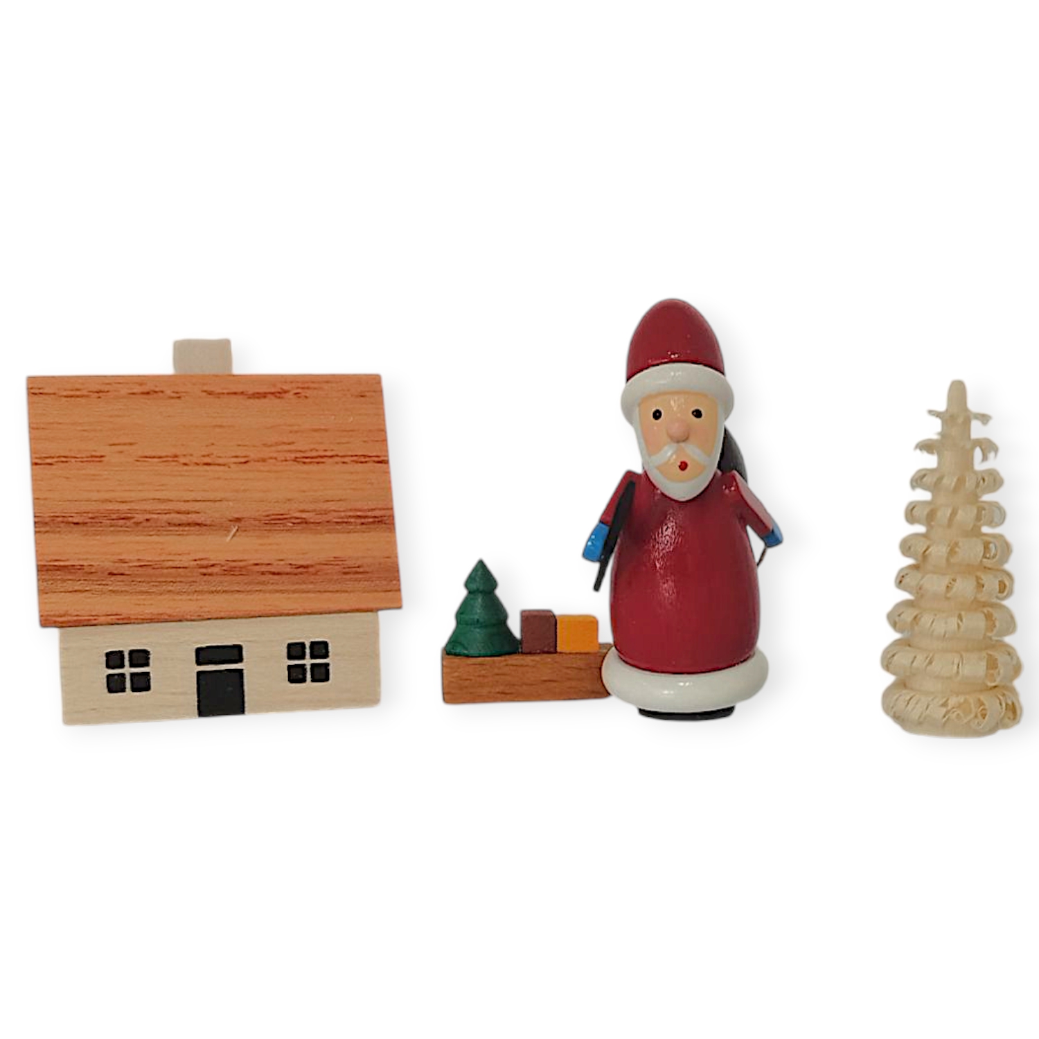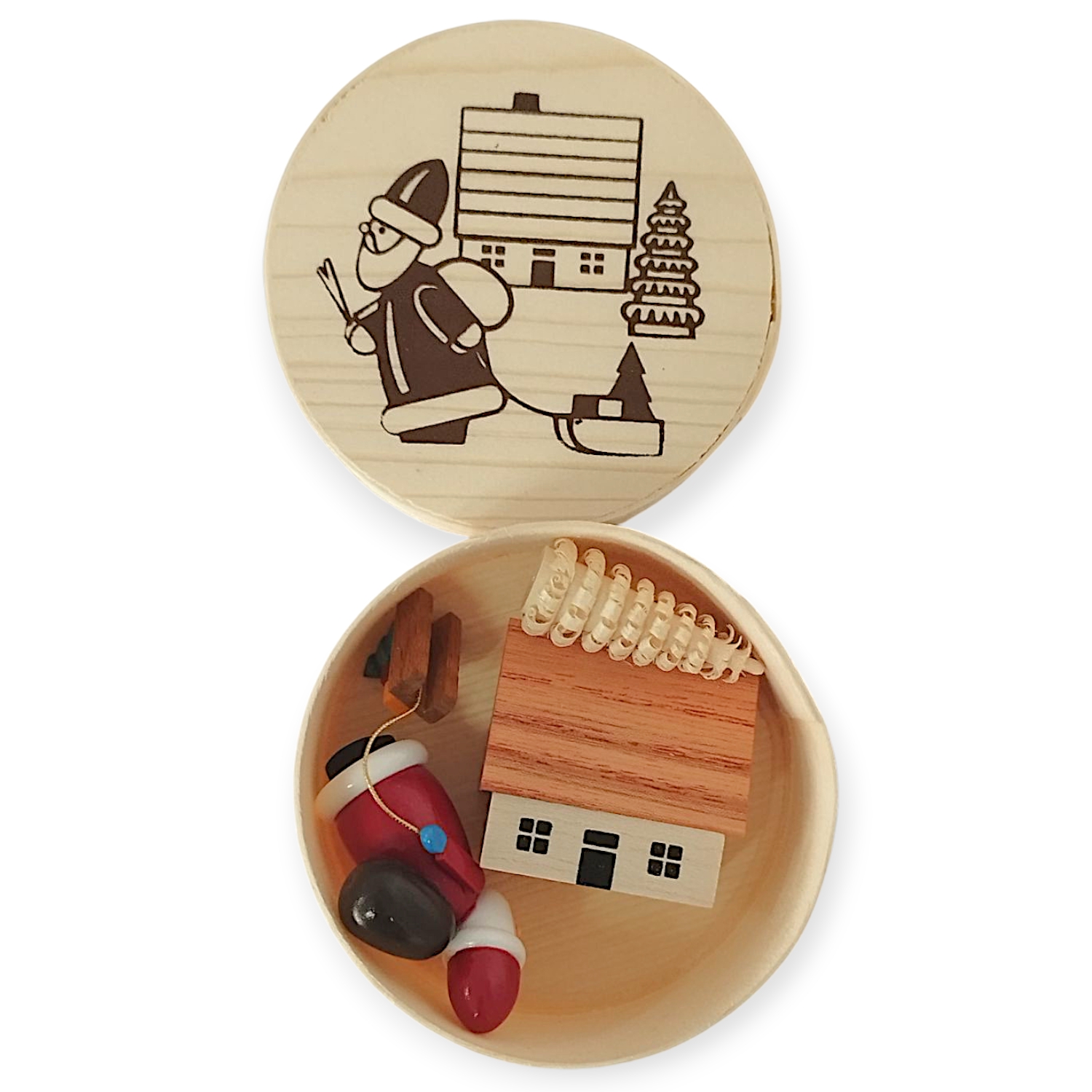 Jede einzelne Holzfigur wurde präzise von Hand gearbeitet. Die Spandose aus hellem Holz dient als dekorative Verpackung und als Kulisse für die kleine Weihnachtswelt. Das Motiv auf dem Deckel zeigt den Nikolaus beim Geschenkebringen vor einem stilisierten Haus und einer Tanne. Durch Öffnen der Dose werden die Miniaturen sichtbar und laden zum Arrangieren und Staunen ein.