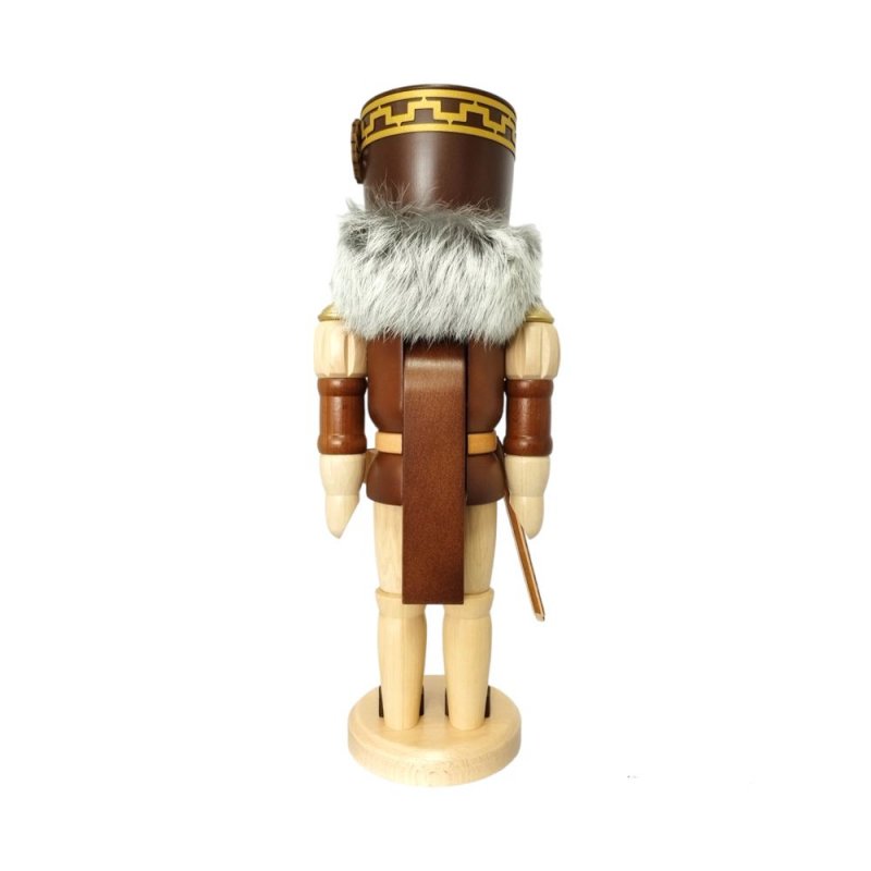 Der Bergmann präsentiert sich in einer imposanten, aufrechten Haltung, als würde er gerade zum militärischen Gruß stillgestanden haben. Seine robusten braunen Stiefel geben ihm auf dem kleinen Podest einen festen und stabilen Stand. Die gesamte Farbgebung des Nussknackers ist harmonisch auf natürliche Erdtöne abgestimmt, was seinen rustikalen Charme zusätzlich betont. Doch trotz dieser gedeckten Farbpalette besticht er durch seine reich verzierte Uniform und den markanten Hut, die ihm eine beeindruckende und zugleich würdevolle Erscheinung verleihen und ihn somit zu einem echten Blickfang machen.