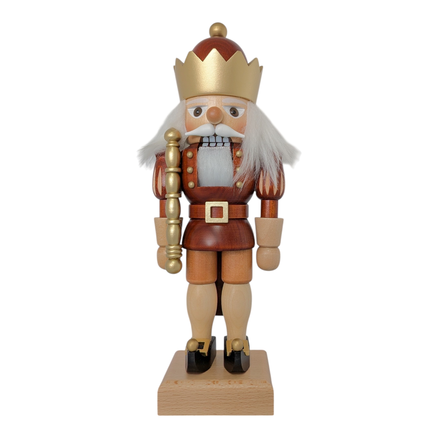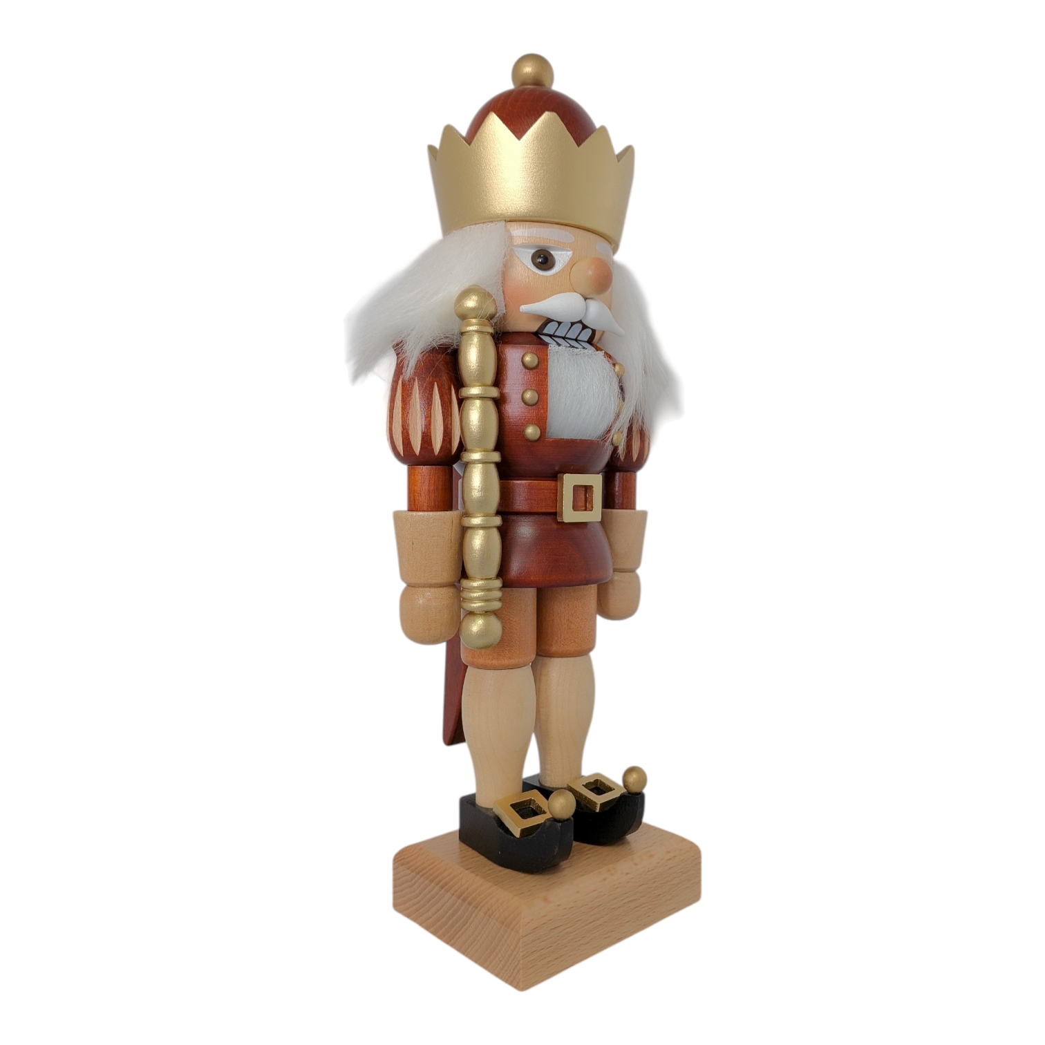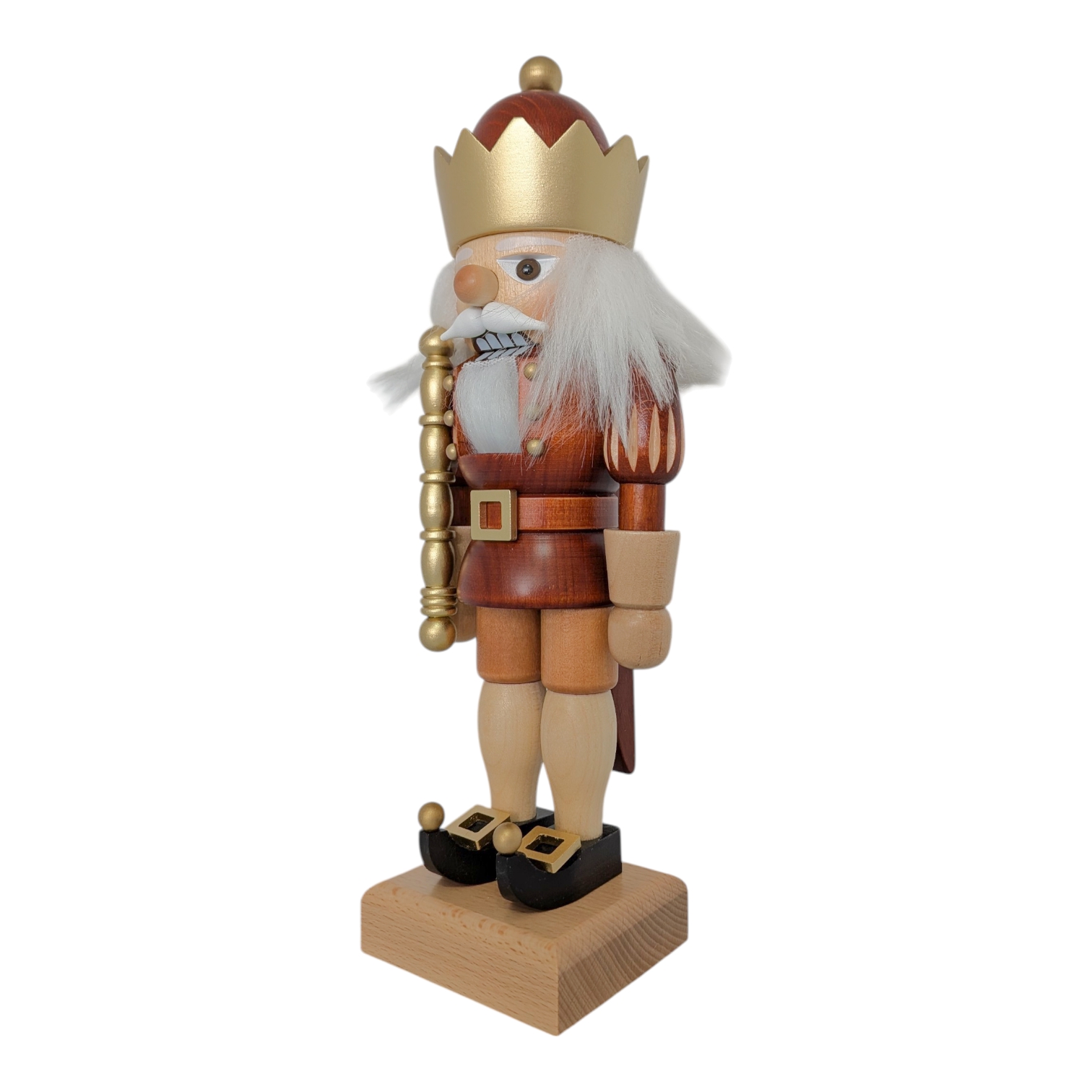 Der gesamte Nussknacker steht fest auf einem schlichten, naturbelassenen Holzsockel, der die warmen Erdtöne der Figur harmonisch aufgreift. Die Farbpalette aus Rotbraun, Natur und Gold wirkt festlich, edel und dabei niemals überladen. Dieser König passt perfekt auf eine Fensterbank, ein Regal oder in die Mitte eines festlich gedeckten Tisches – und zieht dabei garantiert alle Blicke auf sich. Er ist nicht nur eine Dekofigur, sondern ein echtes Statement für alle Liebhaber hochwertiger erzgebirgischer Holzkunst.