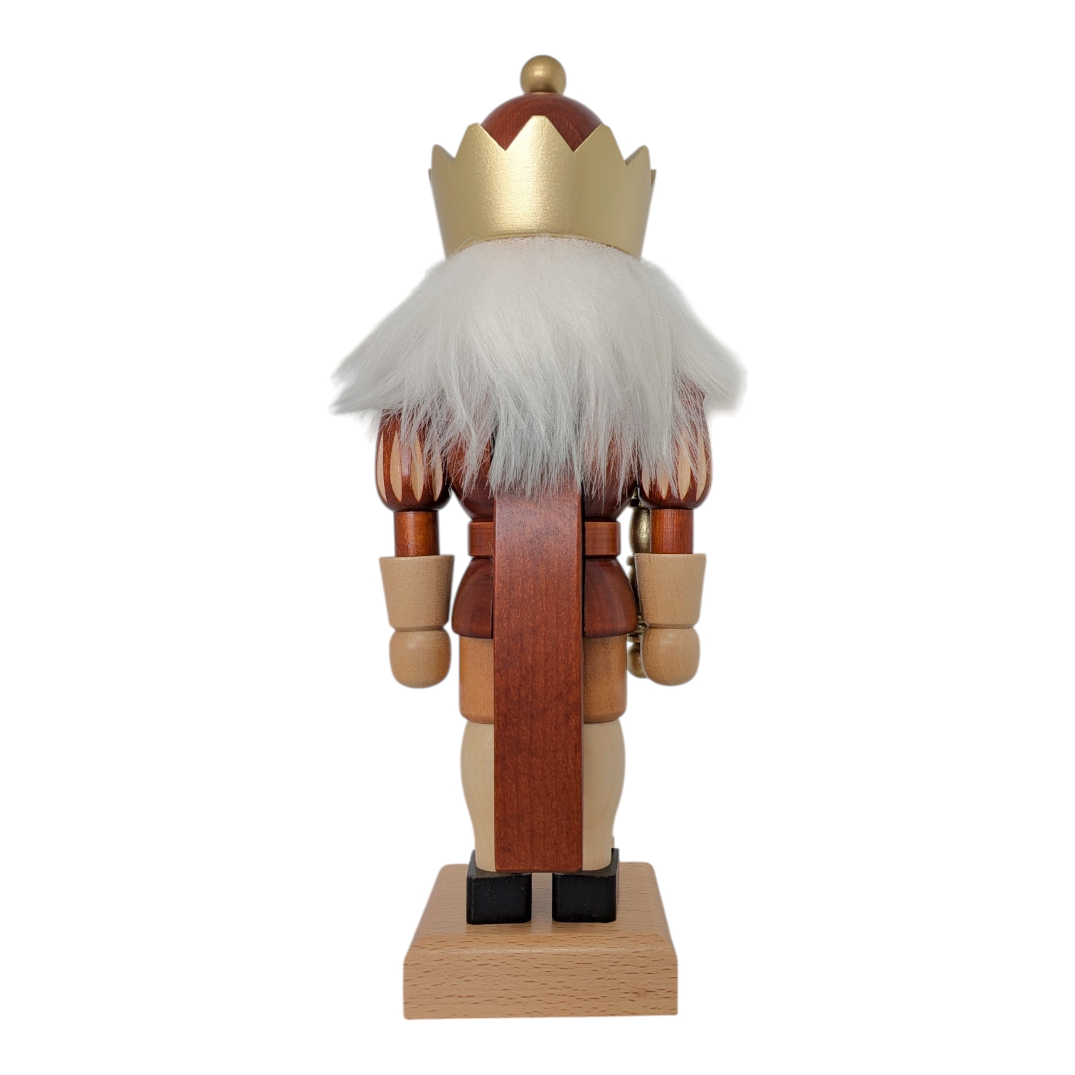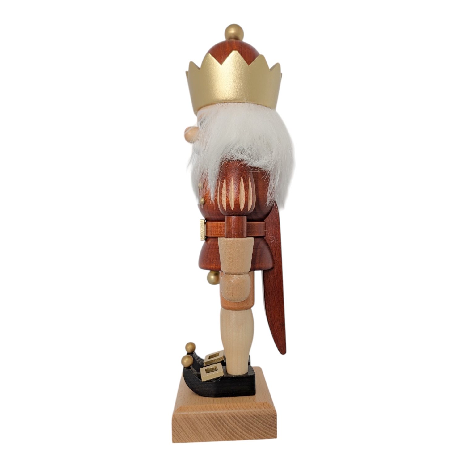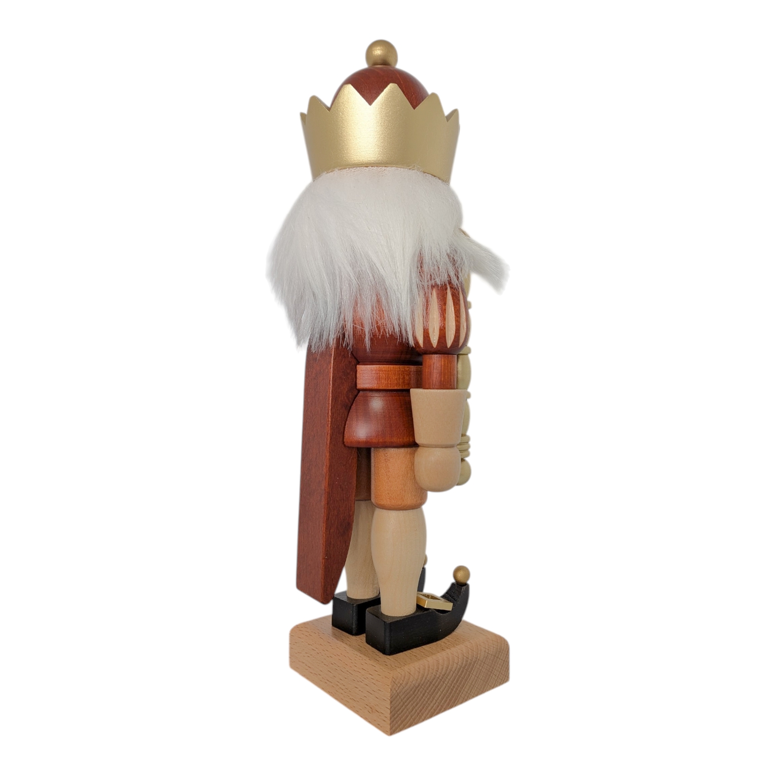 Der gesamte Nussknacker steht fest auf einem schlichten, naturbelassenen Holzsockel, der die warmen Erdtöne der Figur harmonisch aufgreift. Die Farbpalette aus Rotbraun, Natur und Gold wirkt festlich, edel und dabei niemals überladen. Dieser König passt perfekt auf eine Fensterbank, ein Regal oder in die Mitte eines festlich gedeckten Tisches – und zieht dabei garantiert alle Blicke auf sich. Er ist nicht nur eine Dekofigur, sondern ein echtes Statement für alle Liebhaber hochwertiger erzgebirgischer Holzkunst.