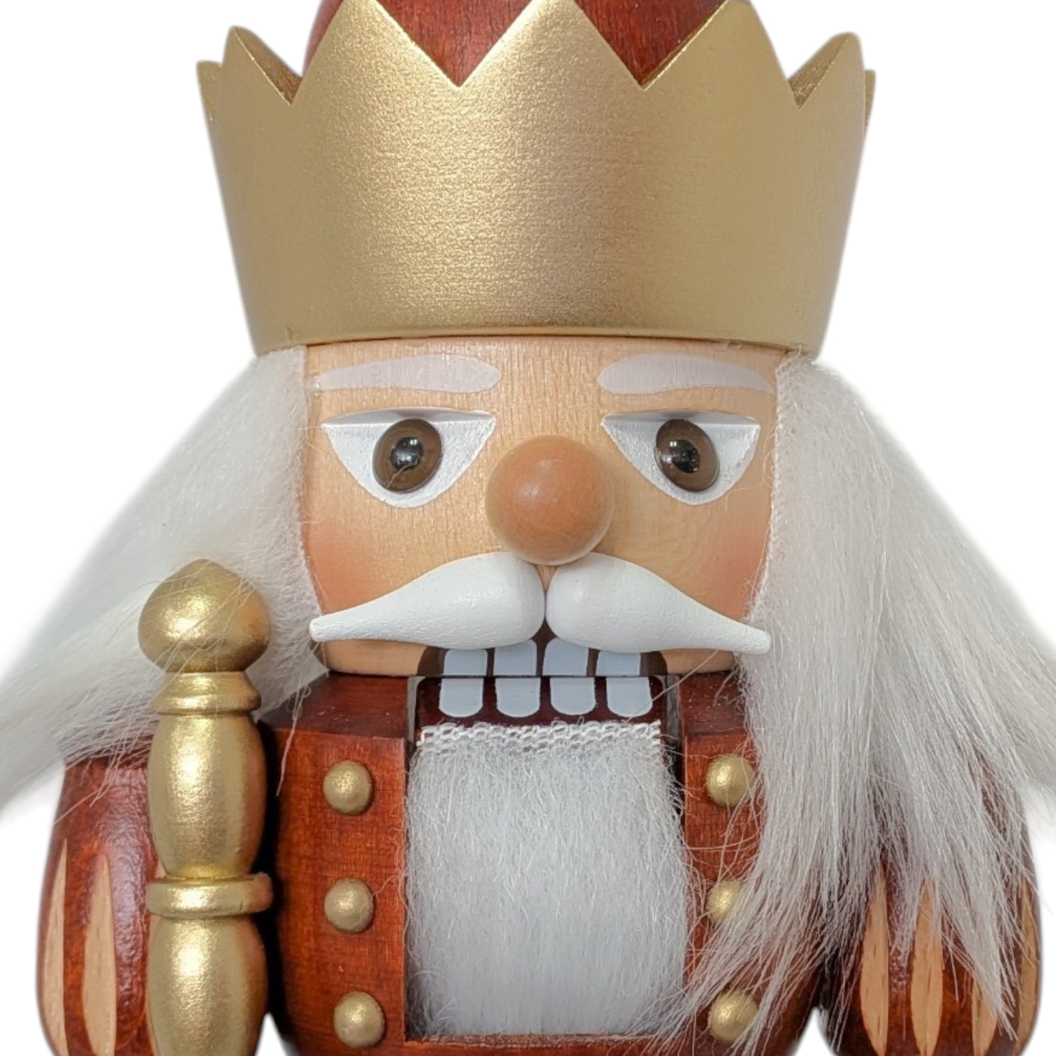Sein Gesicht ist ausdrucksstark und bestimmt. Die wachen Augen schauen aufmerksam geradeaus, der weiße Schnurrbart und der volle, weiße Bart verleihen ihm das Ansehen eines weisen Herrschers. Der Mund ist klassisch geöffnet, die Zähne sichtbar – eben ein echter Nussknacker, der konzentriert und würdevoll wirkt.