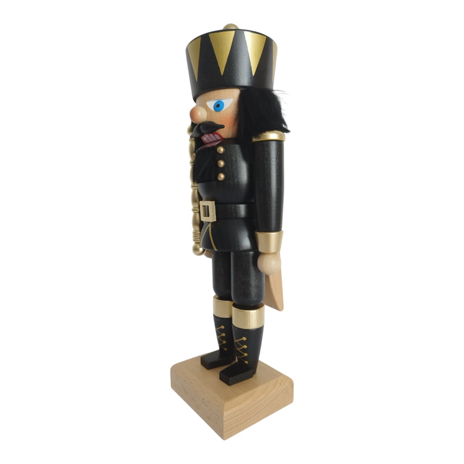 In seiner Hand hält er ein majestätisches goldenes Zepter, das seine königliche Autorität symbolisiert. Seine Krone, ebenfalls schwarz mit goldenen Verzierungen, sitzt stolz auf seinem Haupt. Sein Gesicht trägt den typisch grimmigen Ausdruck eines Nussknackers, mit seinen blauen Augen, der knolligen Nase und den rosigen Wangen. Ein stolzer schwarzer Schnurrbart betont seine königliche Würde.