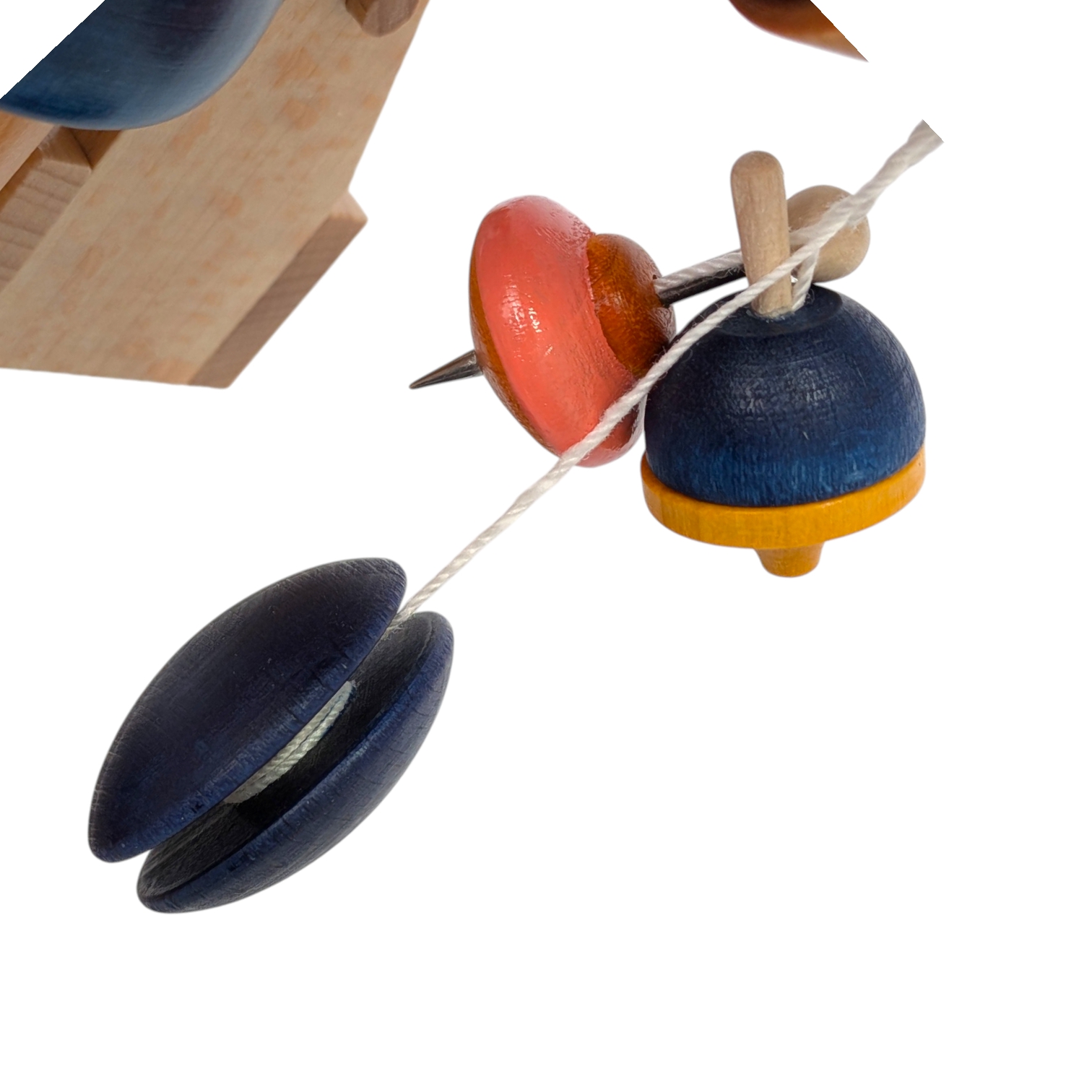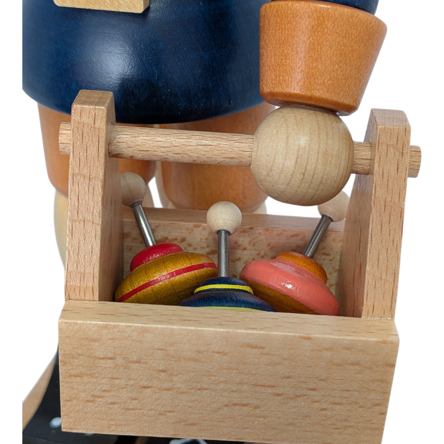 Und die trägt er gleich mit sich: In der einen Hand schwingt ein Faden mit einem kleinen Kreisel sowie einem dunkelblauen Jo-Jo, in der anderen hält er einen Holzkorb voller bunter Kreisel in Rot, Gelb sowie Orange. Jedes einzelne Stück ist winzig klein und doch perfekt gearbeitet – genau wie man es von einem echten Meister seines Faches erwartet.