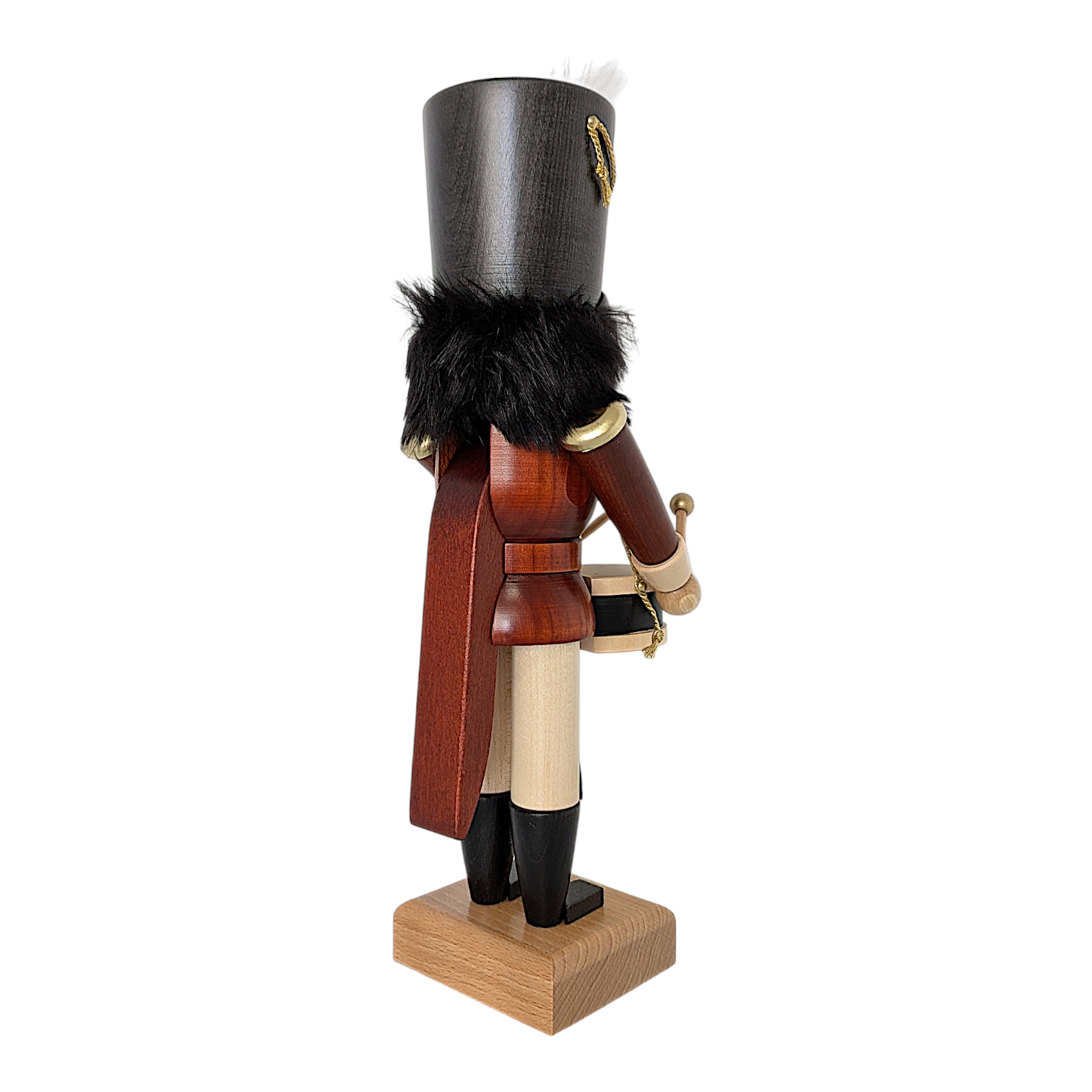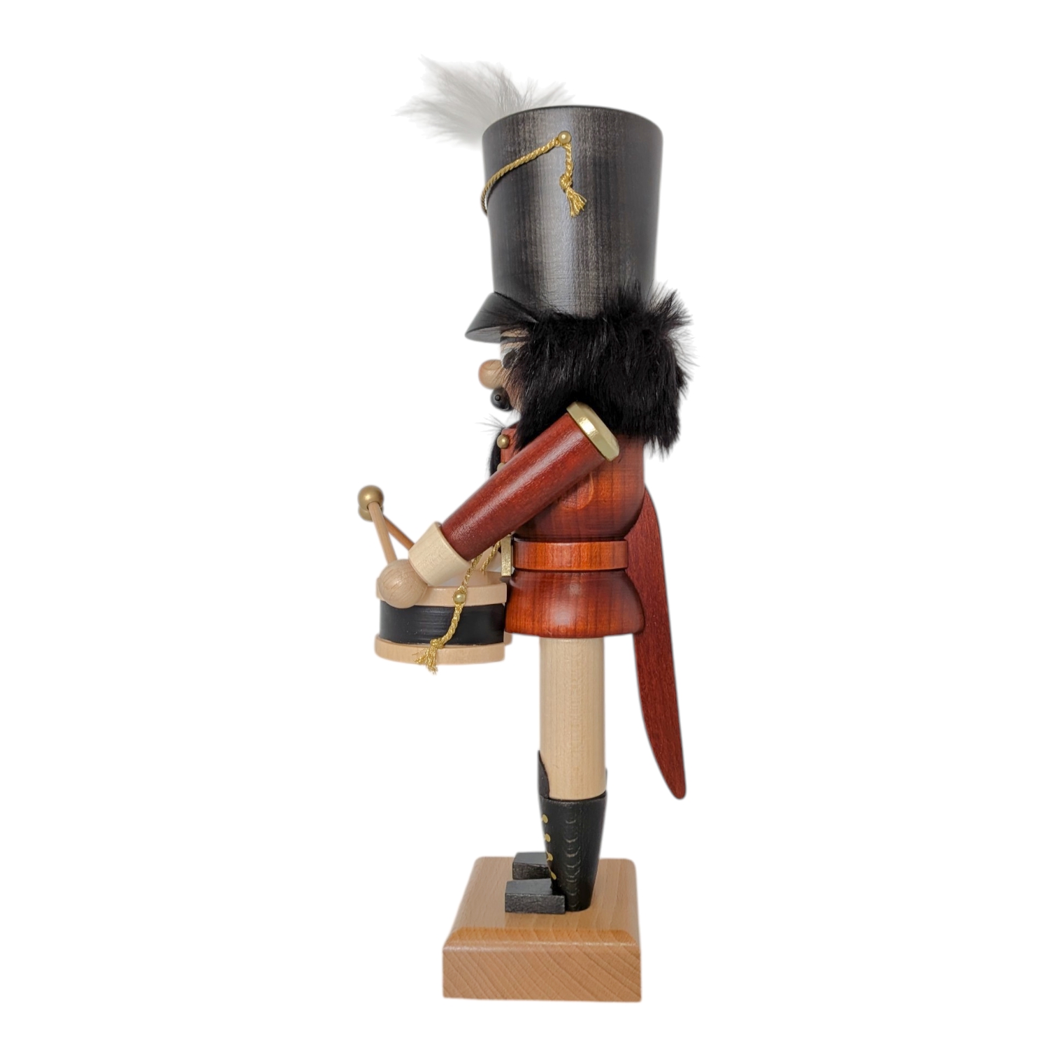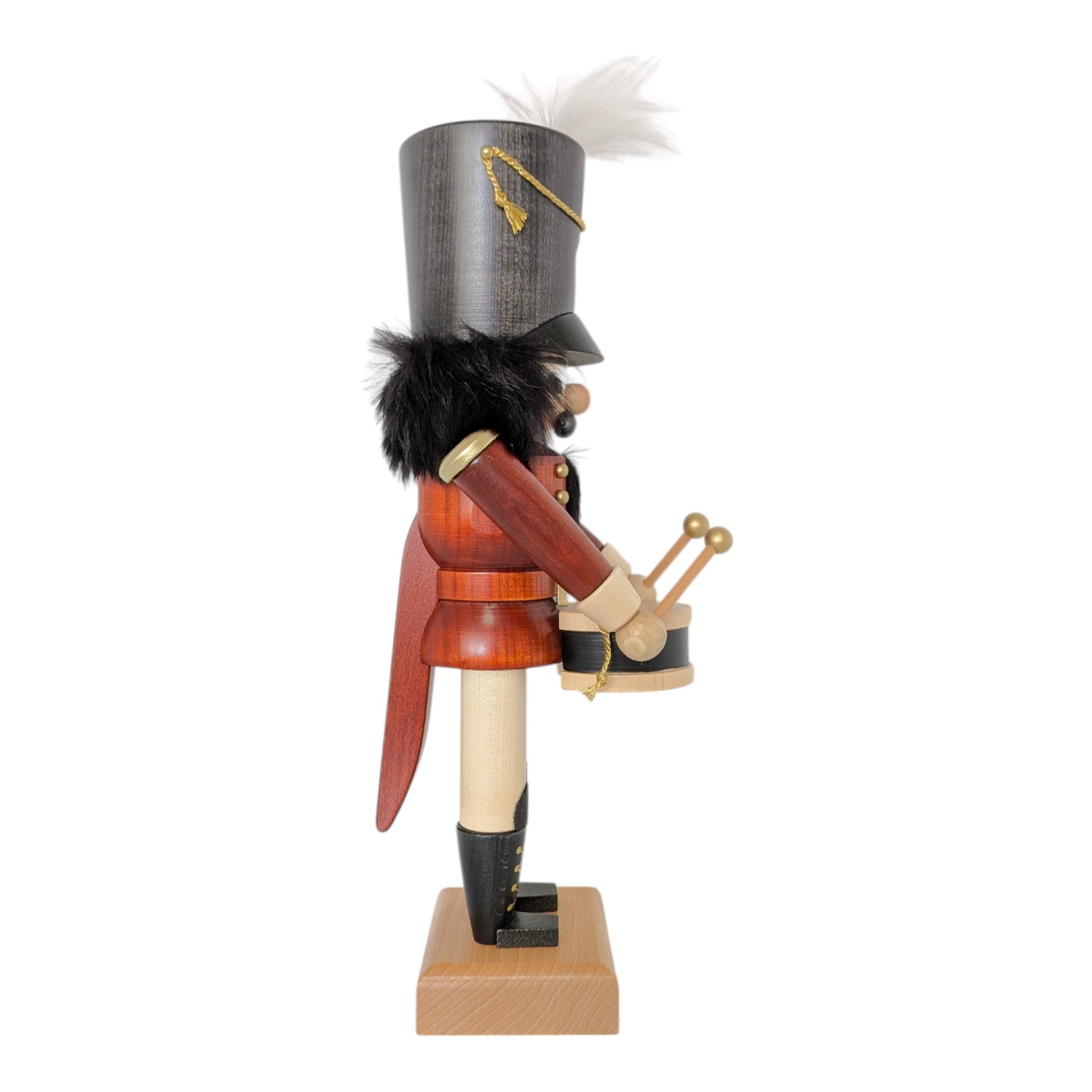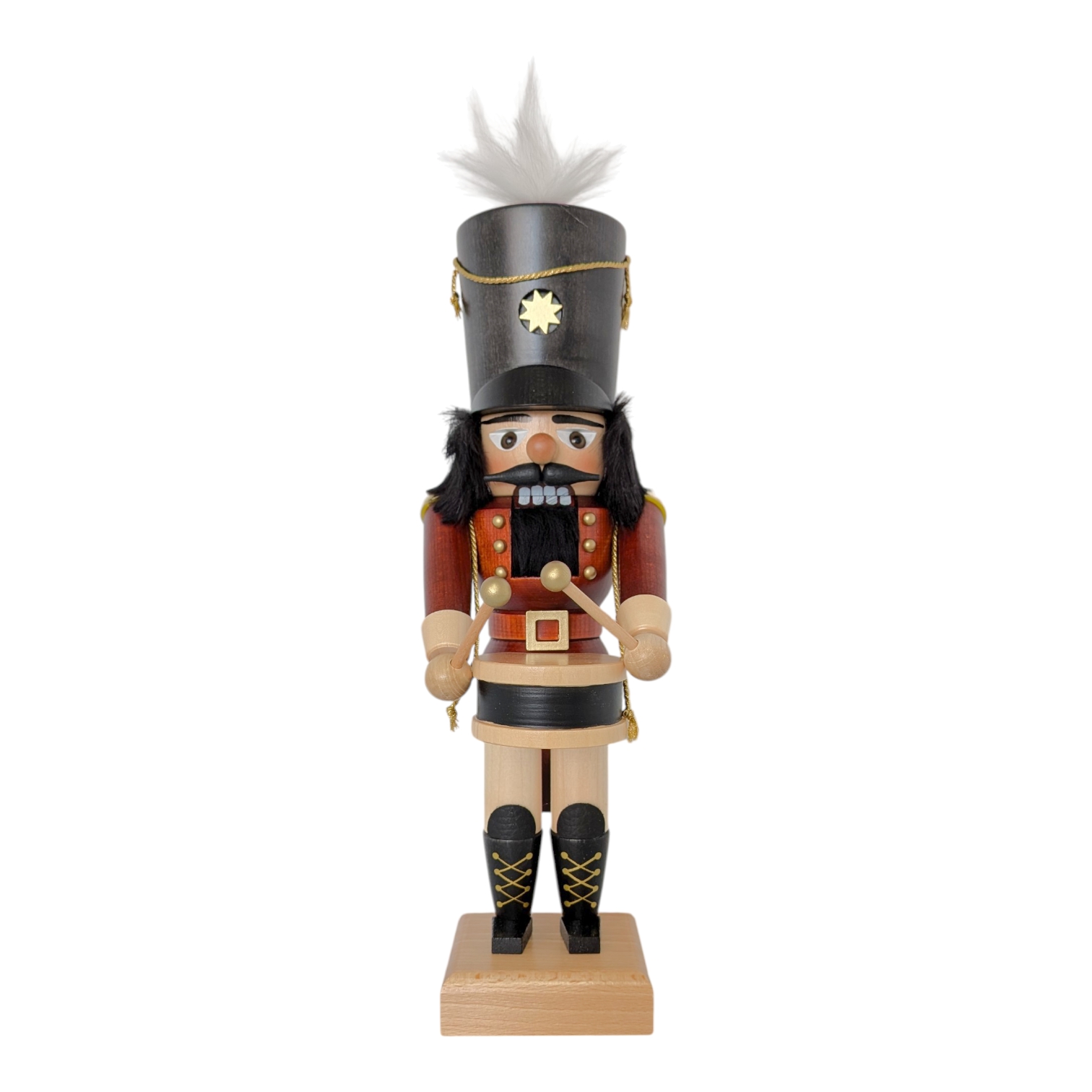 In vorderster Reihe marschierend schwingt er seine beiden Trommelschlägel mit goldenen Kugelköpfen über die schwarz-naturhelle Trommel, die an einem goldenen Kordeltragegurt hängt. Den imposanten dunkelgrauen Tschako – verziert mit einem goldenen Stern, einer goldenen Kordel mit Quaste sowie einer wehenden weißen Feder – trägt er mit stolzer Haltung. Der gesamte Nussknacker steht fest auf einem schlichten, naturbelassenen Holzsockel und ist ein ideales Geschenk für alle Liebhaber hochwertiger erzgebirgischer Holzkunst.