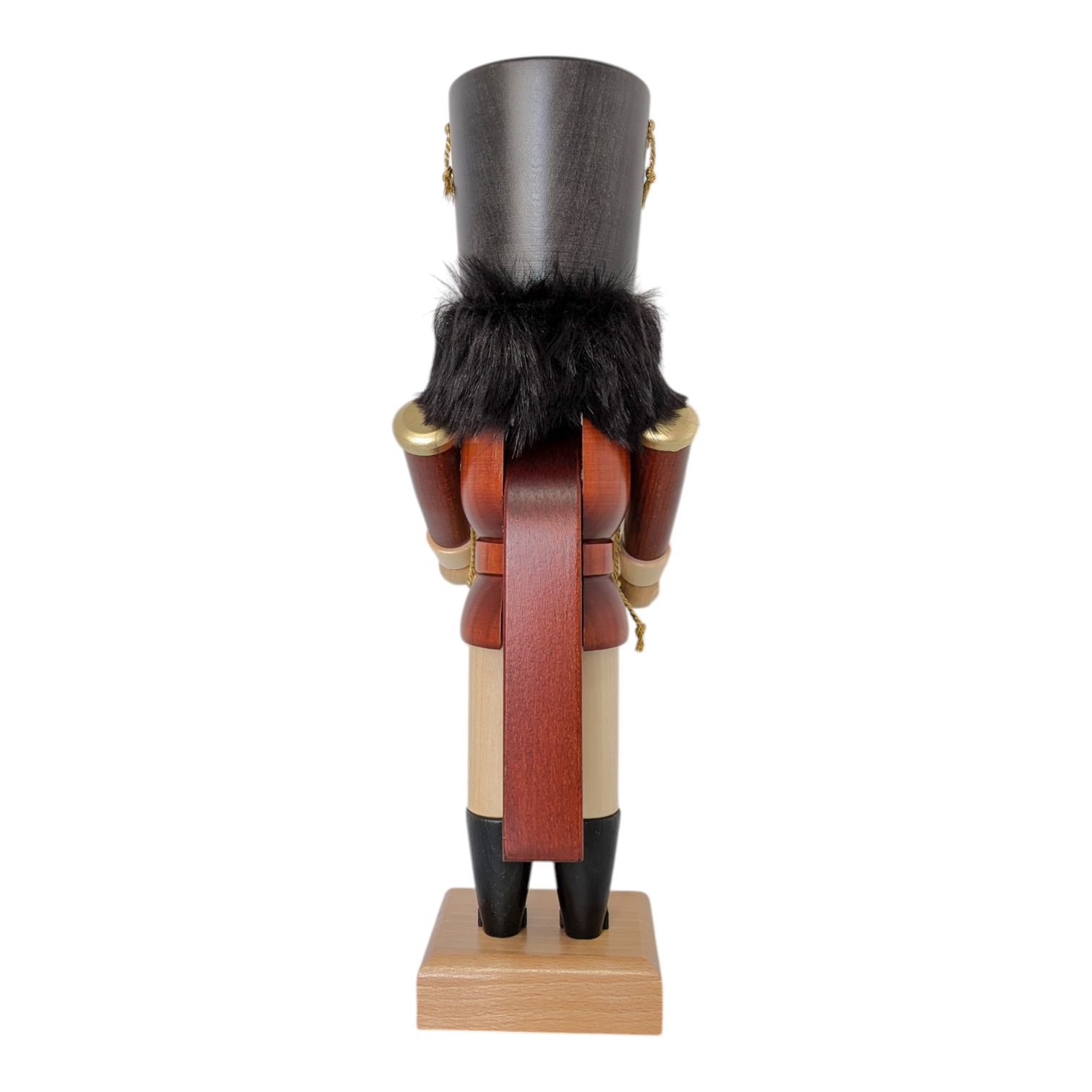 Sein Körper steckt in einer rotbraunen Uniformjacke aus naturbelassenem Holz, die mit goldenen Knöpfen und einem goldenen Schulterdekor verziert ist. Ein goldener Gürtel mit eckiger Schnalle umschließt seine Mitte, darunter folgen naturhelle Kniebundhosen sowie kniehohe, schwarz-naturbelassene Stiefel mit charakteristischen goldenen Schnürsenkeln – ein echter Parademarschläufer.