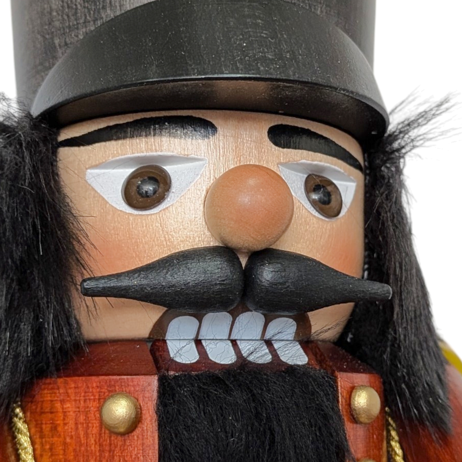 Sein Gesicht ist ausdrucksstark und konzentriert. Die wachen Augen blicken aufmerksam geradeaus, der markante schwarze Schnurrbart und der volle, schwarze Bart verleihen ihm das Ansehen eines erfahrenen Soldaten. Der Mund ist klassisch geöffnet, die Zähne sichtbar – eben ein echter Nussknacker, der seinen Dienst ernst nimmt.