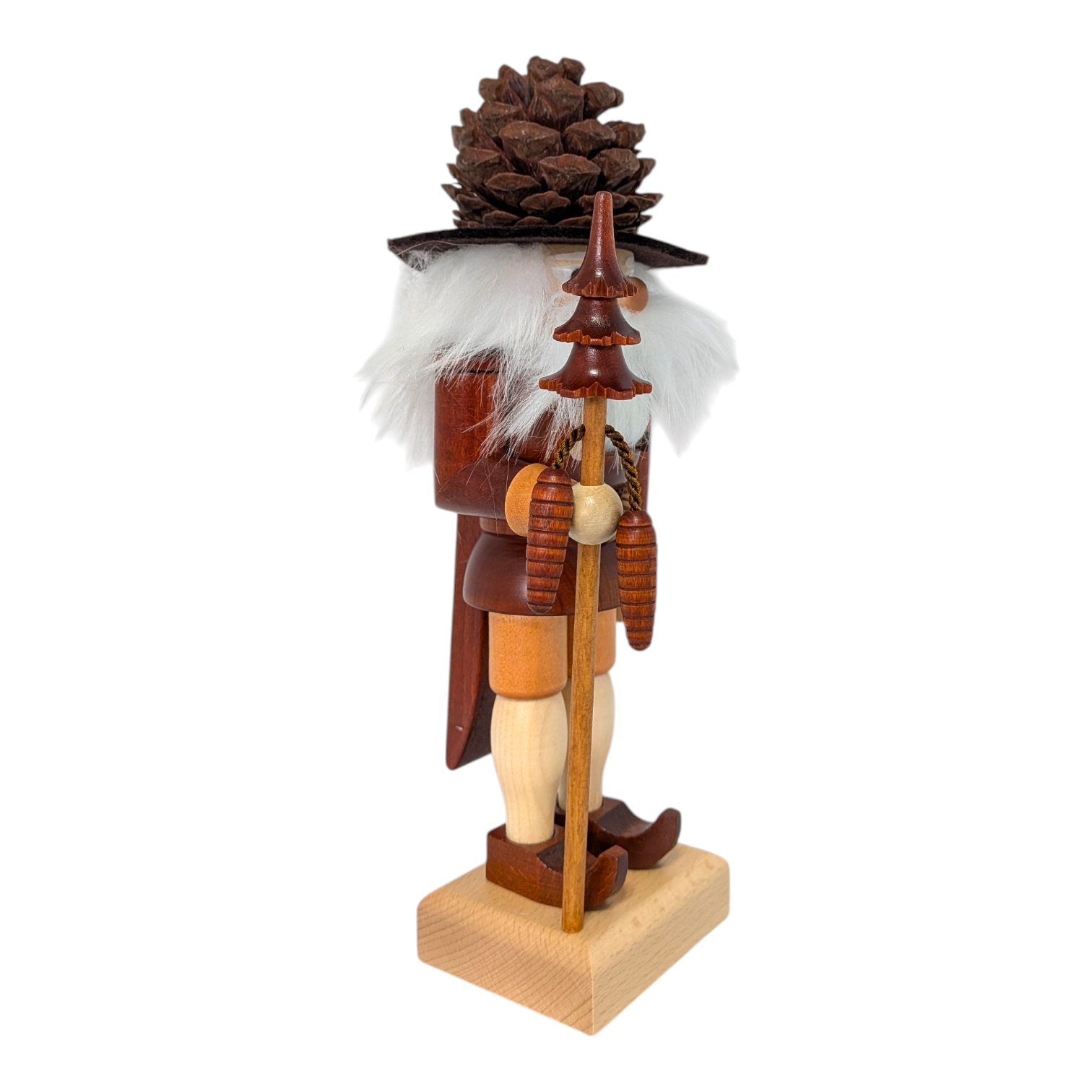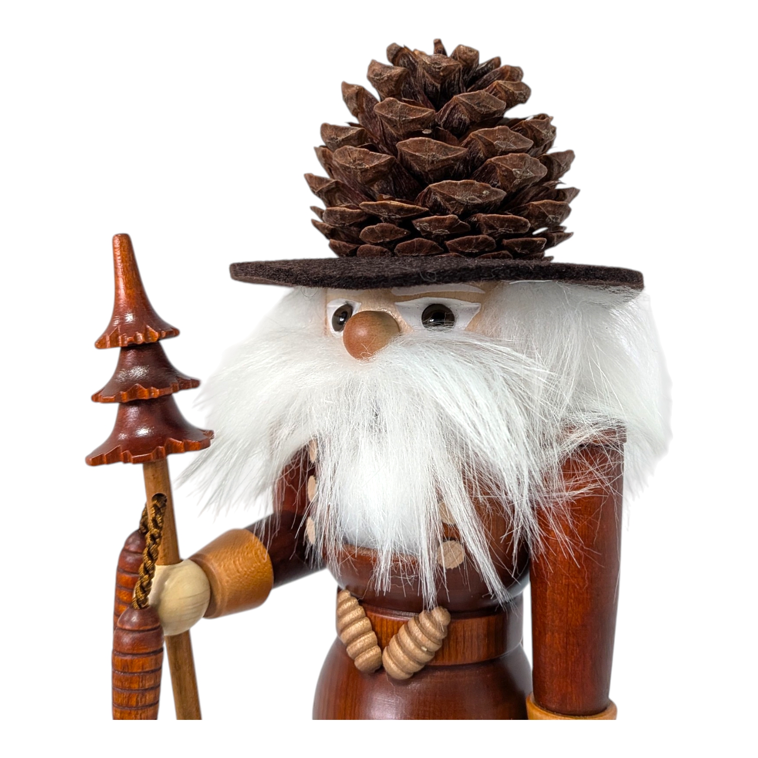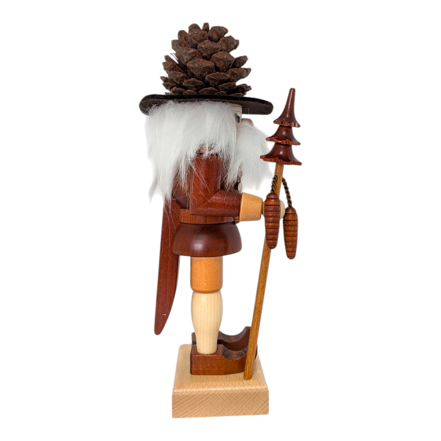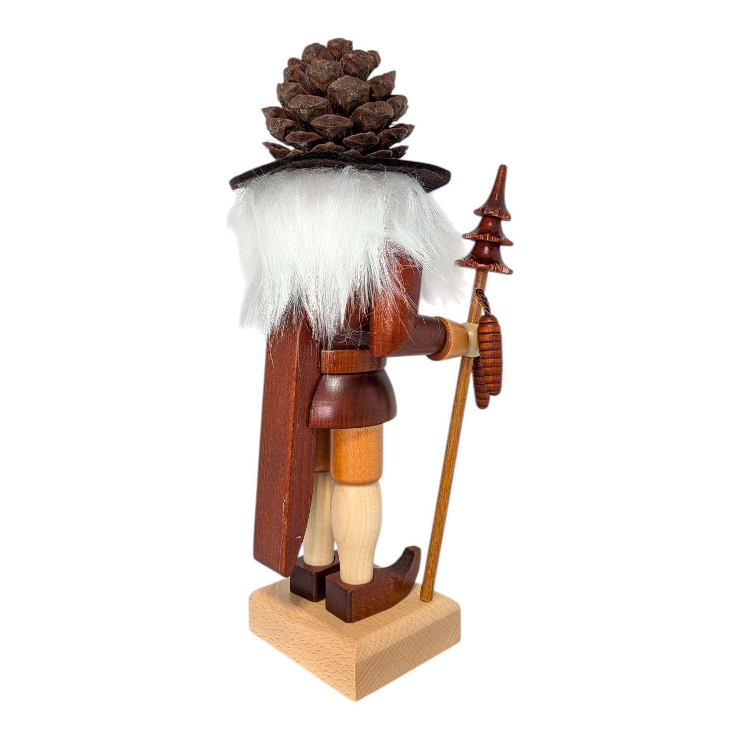 Besonders schön: In der rechten Hand hält er einen langen Stab, an dem ein gedrechselter Tannenzapfen hängt – fein gearbeitet und liebevoll im Detail. Oben auf dem Stab sitzt ein kleiner Weihnachtsbaum, ebenfalls aus Holz gedrechselt. Nichts wackelt, nichts fällt ab – hier stimmt jedes Detail.